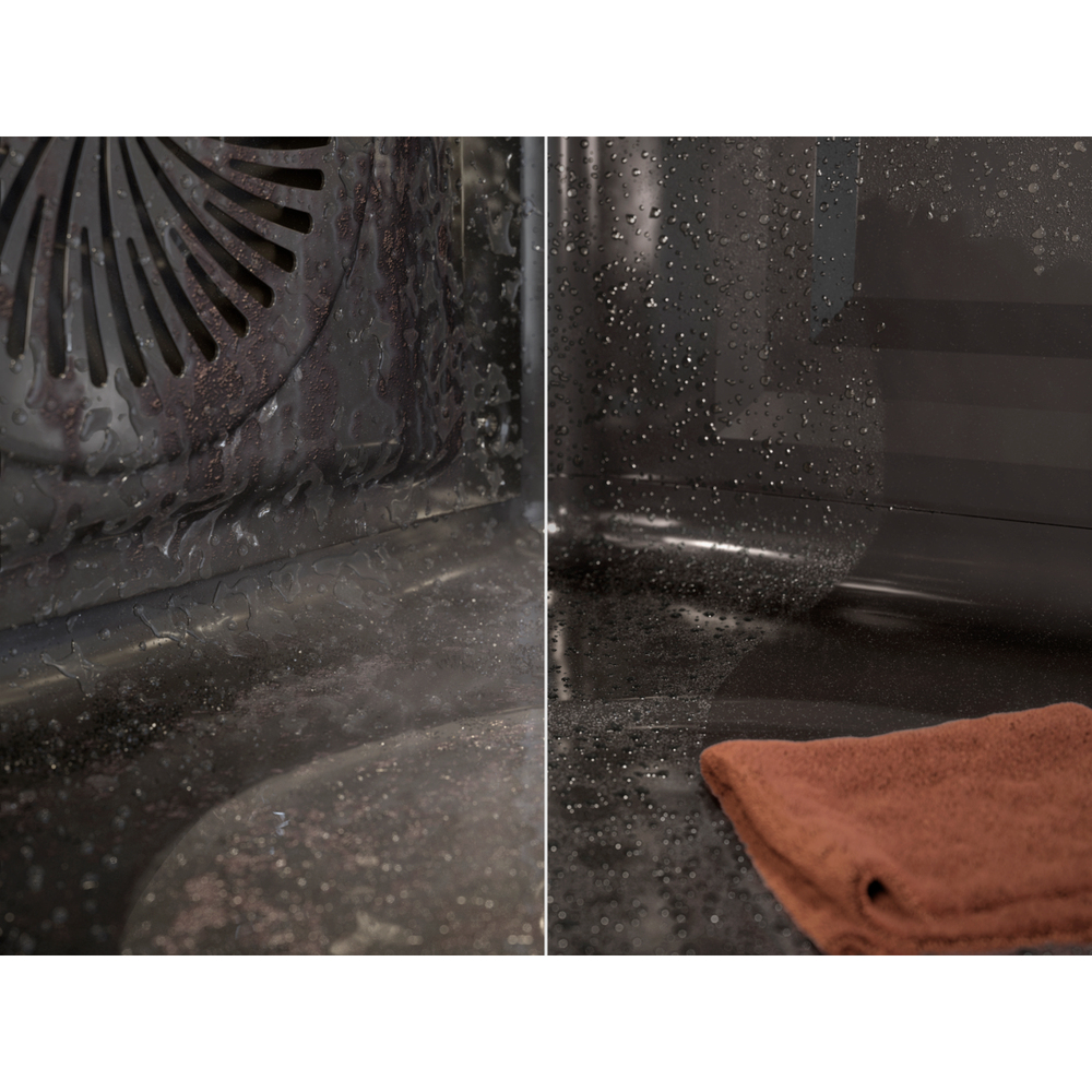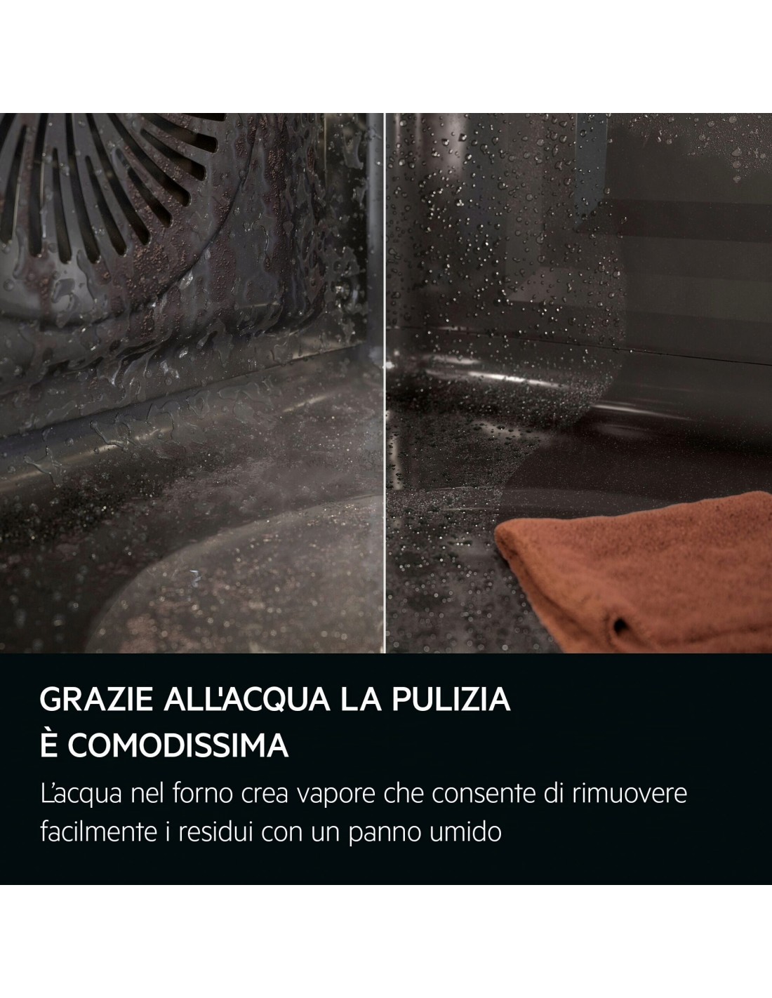 Pulisci il tuo forno in modo naturale e semplice con Aqua Cleaning. L'aggiunta di acqua nel forno crea vapore per sciogliere i residui ostinati rimasti sulla superficie, consentendo di rimuoverli facilmente con un panno umido.