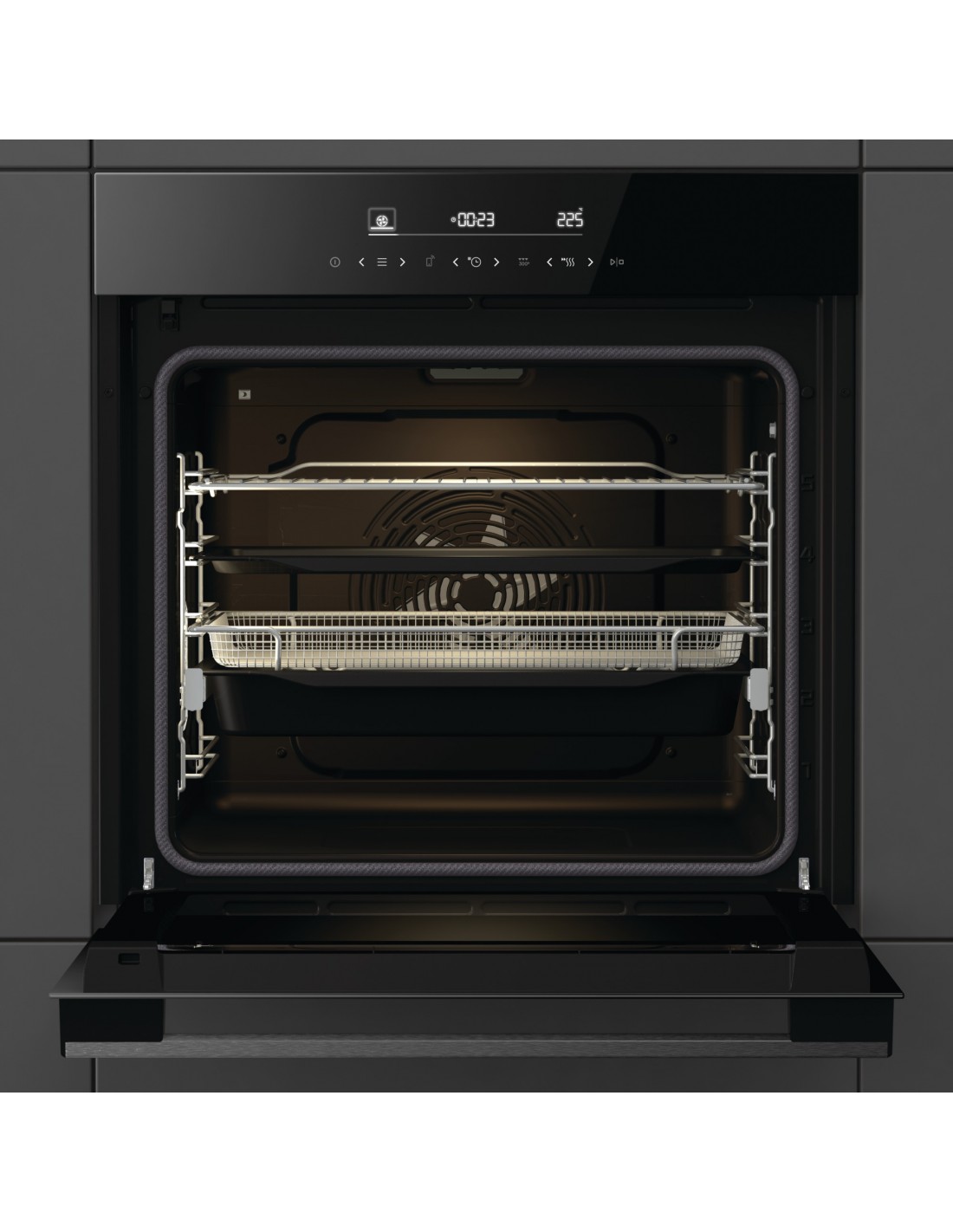 La cavità da ben 77 litri è tra le più grandi del mercato e permette di cucinare pietanze di grandi dimensioni e soprattutto di sfruttare in combinazione con la termo ventilazione, la cottura simultanea multilivello.