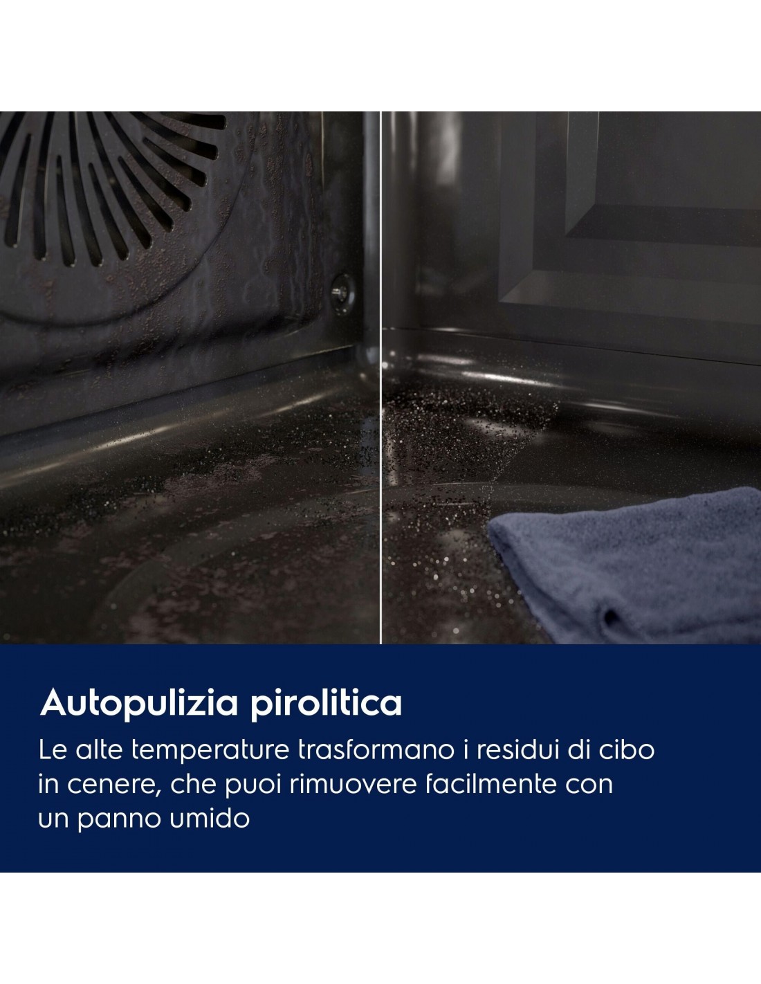 Grazie alle alte temperature, la funzione di pulizia pirolitica trasforma in cenere i residui di grasso e di cibo, che possono essere facilmente eliminati con un panno umido.