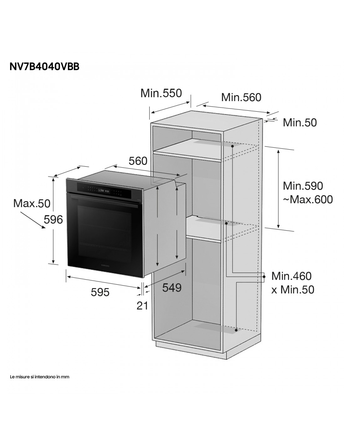 Forno elettrico Samsung NV7B4040VBB/U5. Misura (LxPxA) 60 cm x 57 cm x 60 cm. Capacità interna forno totale 76 L. Con Grill. Autopulizia Catalitico. Range del termostato del forno 30 - 270 °C.