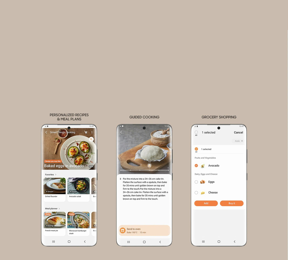 Rendi più divertente la tua esperienza in cucina. SmartThings Cooking* ti fa risparmiare tempo e cucinare non sarà più un problema. A seconda delle tue esigenze, ti consiglia ricette** personalizzate e crea un menu settimanale. Inoltre, ti guida nella preparazione dei pasti e nell’organizzazione della spesa***. * Richiede una rete wireless, un account Samsung e l’app Samsung SmartThings. L’app Samsung SmartThings supporta il sistema operativo Android 8.0 (Oreo) o versioni successive, ottimizzate per gli smartphone Samsung. Questa app supporta anche iOS 13 o versioni successive per iPhone. L’app SmartThings è disponibile in App Store e Play Store.** Disponibile in alcune lingue, tra cui inglese, francese, tedesco, italiano e spagnolo.*** Disponibile solo nel Regno Unito e in Germania. Altri Paesi saranno aggiunti a breve.