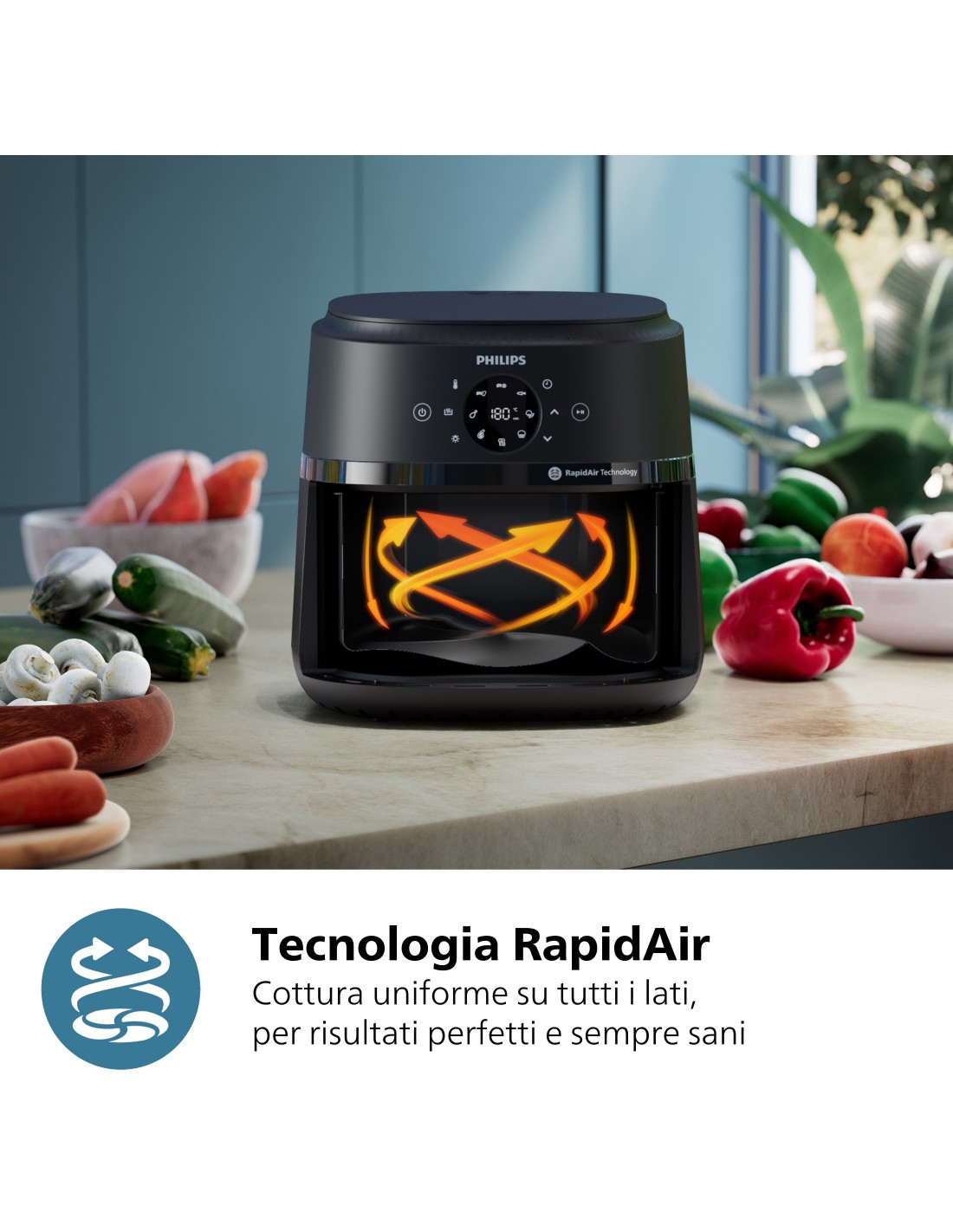 Il design compatto è ideale per ogni cucina, grande o piccola che sia. Il cestello da 6,2L può contenere fino a 800 g di patatine fritte, 8 cosce di pollo o 800 g di verdure.
