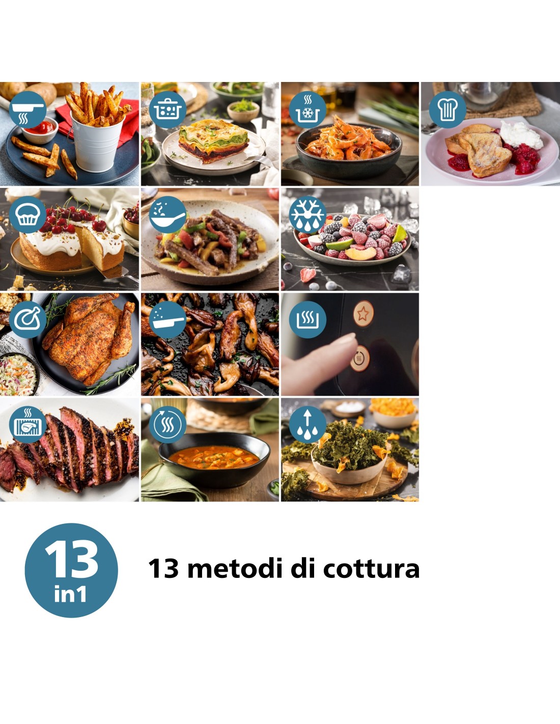 Puoi friggere, cuocere, grigliare, arrostire e non solo. Imposta timer e temperatura manualmente o usa le funzioni preimpostate per sbloccare 13 diversi metodi di cottura sempre disponibili, come ad esempio riscaldare, scongelare e mantenere la temperatura.