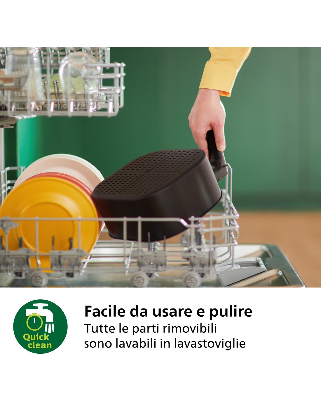 Tutte le parti rimovibili sono lavabili in lavastoviglie. Il cestello QuickClean di Airfryer è dotato di un rivestimento antiaderente facile da pulire. Inoltre, grazie alla frittura ad aria, nella tua casa non si diffonderanno gli odori tipici della frittura tradizionale.