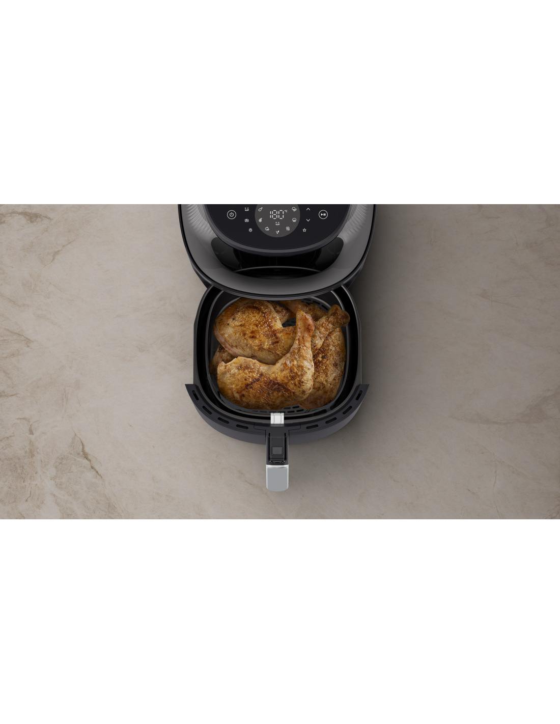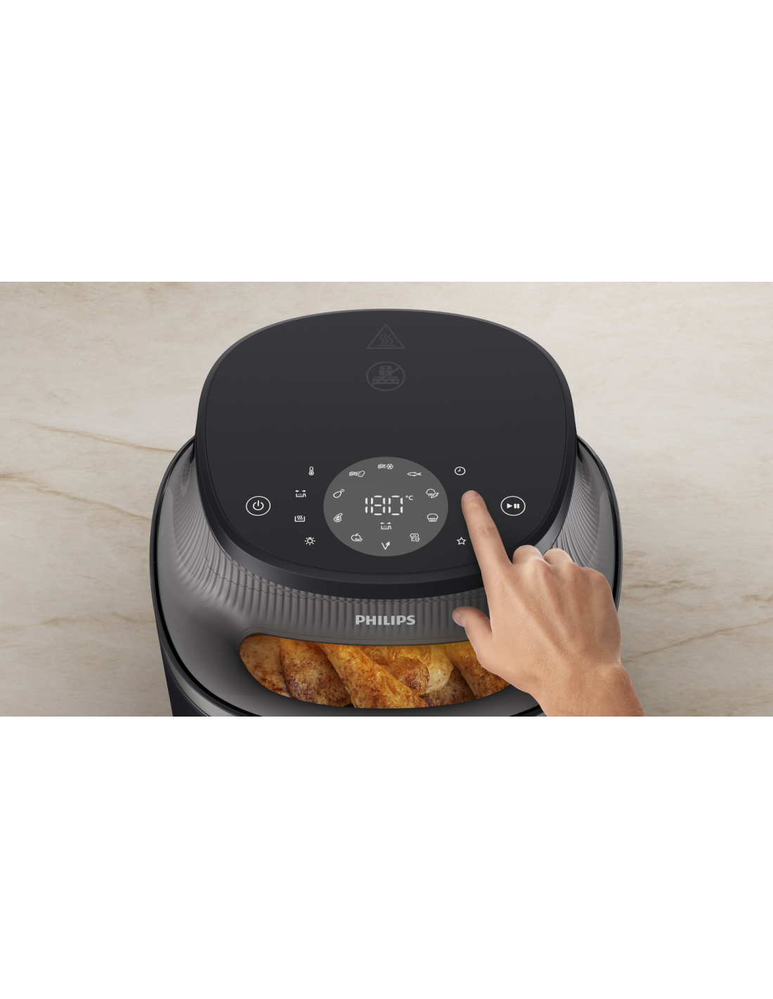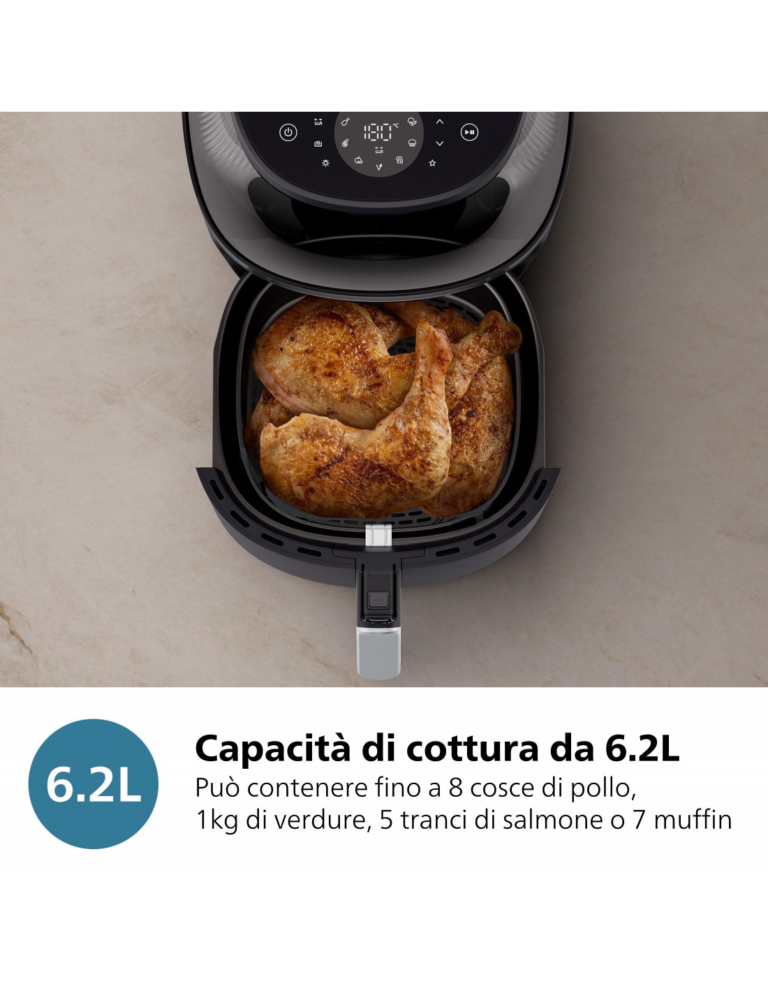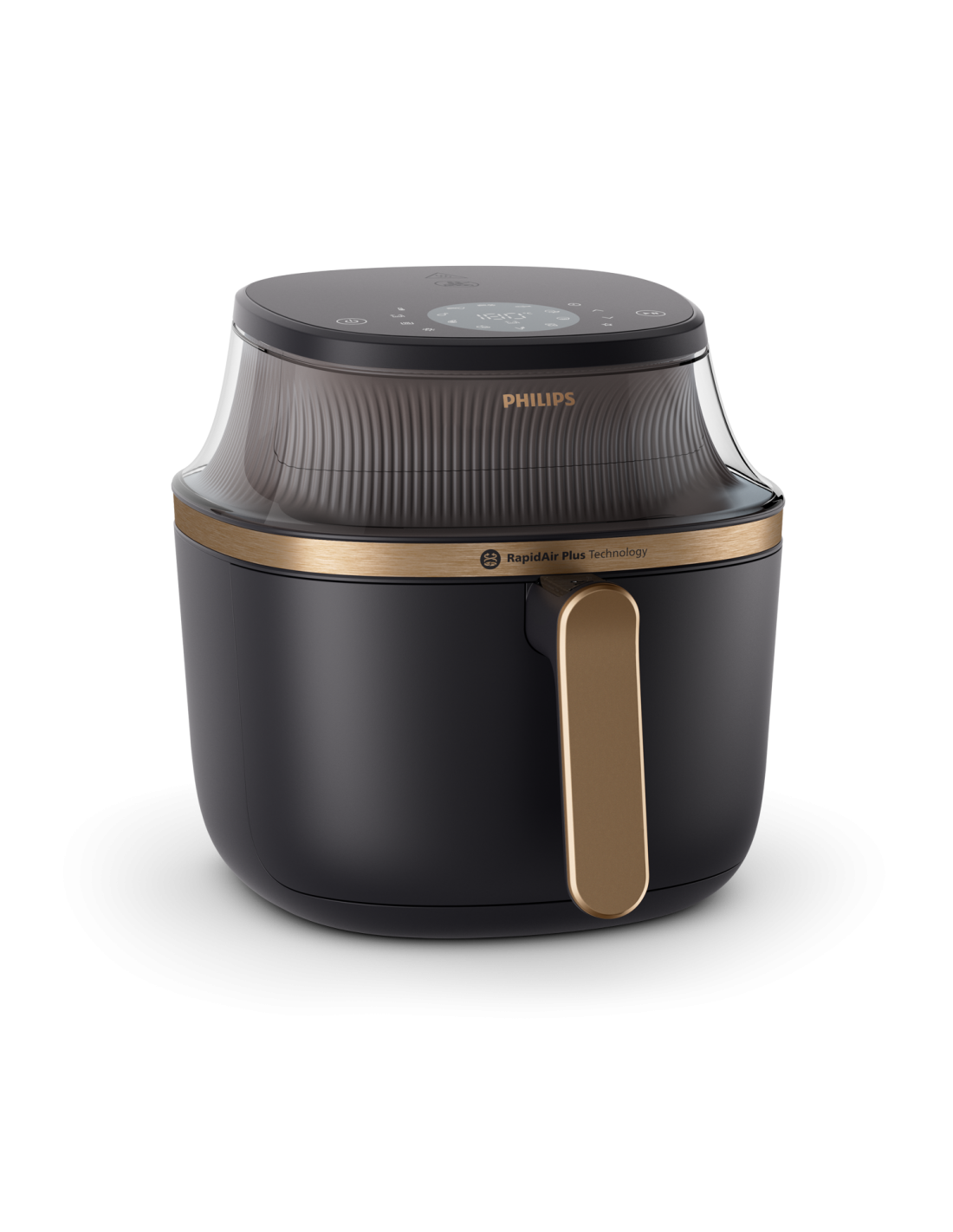 Gusta squisito cibo fino al 90% meno grasso*. Grazie alla tecnologia RapidAir Plus brevettata, con esclusivo design a stella, l'aria calda circola intorno e attraverso il cibo con un flusso di aria più rapido**, assicurando una cottura uniforme all'interno e all'esterno, per deliziosi piatti fatti in casa.