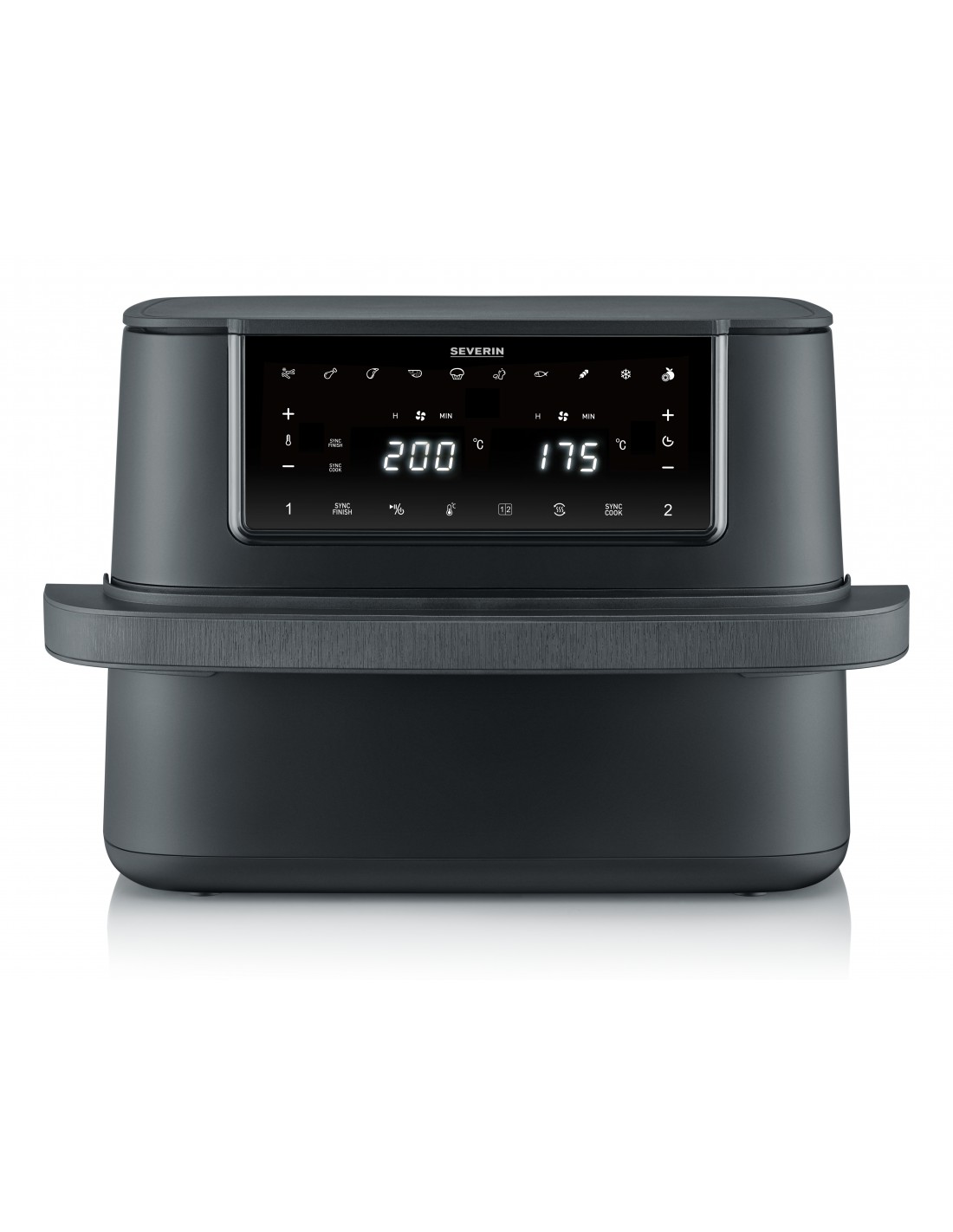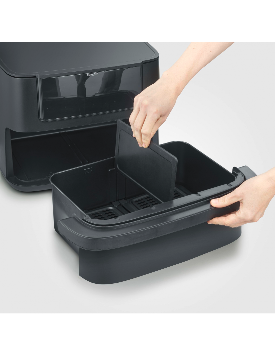 Severin FR 2490. Tipo di prodotto: Friggitrice ad aria calda, Capacità: 9 L, Temperatura (min): 60 °C. Tipo di costruzione: Doppia, Colore del prodotto: Nero, Tipo di controllo: Touch. Potenza: 2600 W, Tensione di ingresso AC: 220 V. Larghezza: 453 mm, Profondità: 341 mm, Altezza: 298 mm. Larghezza imballo: 457 mm, Profondità imballo: 412 mm, Altezza imballo: 362 mm