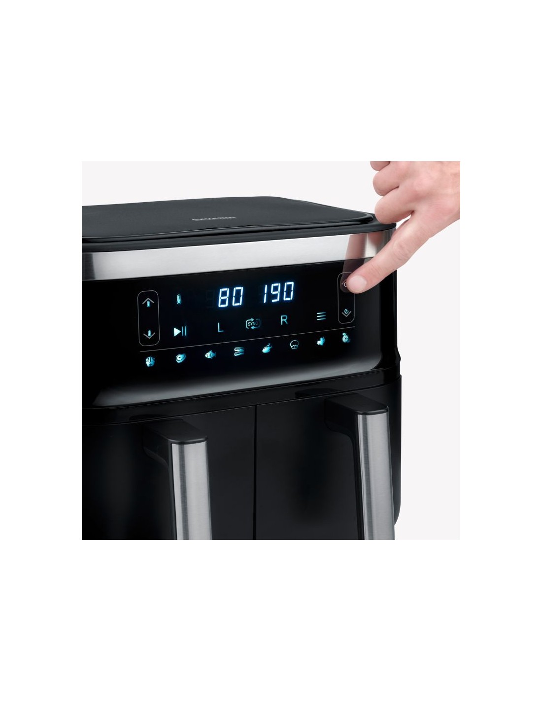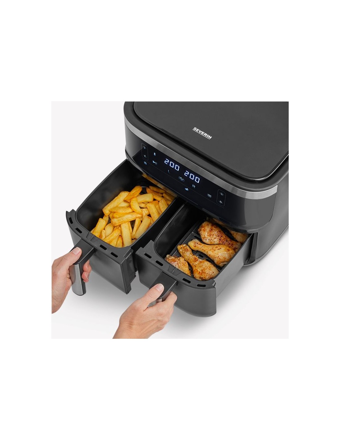 Con due camere di cottura da 4 litri utilizzabili separatamente, la friggitrice ad aria calda “Dual” di Black Line consente una preparazione varia e senza sprechi di tempo, perfetta per le famiglie, gli ospiti o per i piatti versatili di tutti i giorni. Grazie alle funzioni Sync Cook e Sync Finish, diverse pietanze vengono cotte contemporaneamente, in modo perfettamente coordinato e pronto da servire. Dieci programmi automatici garantiscono un funzionamento semplice e risultati affidabili con la semplice pressione di un tasto. Grazie alle parti rimovibili e lavabili in lavastoviglie con rivestimento antiaderente senza PTFE, i cestelli di cottura possono essere puliti senza problemi.