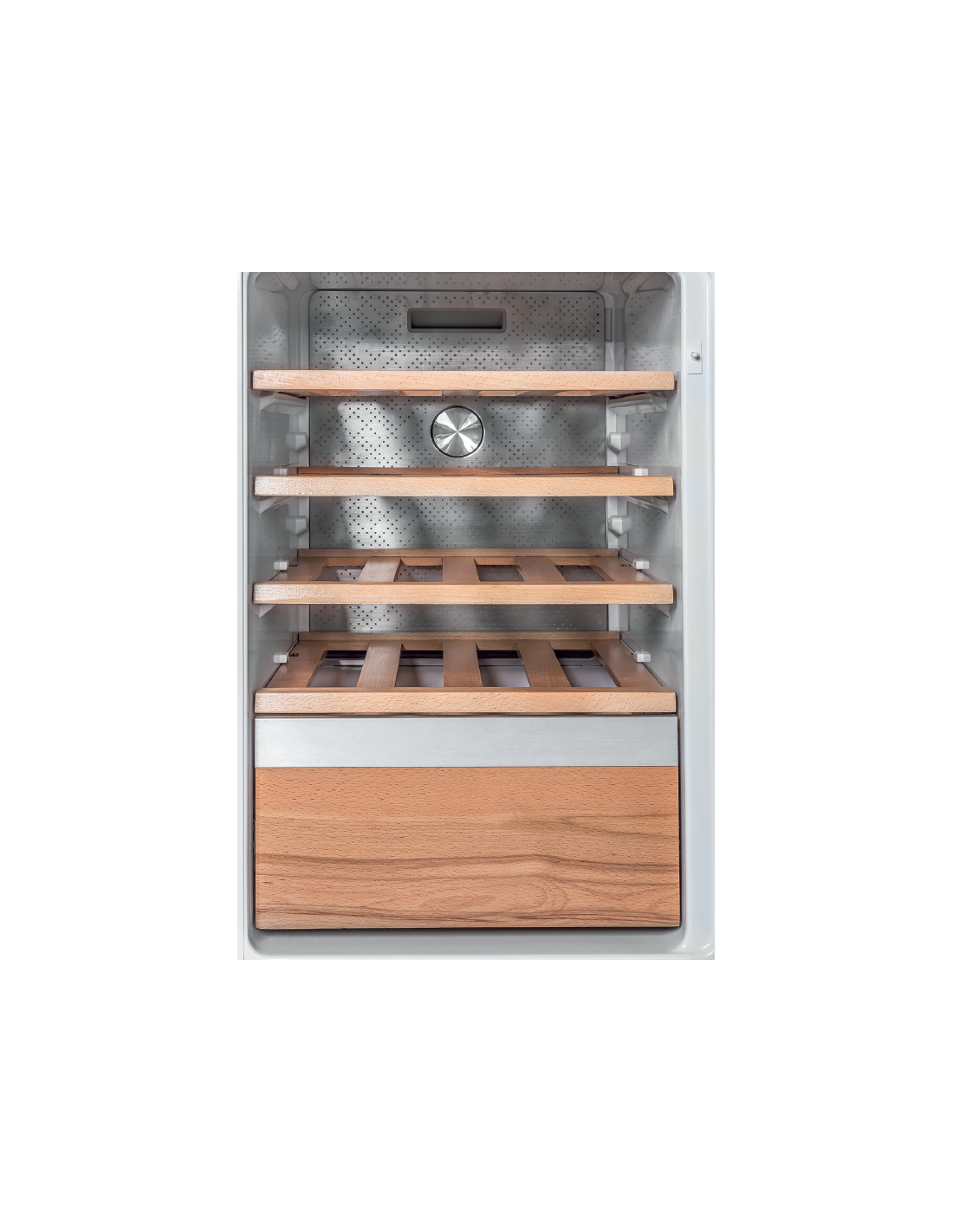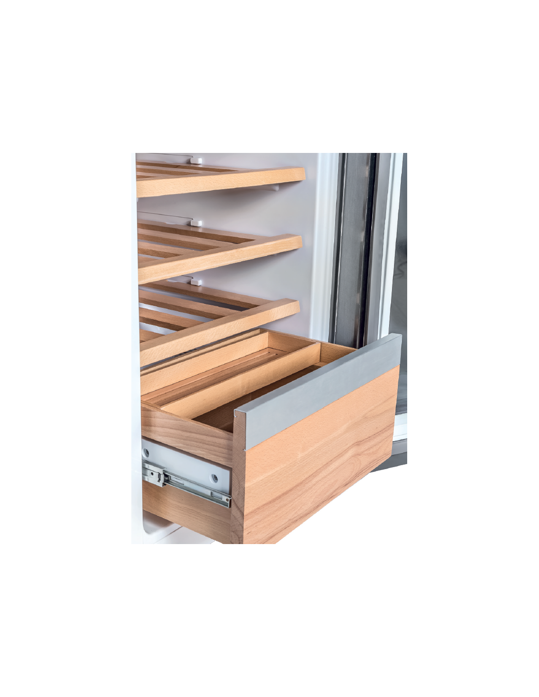 Un frigorifero esclusivo, la scelta intelligente per conservare in uno spazio unico sia il cibo che le bevande. La combinazione dei materiali e delle finiture, il legno di faggio dei ripiani e del cassetto e il vetro esterno, lo rendono davvero elegante e sofisticato. I ripiani possono conservare alla temperatura ideale, tra +5 e +16 gradi, fino a 25 bottiglie. In più c’è un comodo cassetto per altre bevande.