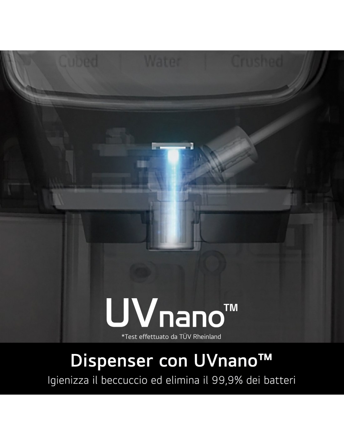 La tecnologia UVnano* igienizza il beccuccio del dispenser dell'acqua ogni ora, eliminando il 99,9% dei batteri** con l'azione dei raggi ultravioletti. In questo modo si evita la proliferazione dei batteri nei residui di acqua dopo l'erogazione.