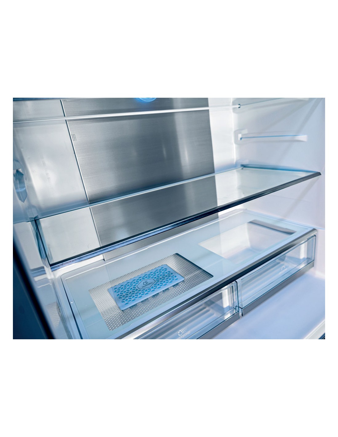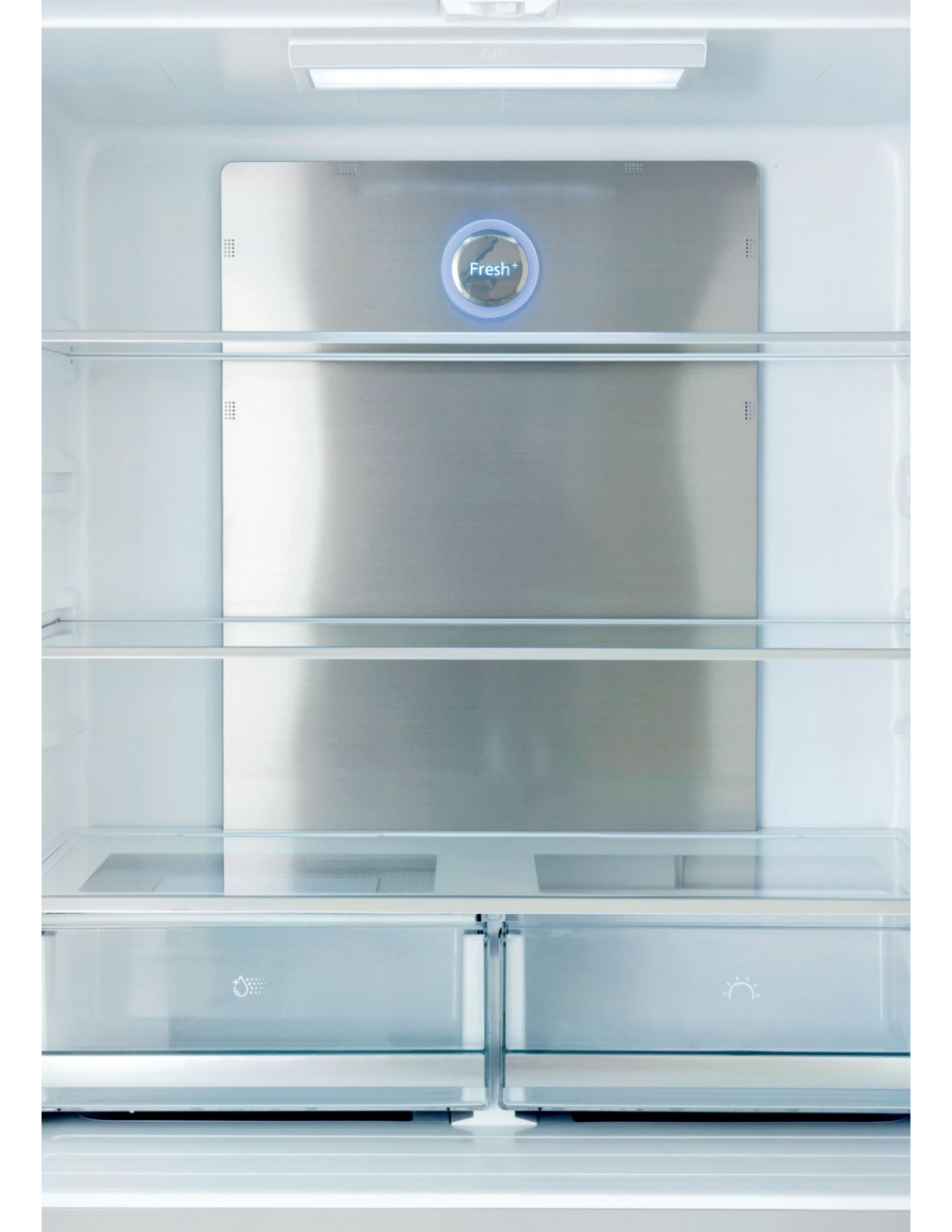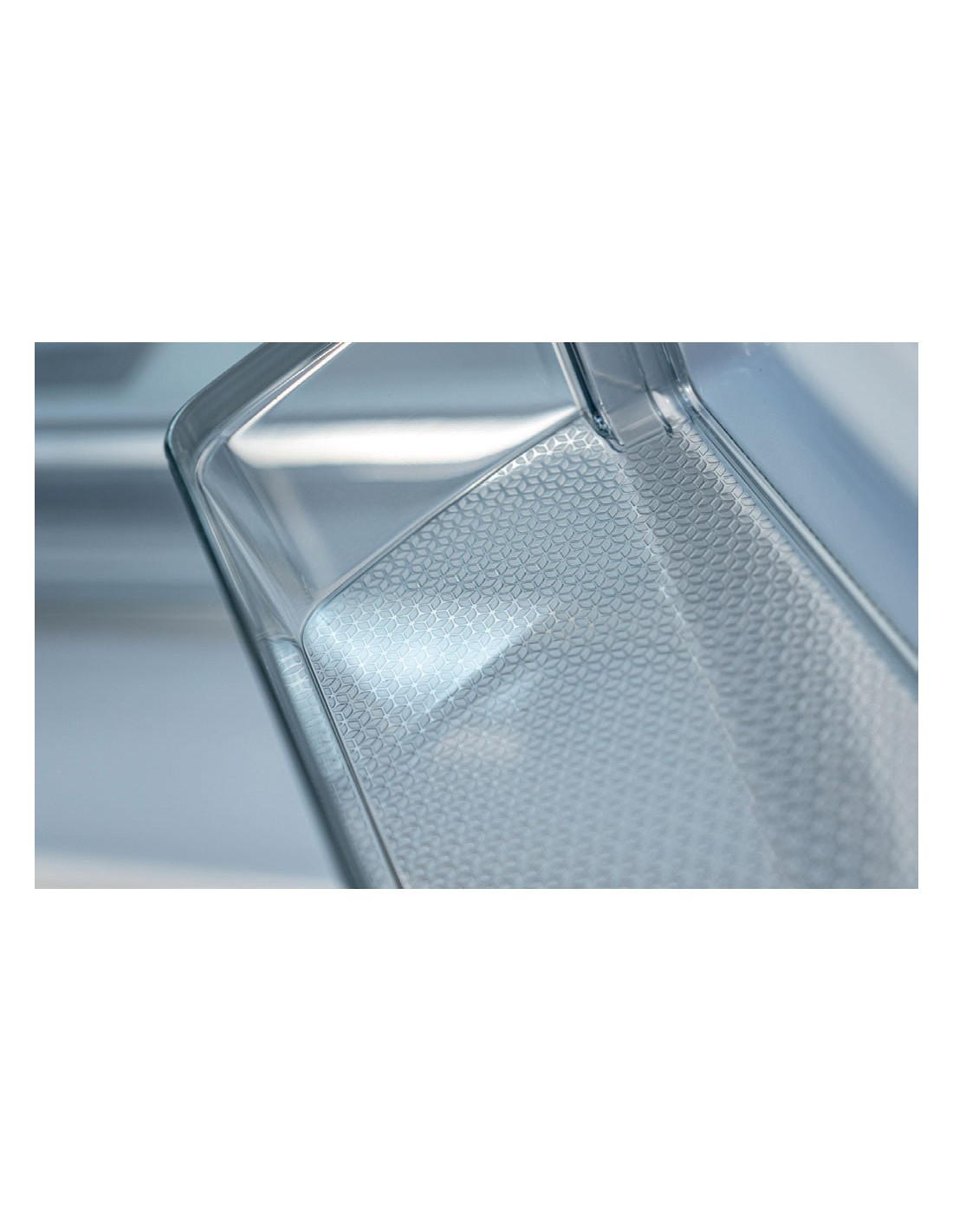 Un prodotto capiente, con un cassetto per conservare frutta e verdura dotato di un sistema di controllo dell’umidità che contribuisce a preservare la qualità e la freschezza più a lungo. I balconcini ampi, con profili in alluminio e trama sul fondo, rendono il frigorifero sofisticato ed elegante.