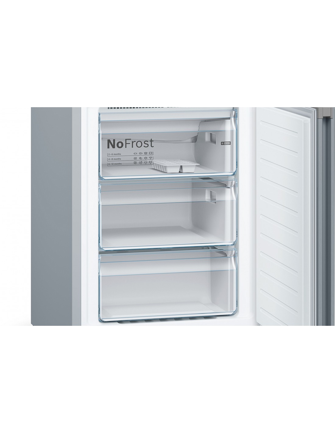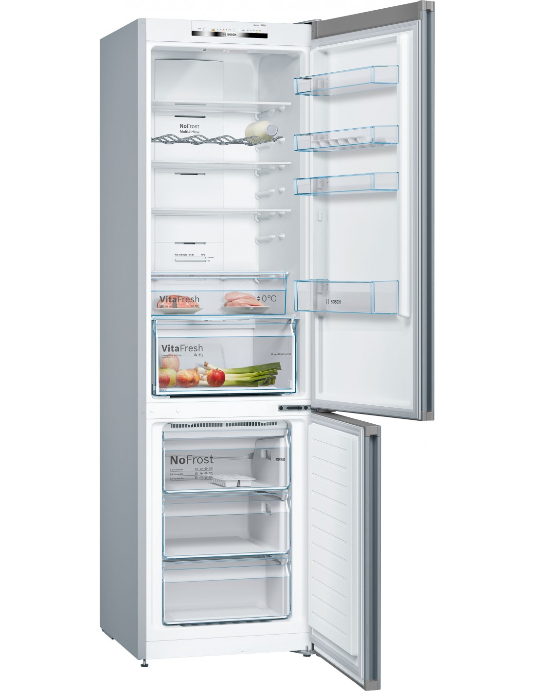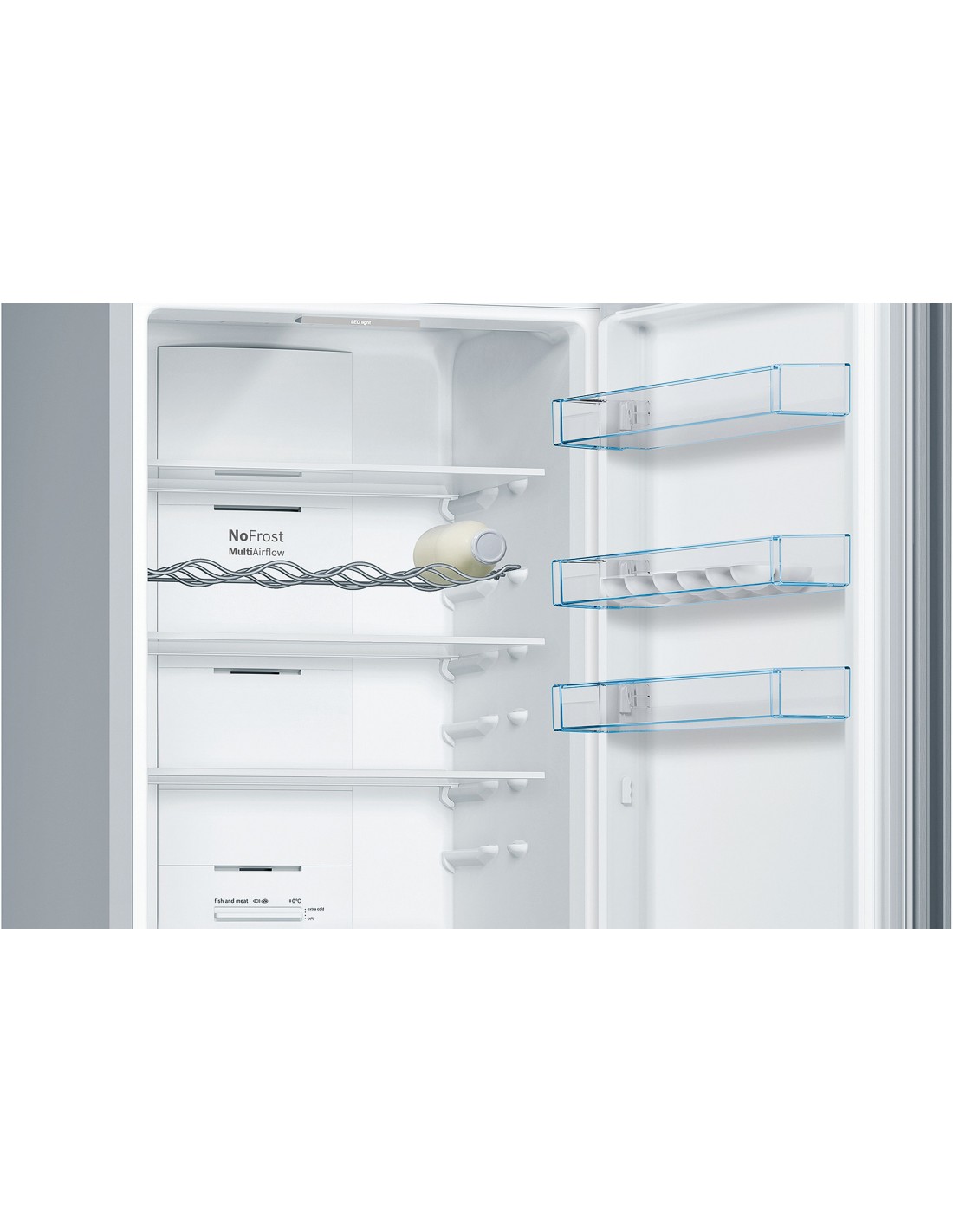 Bosch Serie 4 KGN392LDC. Capacità netta totale: 368 L. Cerniera porta: Destra. Classe climatica: SN-T, Emissione acustica: 36 dB. Capacità netta frigorifero: 279 L, No Frost (frigorifero), Sistema Multi-Airflow (frigorifero), Luce interna. Capacità netta congelatore: 89 L, Capacità di congelamento: 10 kg/24h, No Frost (congelatore). Compartimento zona fresca. Classe efficienza energetica: D, Consumo energetico annuo: 191 kWh. Colore del prodotto: Acciaio inossidabile