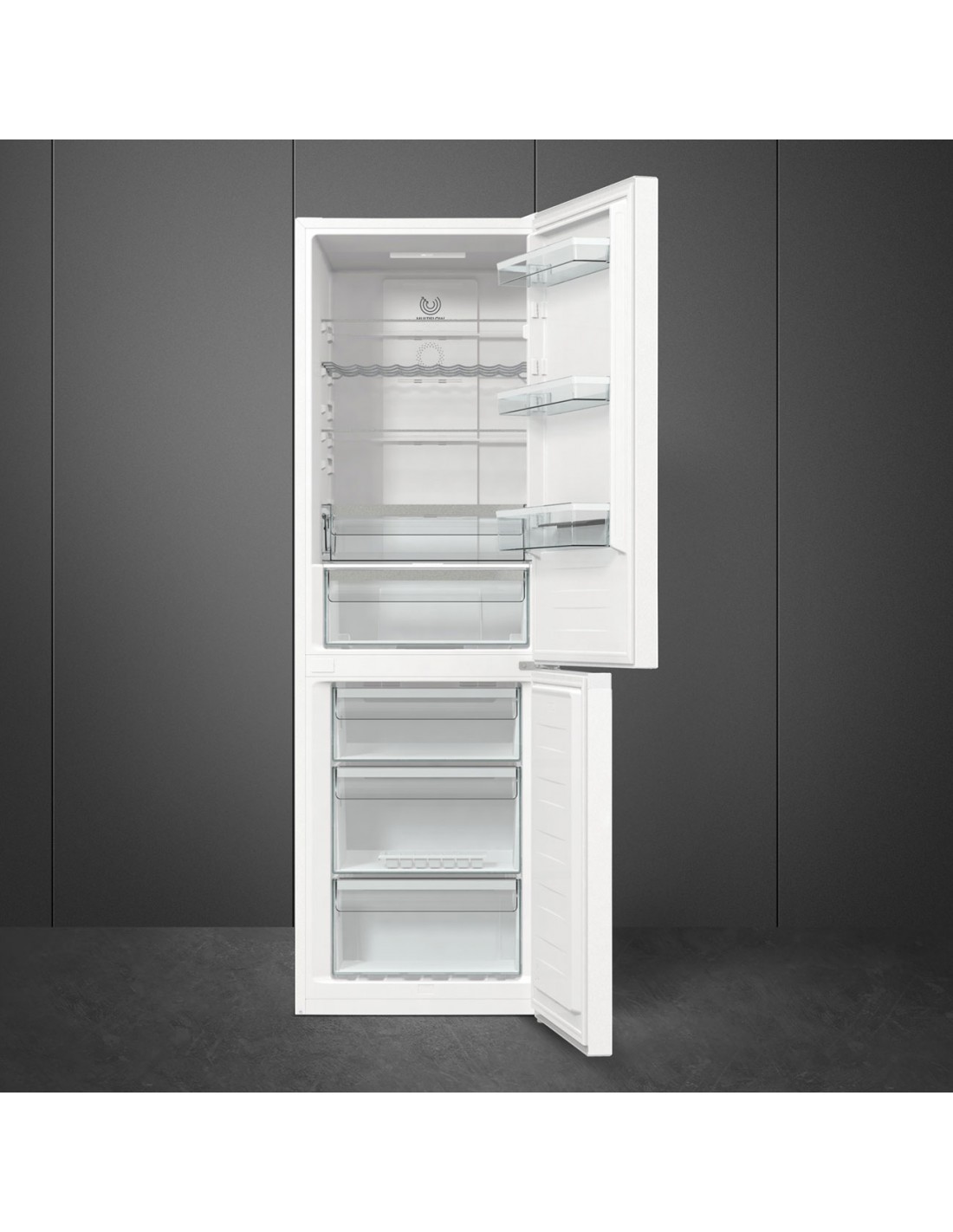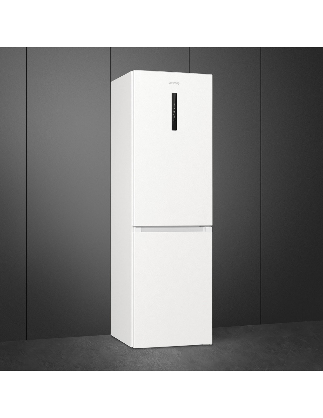 Smeg RC18WDNE. Capacità netta totale: 300 L. Tipo di display: LED. Classe climatica: SN-ST, Emissione acustica: 38 dB. Capacità netta frigorifero: 204 L, No Frost (frigorifero), Luce interna, Numero di ripiani frigorifero: 2, Numero di cassetti per verdura: 1. Capacità netta congelatore: 96 L, Capacità di congelamento: 10 kg/24h, No Frost (congelatore). Classe efficienza energetica: E, Consumo energetico annuo: 242 kWh. Colore del prodotto: Bianco