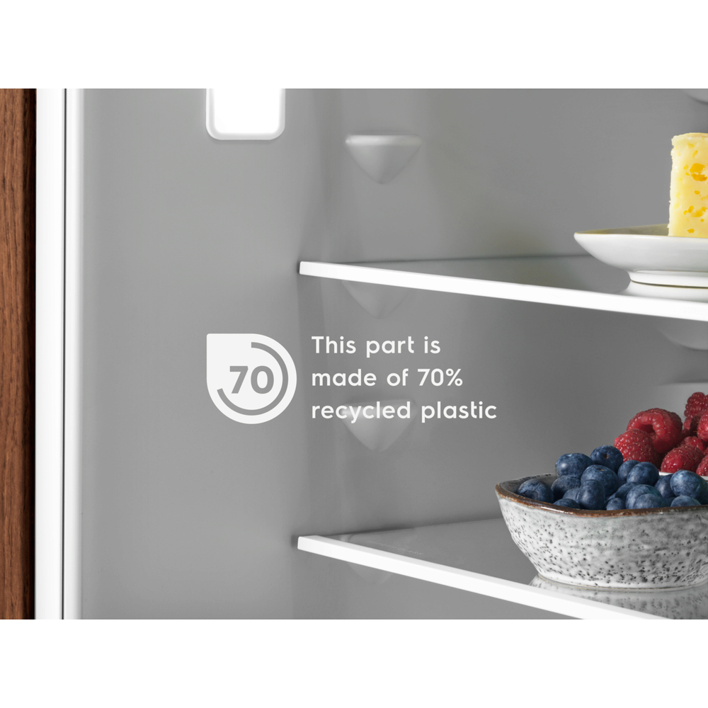 Siamo fieri di presentare un frigo unico nel suo genere, creato con rivestimenti composti per il 70% da plastica riciclata. La plastica dei frigoriferi che sono stati scartati viene utilizzata per crearne di nuovi, riducendo lo spreco attraverso la circolarità.