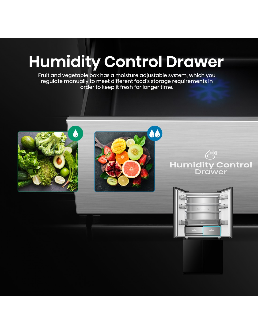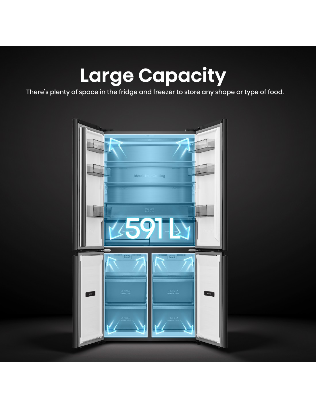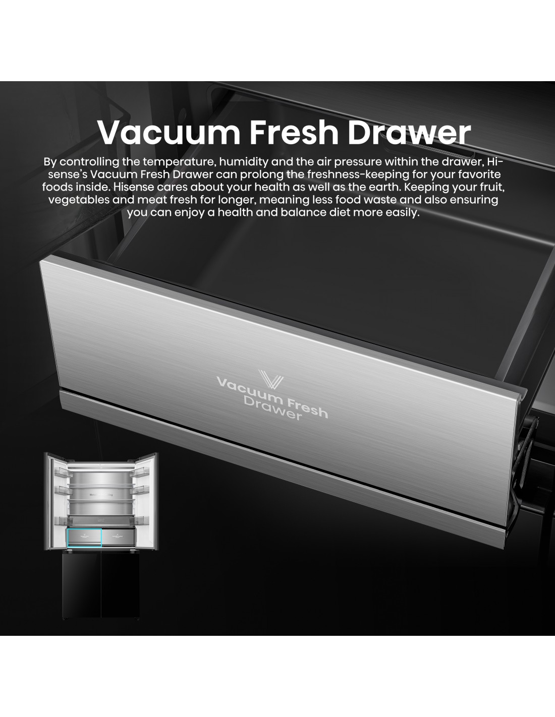 Hisense RQ768N4GBE. Posizionamento dell'apparecchio: Libera installazione, Design del prodotto: Multi porta, Colore del prodotto: Nero. Capacità netta totale: 591 L, Classe climatica: SN-ST, Classe emissione rumore: C. Capacità netta frigorifero: 486 L, Capacità lorda frigorifero: 486 L, Tipo di lampada: LED. Capacità netta congelatore: 105 L, Posizione del congelatore: Posto in basso, Capacità di congelamento: 12 kg/24h. Classe efficienza energetica: E, Consumo energetico annuo: 318 kWh, Scala di efficienza energetica: Da A a G