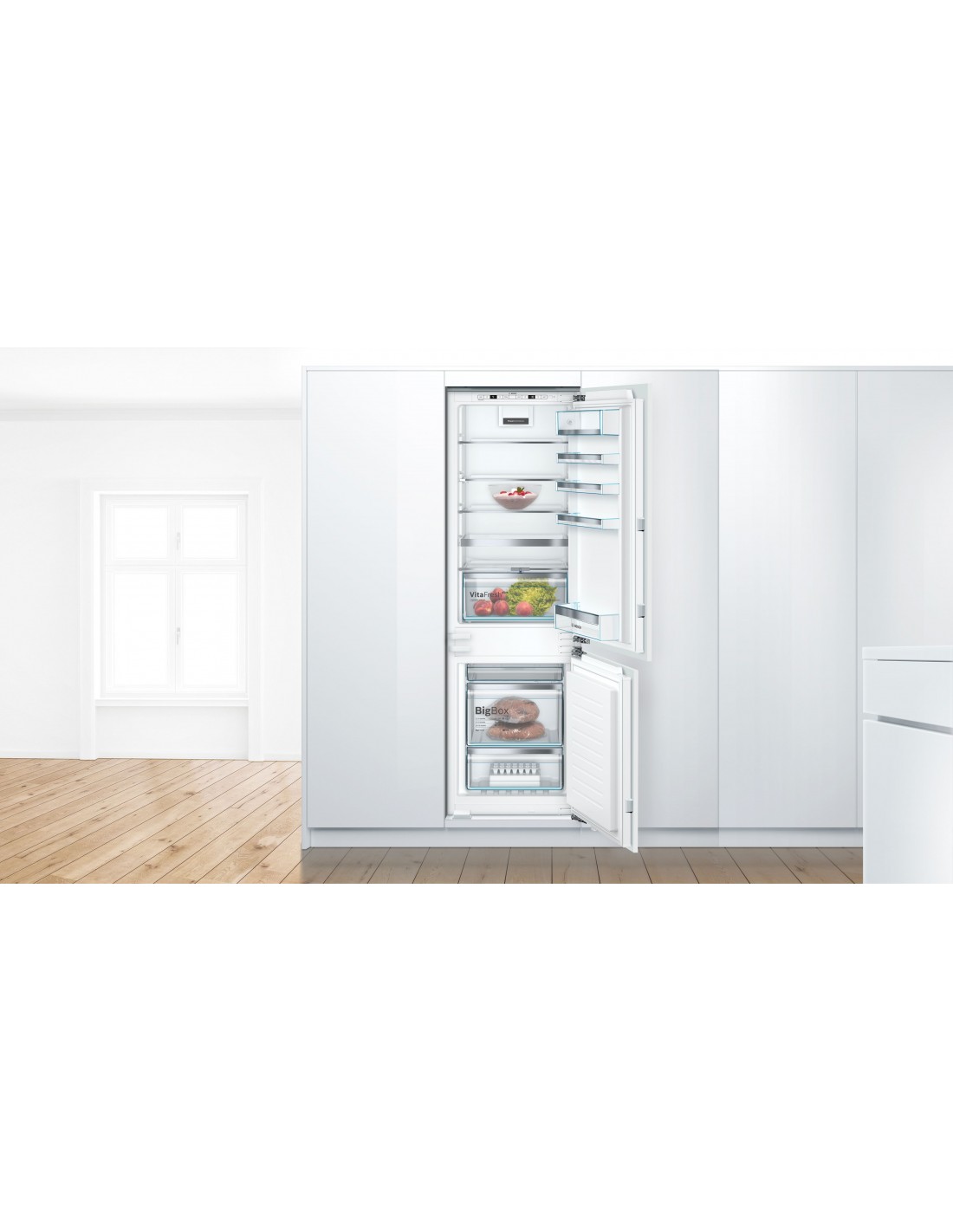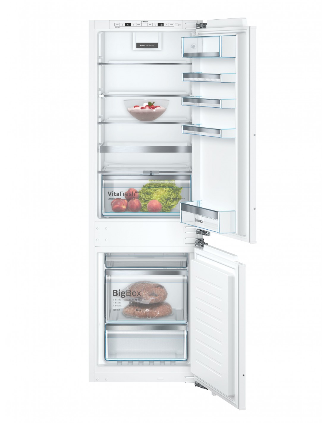 Bosch Serie 6 KIN86AFF0. Capacità netta totale: 254 L. Cerniera porta: Destra. Classe climatica: SN-ST, Emissione acustica: 39 dB. Capacità netta frigorifero: 187 L, Luce interna, Numero di ripiani frigorifero: 5, Numero di cassetti per verdura: 1. Capacità netta congelatore: 67 L, Capacità di congelamento: 8 kg/24h, No Frost (congelatore). Classe efficienza energetica: F, Consumo energetico annuo: 277 kWh