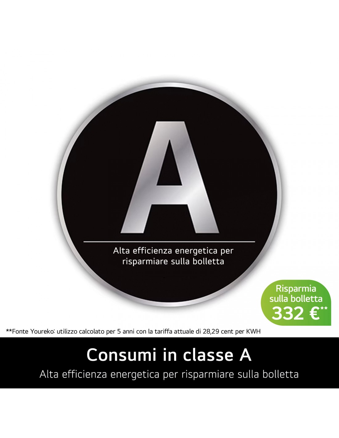 Grazie alle nostre migliori tecnologie, ti offriamo un frigorifero con la classe di efficienza energetica più alta. L'efficienza in classe A ti garantisce consumi inferiori e, quindi, ti permette di risparmiare sulla tua bolletta.