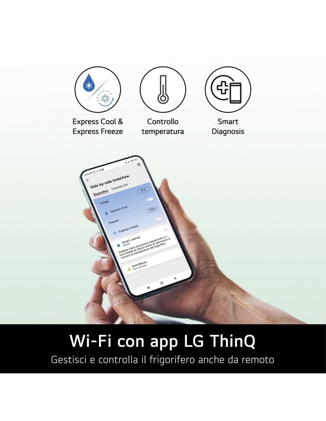 Collega il frigorifero al Wi-Fi e scarica l'app LG ThinQ sul tuo smartphone iOS o Android per avere a portata di mano tante funzioni e gestire il frigorifero anche quando sei fuori casa. Ad esempio, puoi impostare le temperature del frigorifero e del congelatore, oppure attivare la funzione di raffreddamento rapido quando stai tornando dal fare la spesa. Inoltre, puoi monitorare i consumi direttamente dal tuo smartphone.