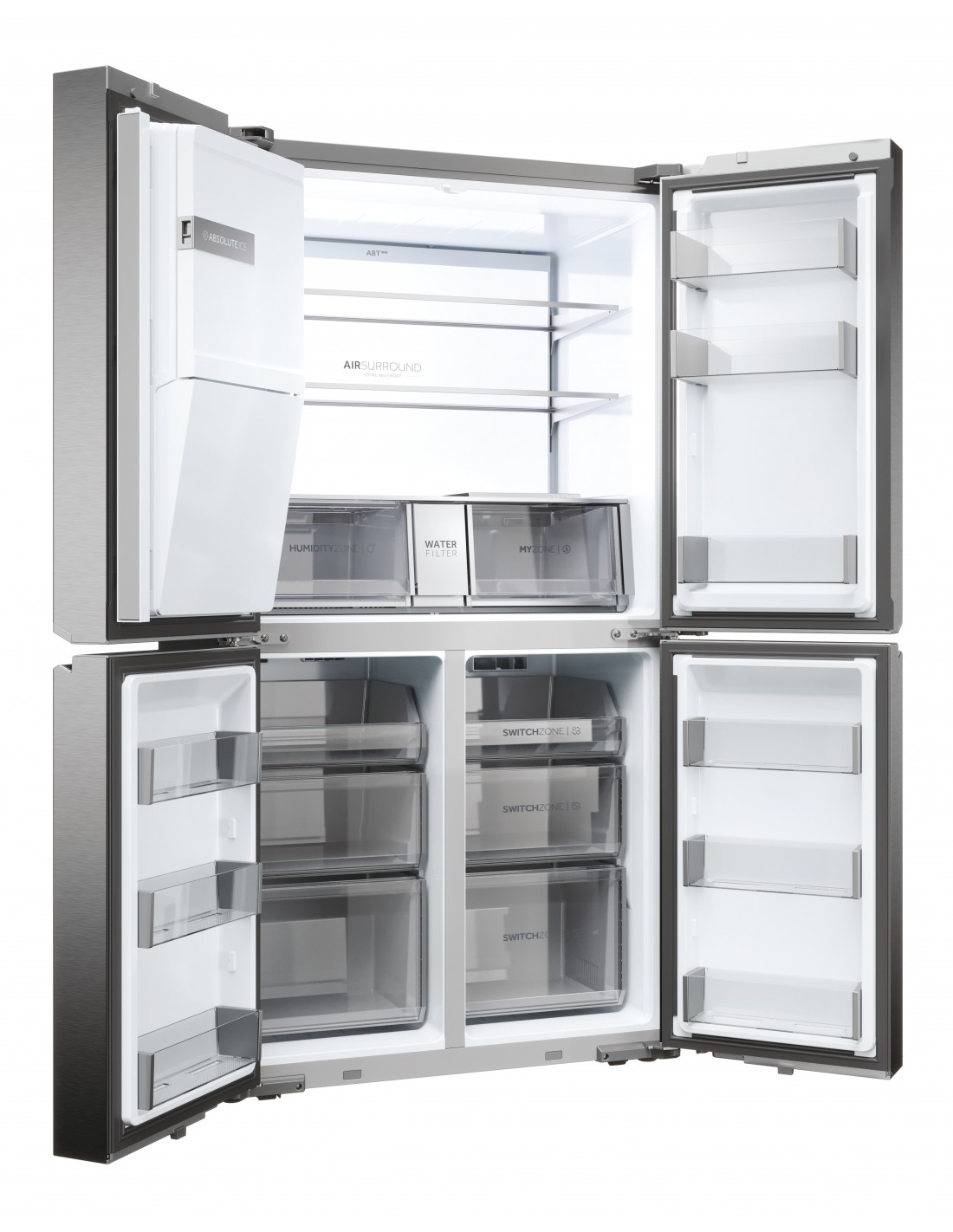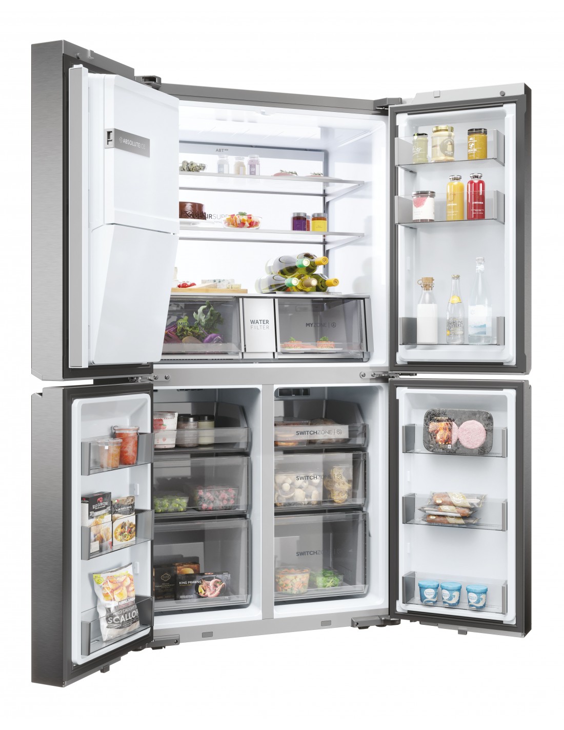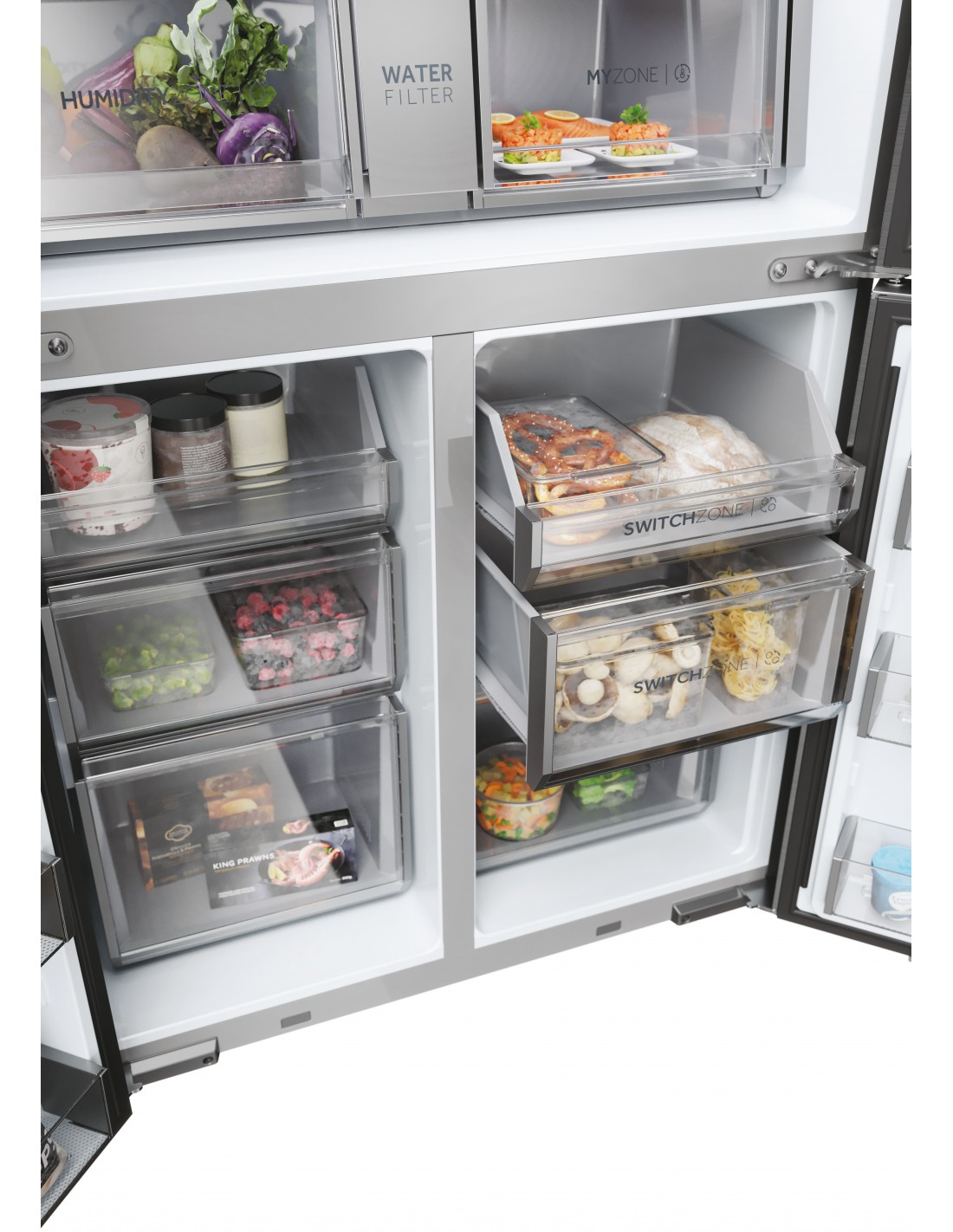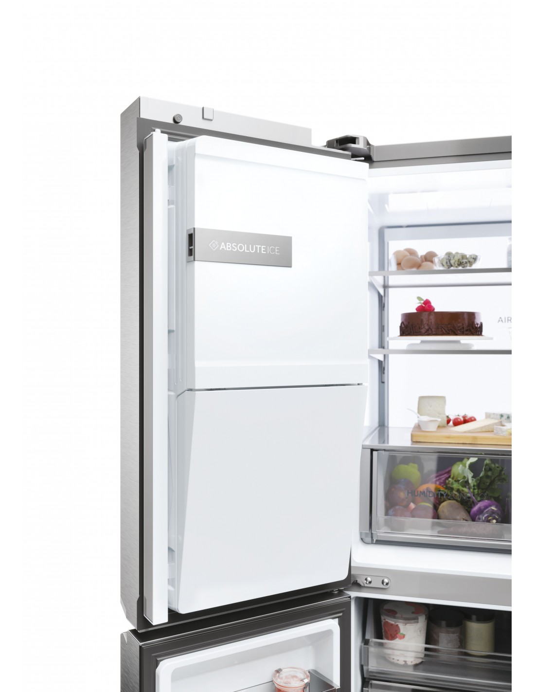 Haier HCR7918EIMP. Posizionamento dell'apparecchio: Libera installazione, Design del prodotto: Porta francese, Colore del prodotto: Platino, Acciaio inox. Capacità netta totale: 601 L, Classe climatica: Starfish, Classe emissione rumore: C. Capacità netta frigorifero: 323 L, Tipo di lampada: LED. Capacità netta congelatore: 278 L, Posizione del congelatore: Posto in basso, Capacità di congelamento: 6 kg/24h. Classe efficienza energetica: E, Consumo energetico annuo: 357 kWh, Scala di efficienza energetica: Da A a G