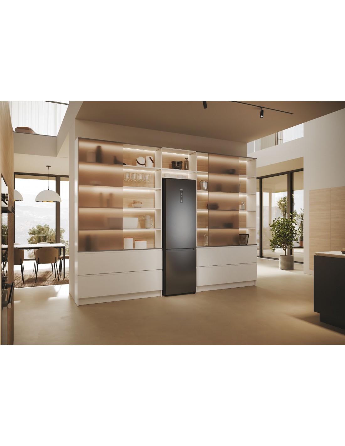 Haier 2D 60 Serie 5 Pro HDPW5620CNPD. Capacità netta totale: 406 L. Cerniera porta: Destra. Classe climatica: SN-T, Emissione acustica: 35 dB. Capacità netta frigorifero: 289 L, No Frost (frigorifero), Luce interna, Numero di ripiani frigorifero: 3. Capacità netta congelatore: 117 L, Capacità di congelamento: 10 kg/24h, No Frost (congelatore). Compartimento zona fresca. Classe efficienza energetica: C, Consumo energetico annuo: 176 kWh. Colore del prodotto: Nero