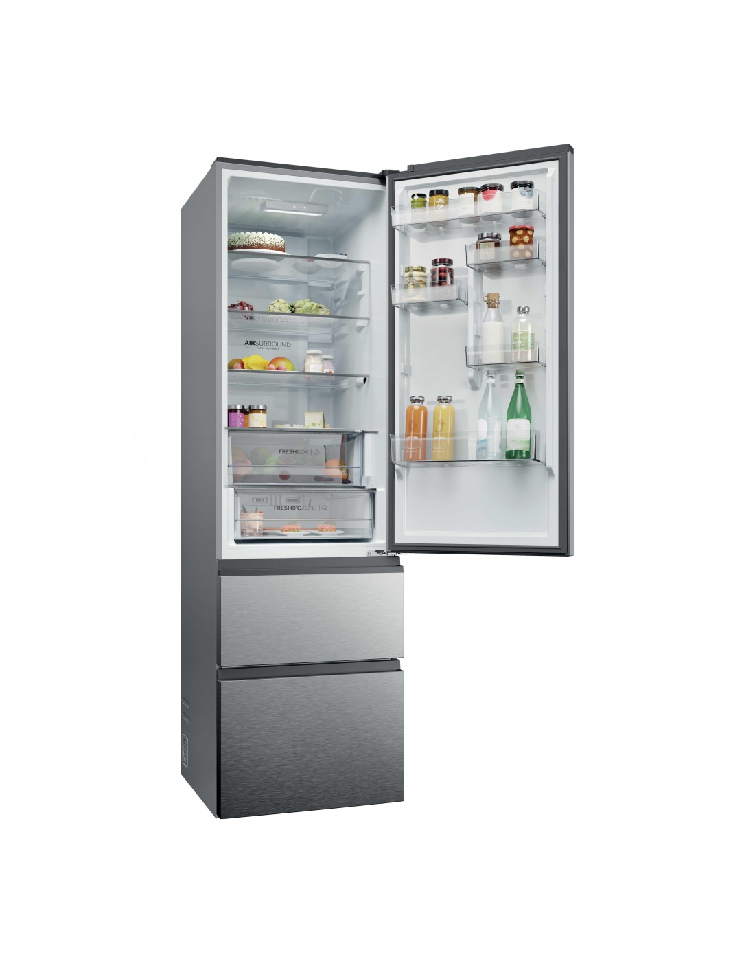 Haier HTR3620CNMG. Capacità netta totale: 414 L. Cerniera porta: Destra, Tipo di display: LED. Classe climatica: SN-T, Emissione acustica: 35 dB. Capacità netta frigorifero: 289 L, No Frost (frigorifero), Luce interna. Capacità netta congelatore: 125 L, Capacità di congelamento: 6 kg/24h, No Frost (congelatore). Compartimento zona fresca. Classe efficienza energetica: C, Consumo energetico annuo: 181 kWh. Colore del prodotto: Argento