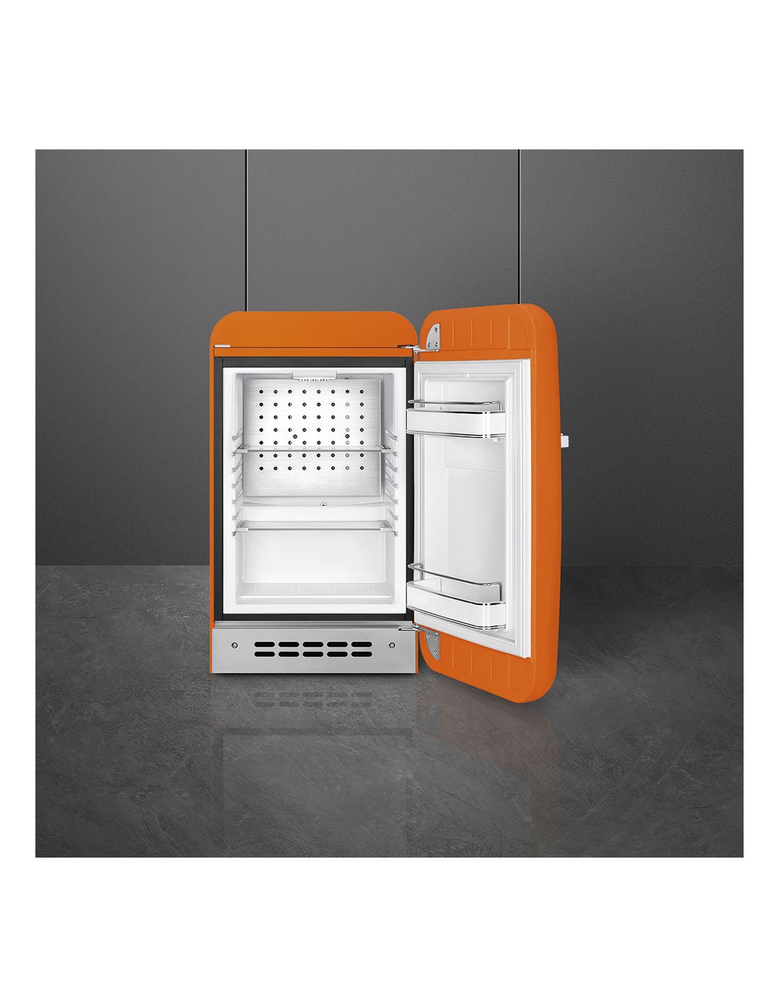 Smeg FAB5ROR6. Capacità netta frigorifero: 34 L, Classe climatica: SN-T, Emissione acustica: 36 dB. Numero di ripiani frigorifero: 2. Tipo di lampada: LED. Cerniera porta: Destra. Consumo energetico annuo: 49 kWh, Classe efficienza energetica: D. Peso: 28 kg. Colore del prodotto: Arancione
