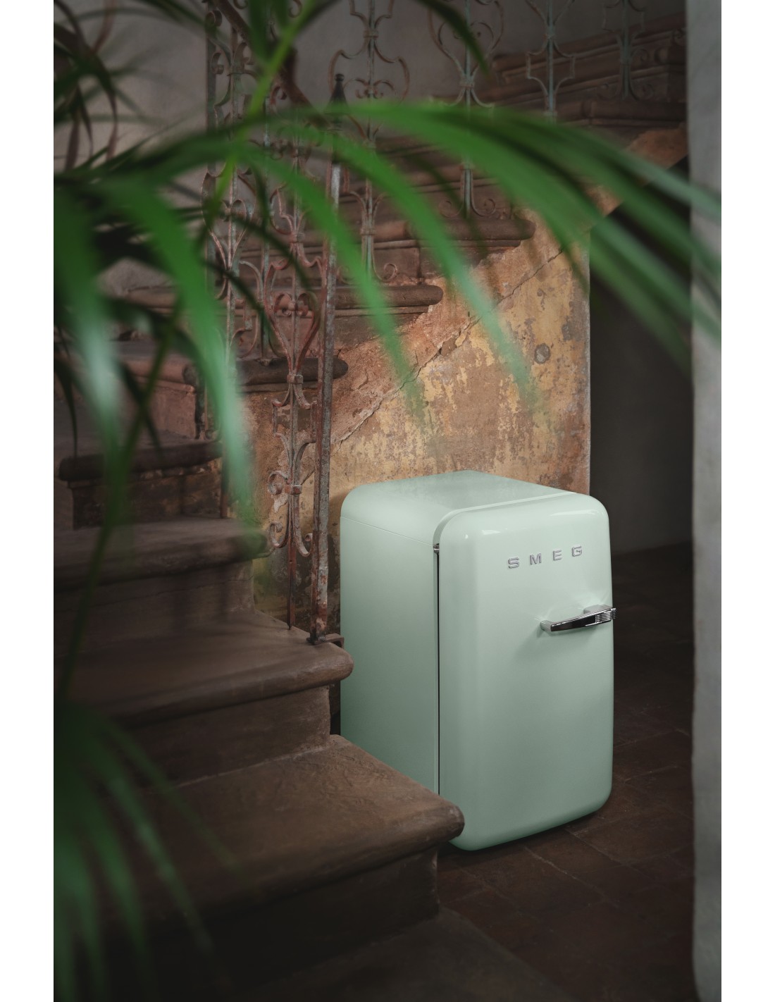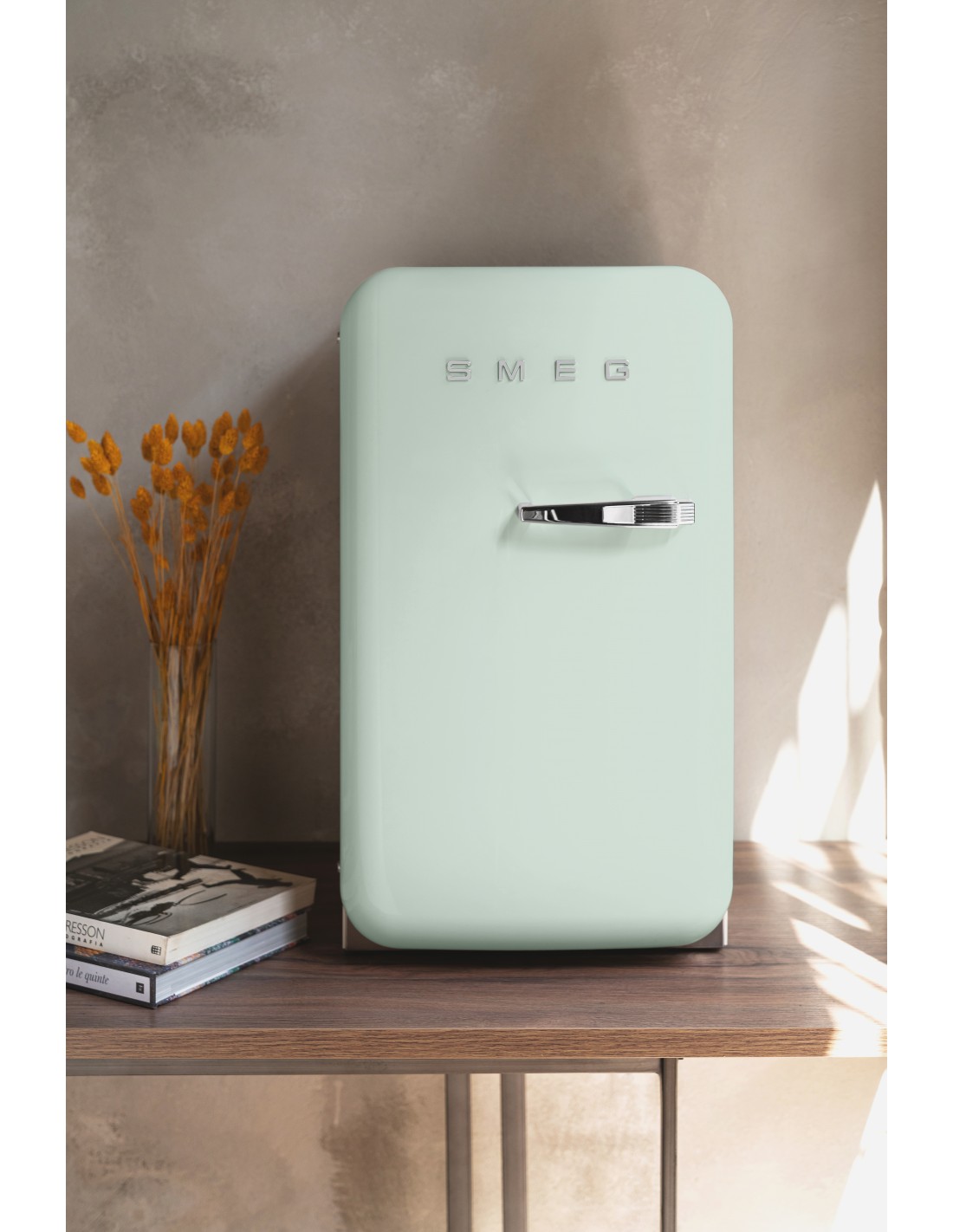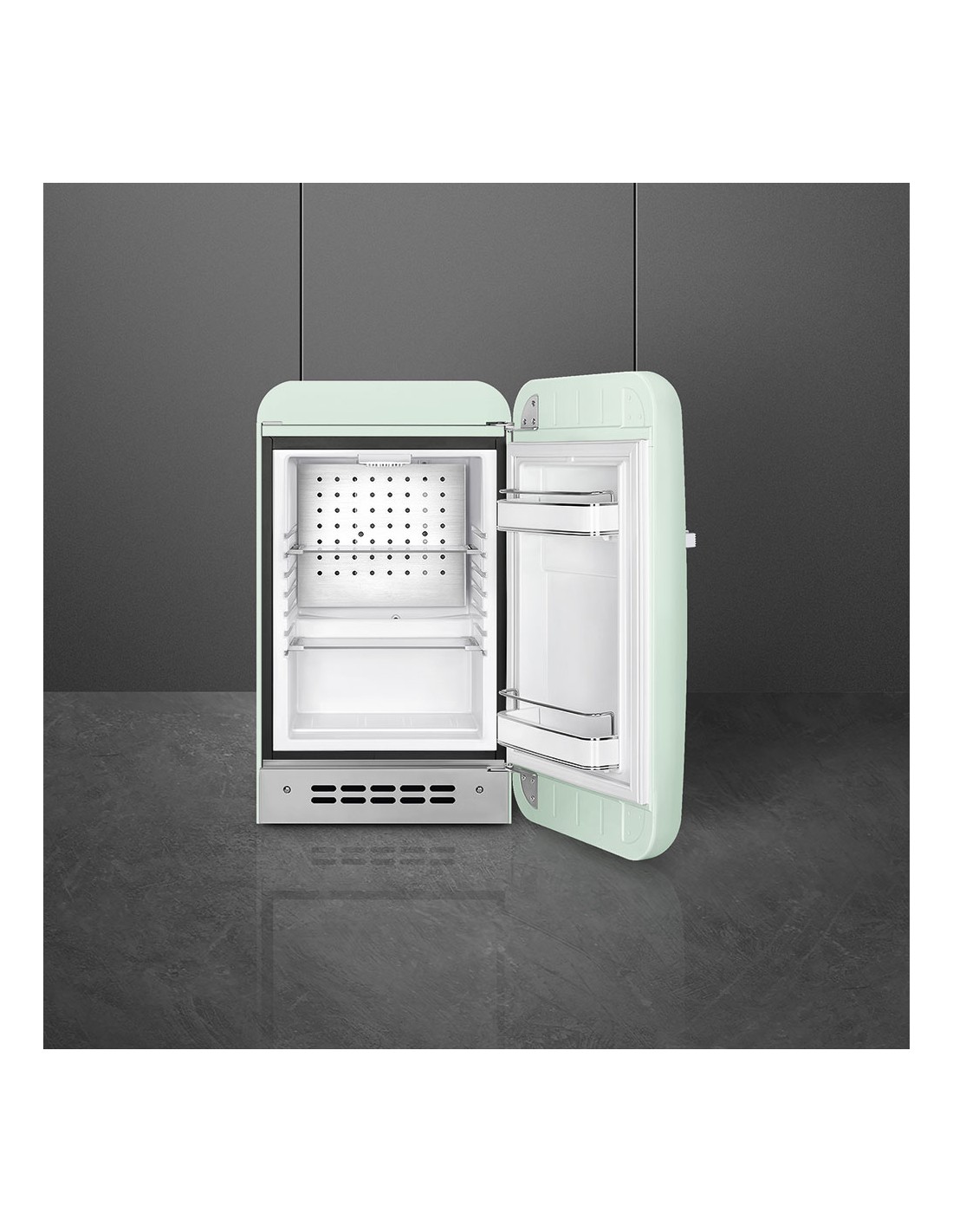 Smeg FAB5RPG6. Capacità netta frigorifero: 34 L, Classe climatica: SN-T, Emissione acustica: 36 dB. Numero di ripiani frigorifero: 2. Tipo di lampada: LED. Cerniera porta: Destra. Consumo energetico annuo: 49 kWh, Classe efficienza energetica: D. Peso: 25 kg. Colore del prodotto: Verde