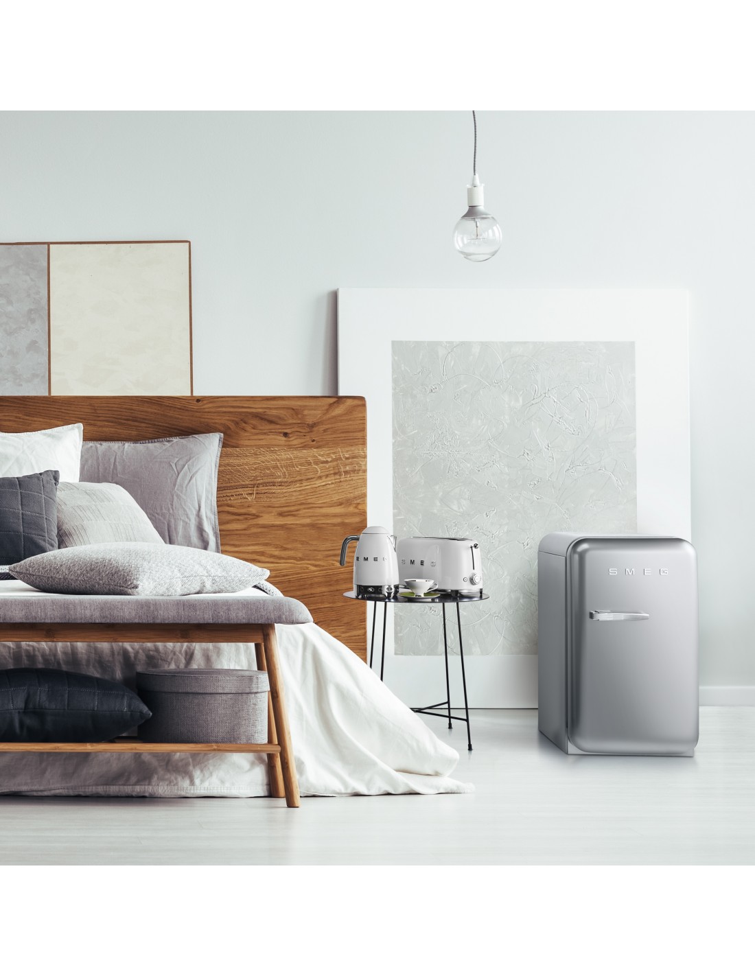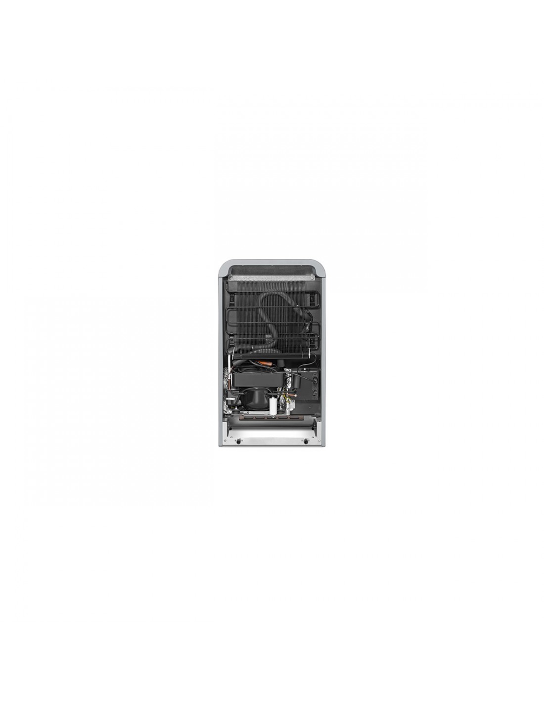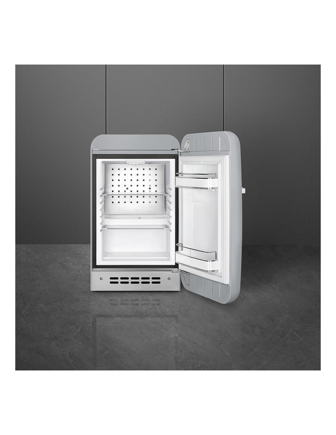Smeg FAB5RSV6. Capacità netta frigorifero: 34 L, Classe climatica: SN-T, Emissione acustica: 36 dB. Numero di ripiani frigorifero: 2. Tipo di lampada: LED. Cerniera porta: Destra. Consumo energetico annuo: 49 kWh, Classe efficienza energetica: D. Peso: 26 kg. Colore del prodotto: Argento