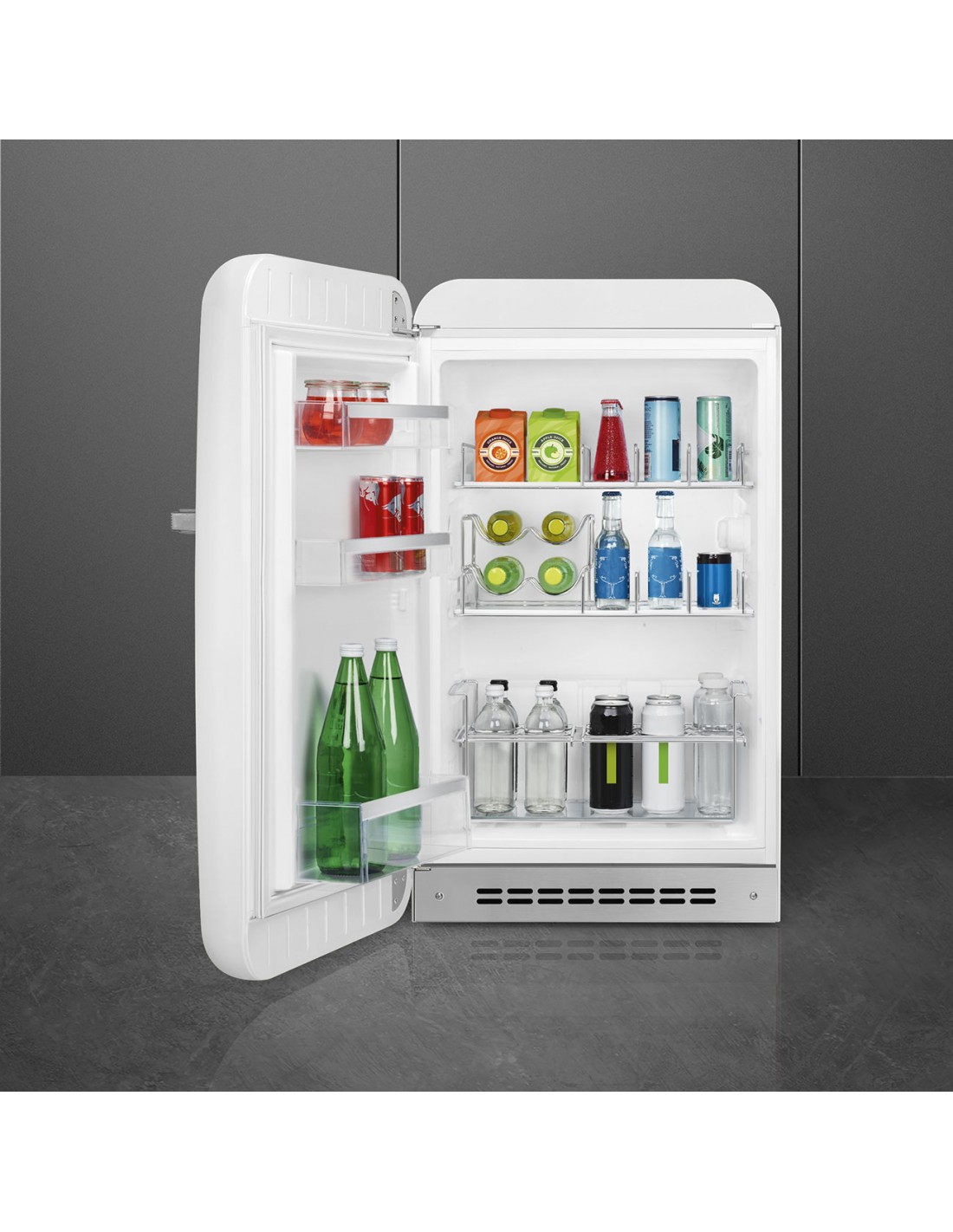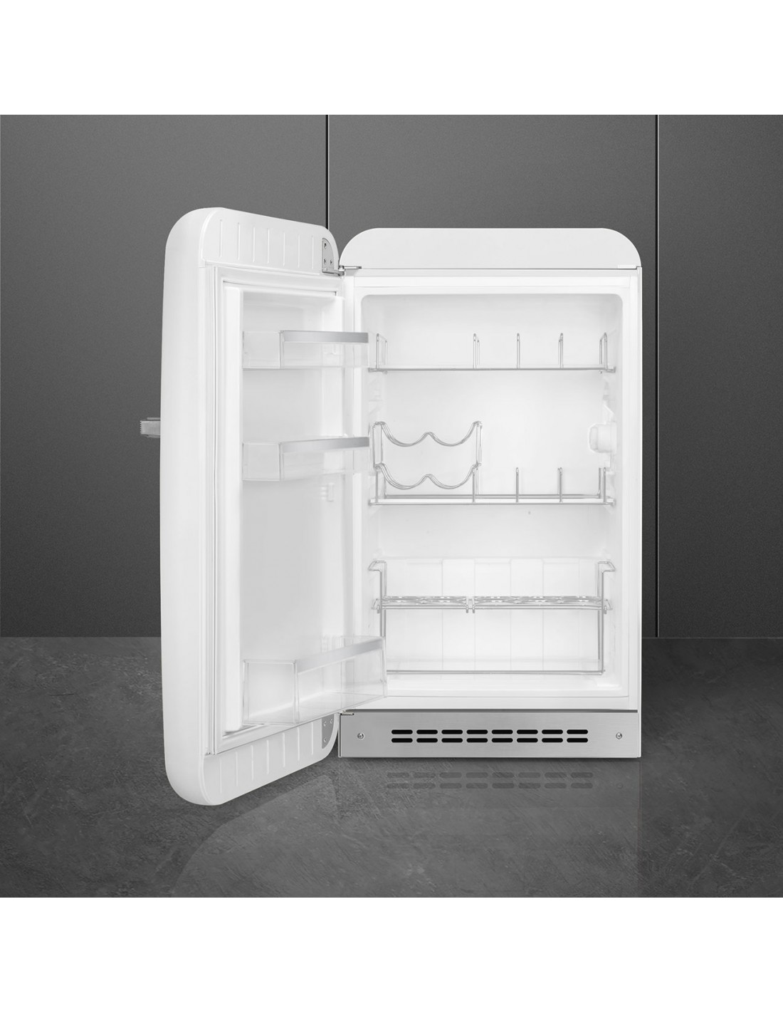 Smeg FAB10HLWH6. Capacità netta frigorifero: 135 L, Classe climatica: SN-T, Emissione acustica: 35 dB. Numero di ripiani frigorifero: 2. Tipo di lampada: LED. Cerniera porta: Sinistra. Consumo energetico annuo: 72 kWh, Classe efficienza energetica: D. Peso: 43 kg. Colore del prodotto: Bianco