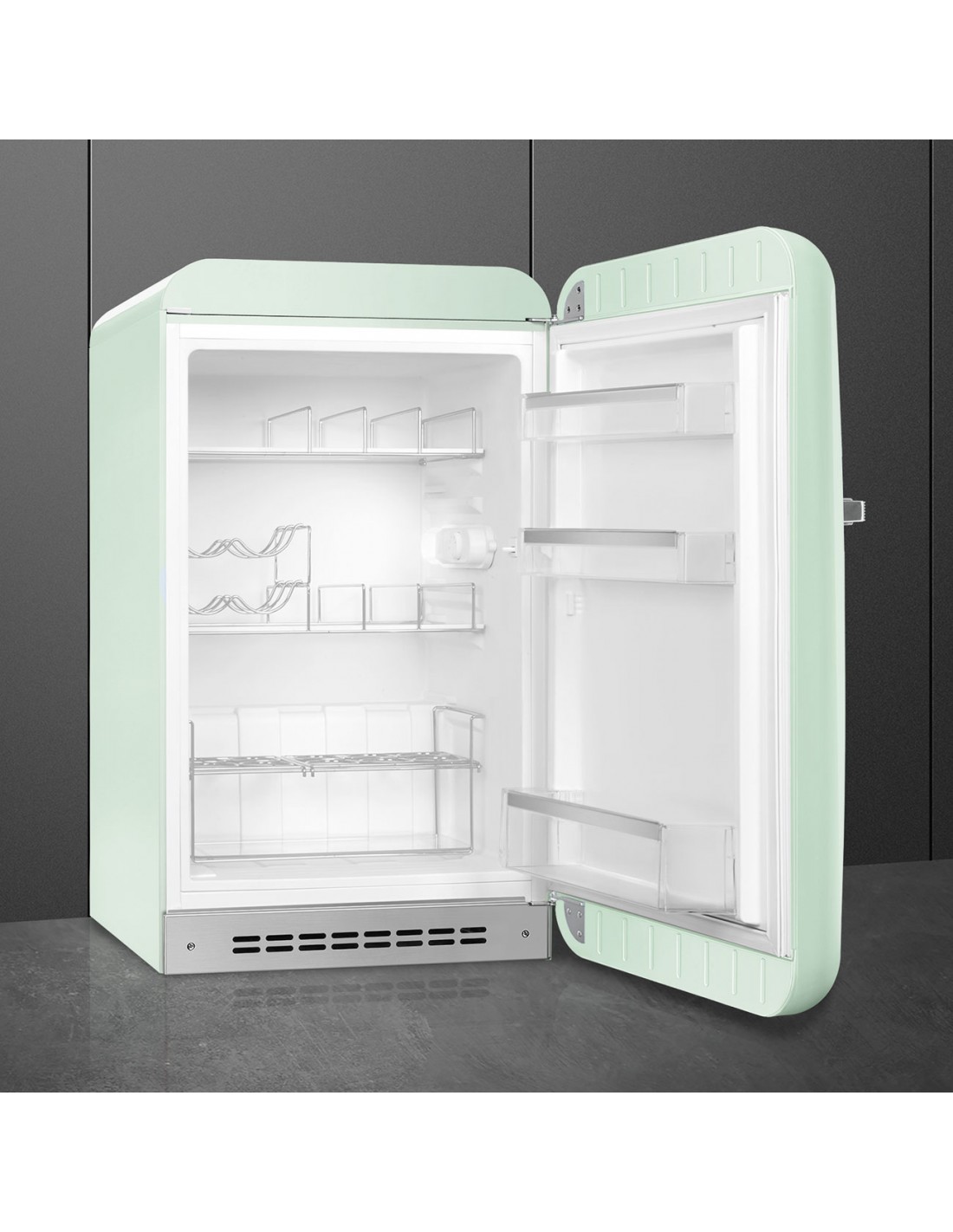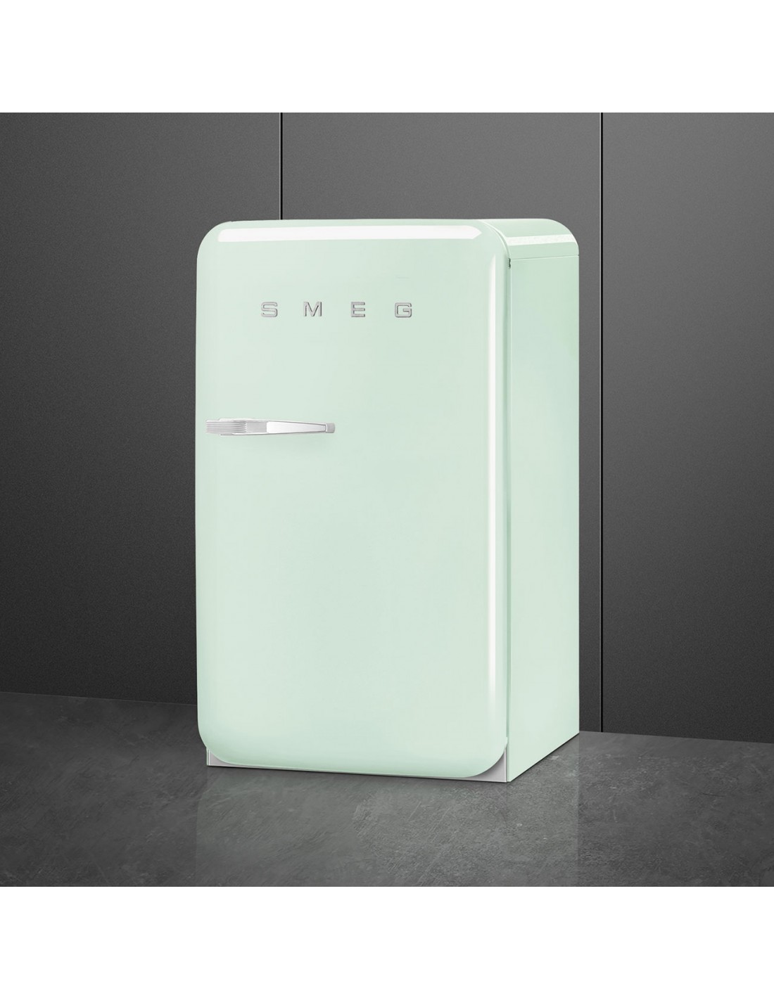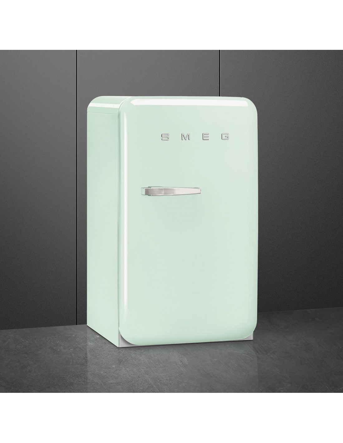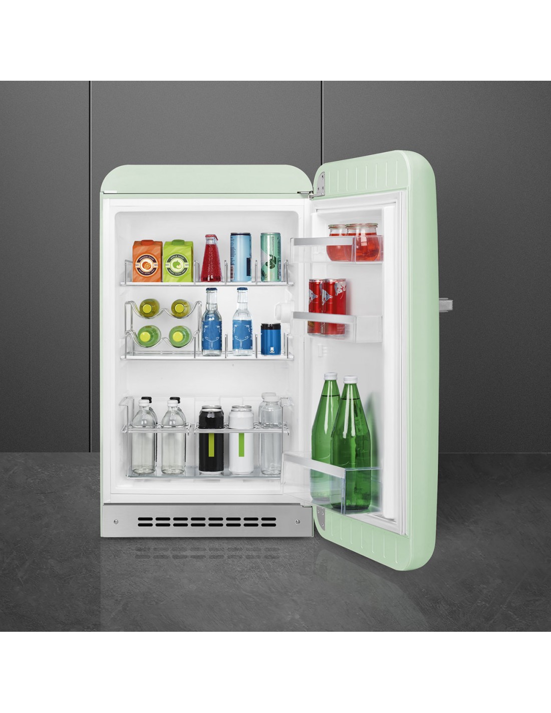 Smeg FAB10HRPG6. Capacità netta frigorifero: 135 L, Classe climatica: SN-T, Emissione acustica: 35 dB. Numero di ripiani frigorifero: 2. Tipo di lampada: LED. Cerniera porta: Destra. Consumo energetico annuo: 72 kWh, Classe efficienza energetica: D. Peso: 43 kg. Colore del prodotto: Verde