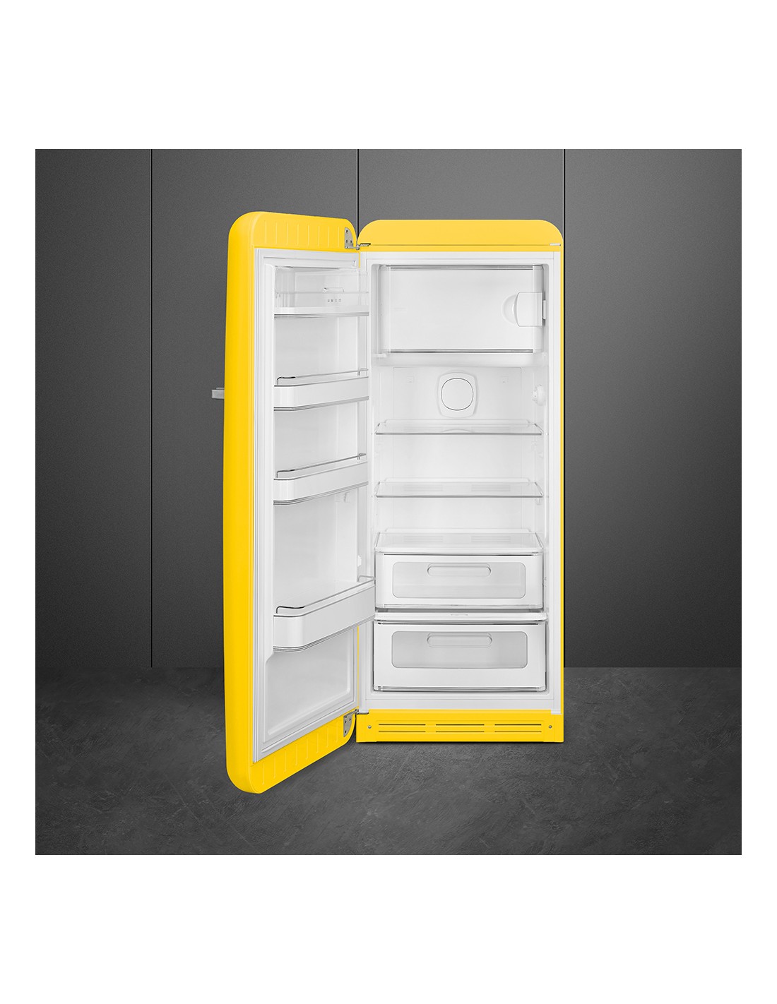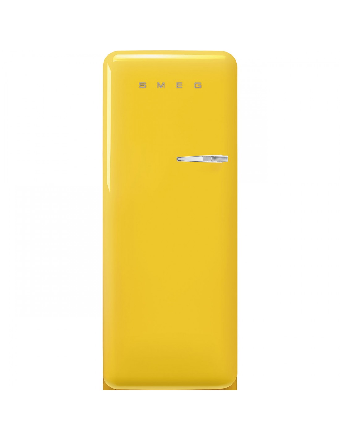 Smeg FAB28LYW6. Capacità netta frigorifero: 244 L, Classe climatica: SN-T, Emissione acustica: 35 dB. Numero di ripiani frigorifero: 2, Numero di cassetti per verdura: 1. Tipo di lampada: LED. Cerniera porta: Sinistra. Consumo energetico annuo: 104 kWh, Classe efficienza energetica: D. Peso: 70 kg. Colore del prodotto: Giallo