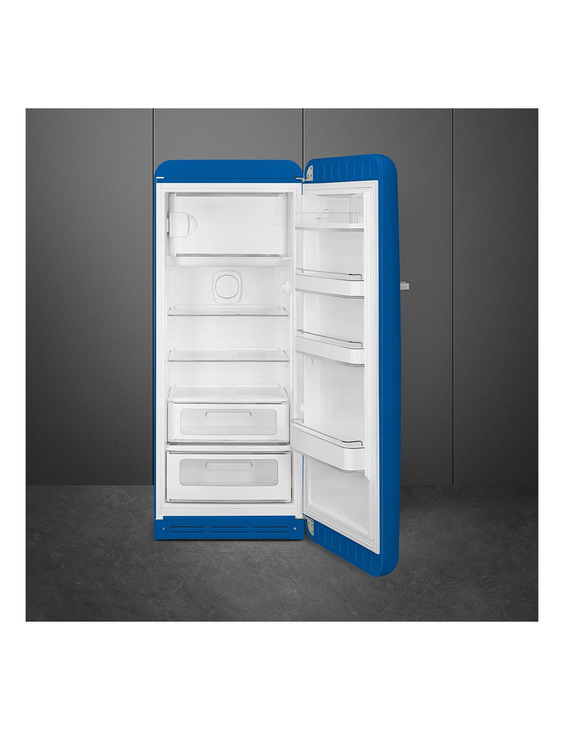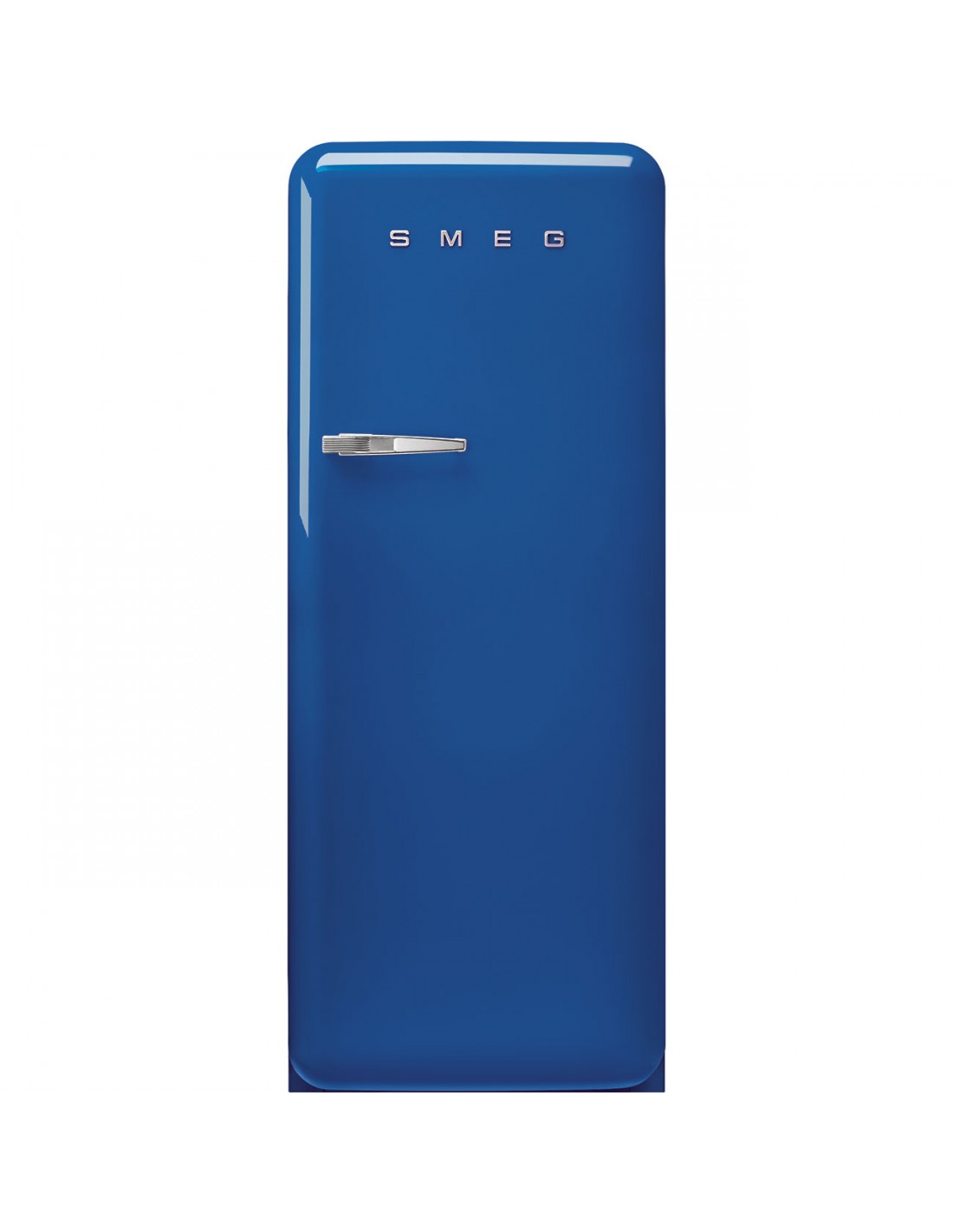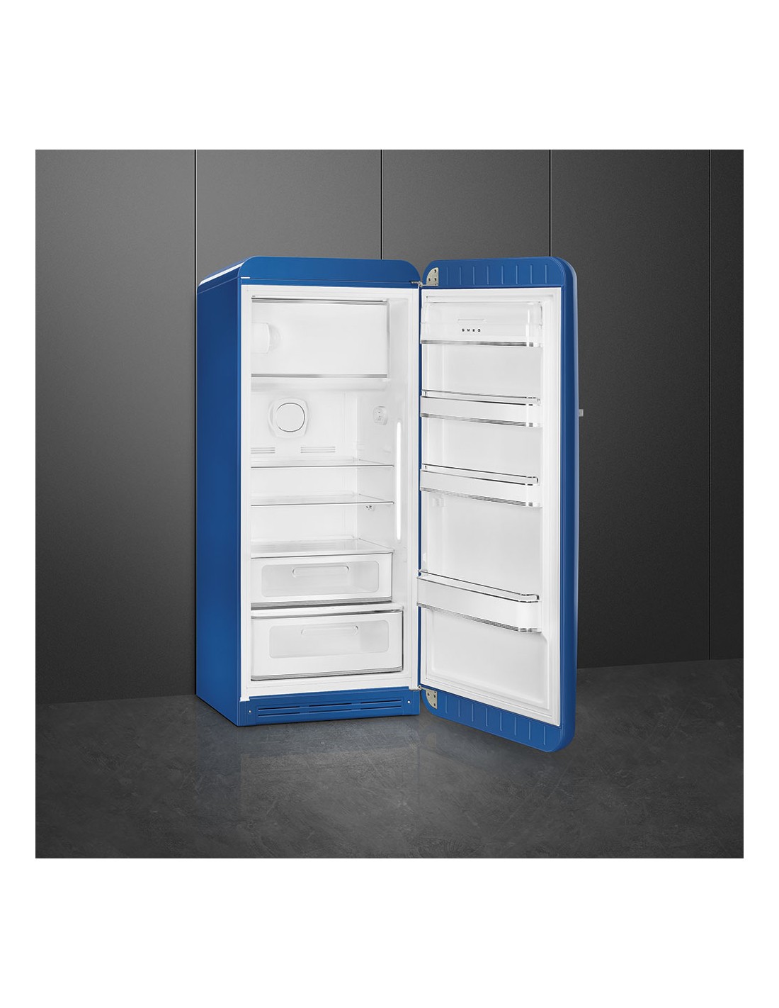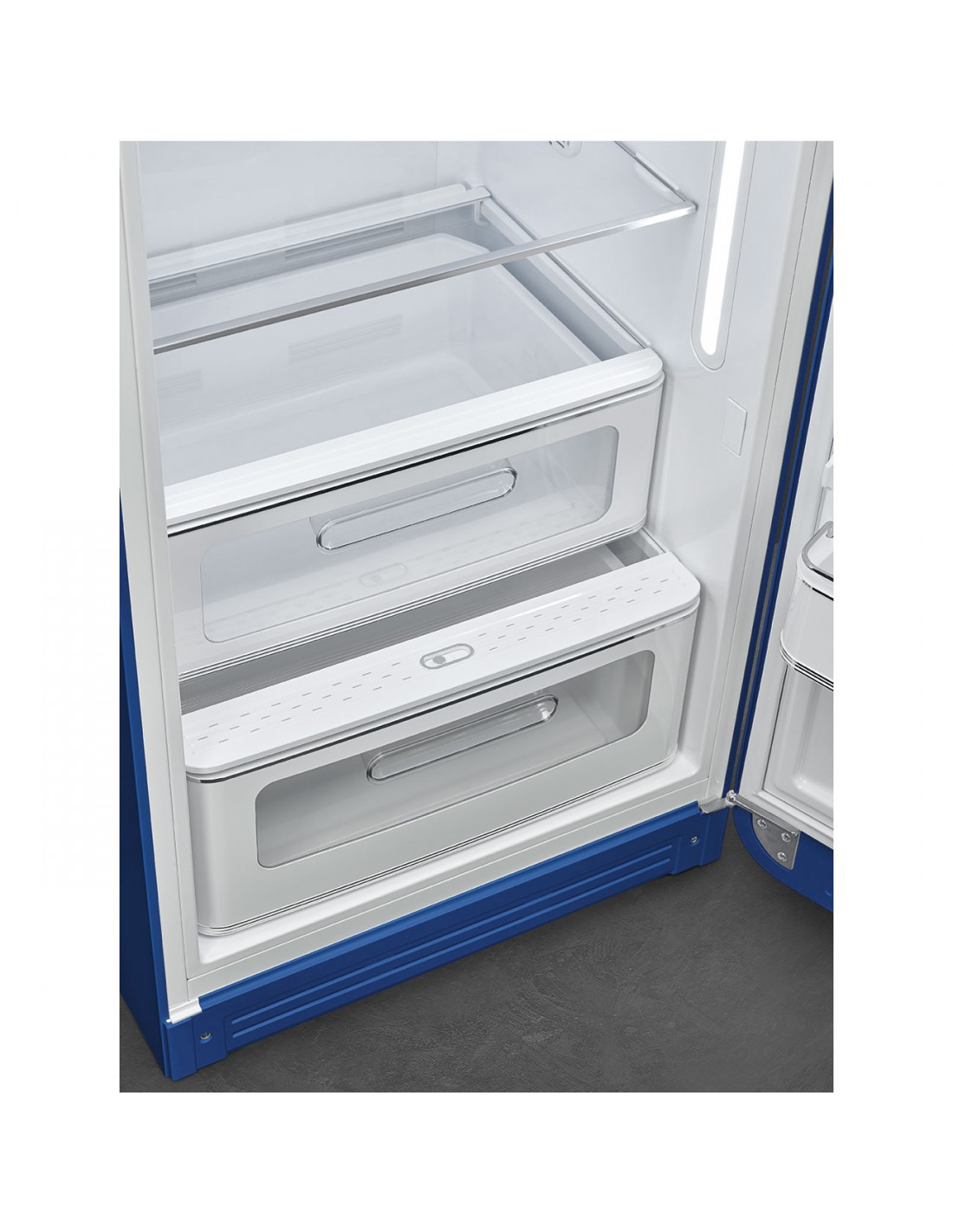 Smeg FAB28RBE6. Capacità netta frigorifero: 244 L, Classe climatica: SN-T, Emissione acustica: 35 dB. Numero di ripiani frigorifero: 2, Numero di cassetti per verdura: 1. Tipo di lampada: LED. Cerniera porta: Destra. Consumo energetico annuo: 104 kWh, Classe efficienza energetica: D. Peso: 73,5 kg. Colore del prodotto: Blu