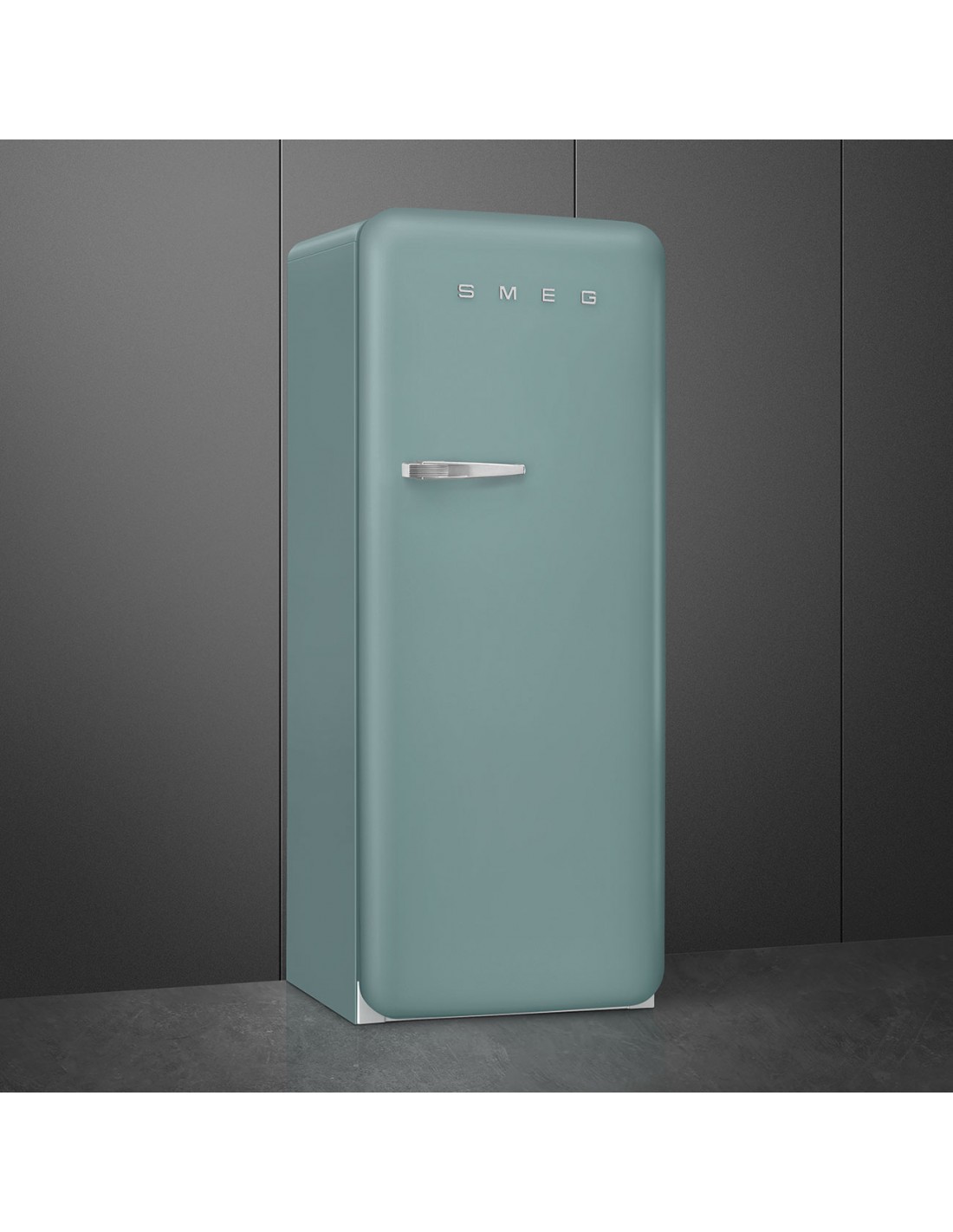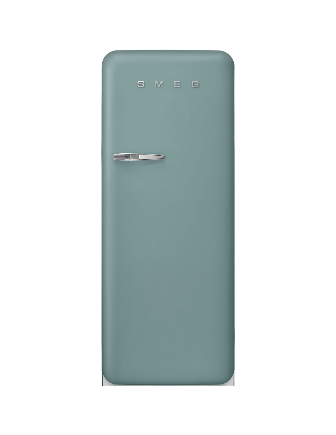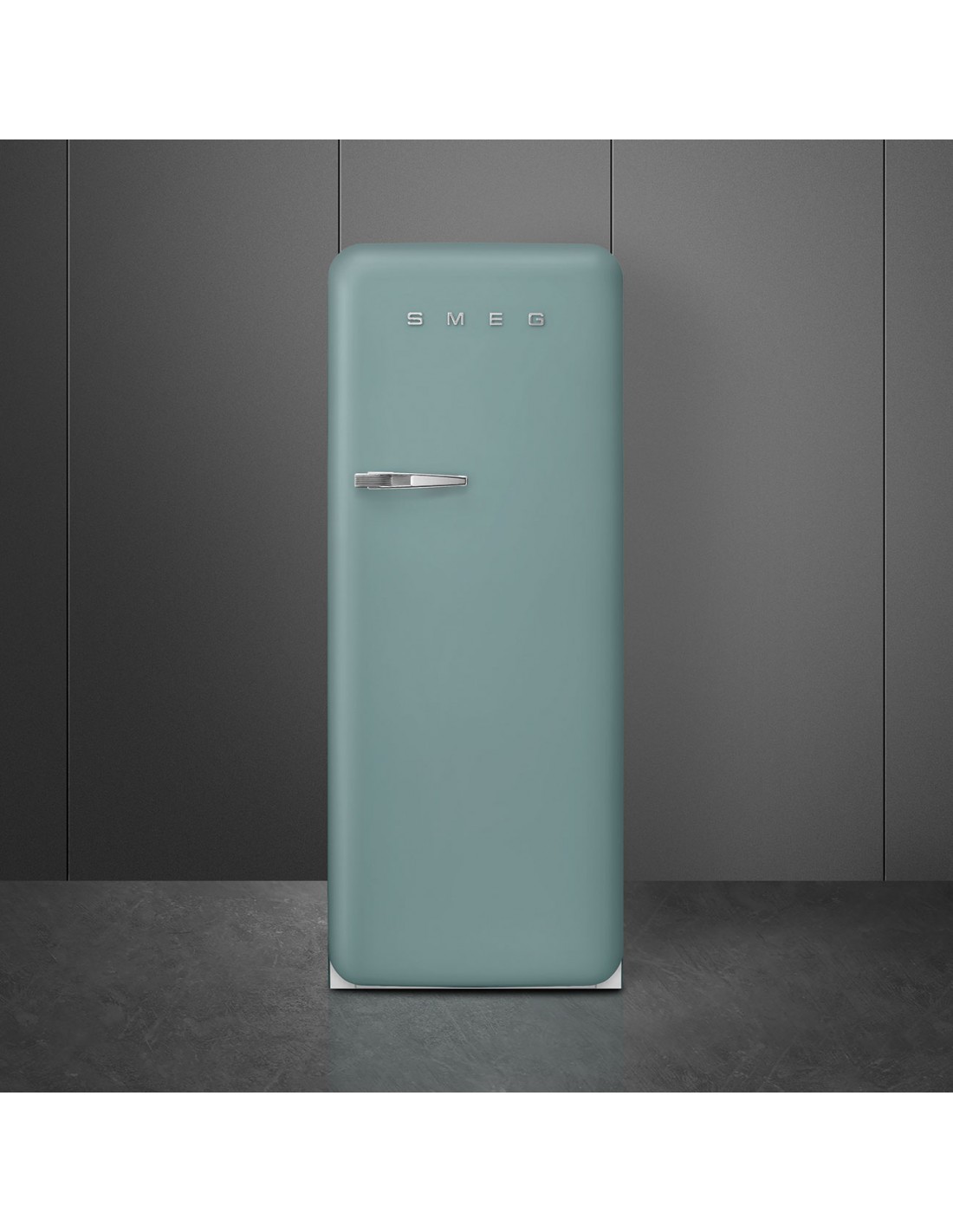 Smeg FAB28RDEG6. Capacità netta frigorifero: 244 L, Classe climatica: SN-T, Emissione acustica: 35 dB. Numero di ripiani frigorifero: 2, Numero di cassetti per verdura: 1. Tipo di lampada: LED. Cerniera porta: Destra. Consumo energetico annuo: 104 kWh, Classe efficienza energetica: D. Peso: 73,5 kg. Colore del prodotto: Verde