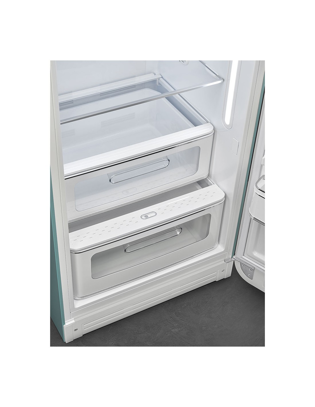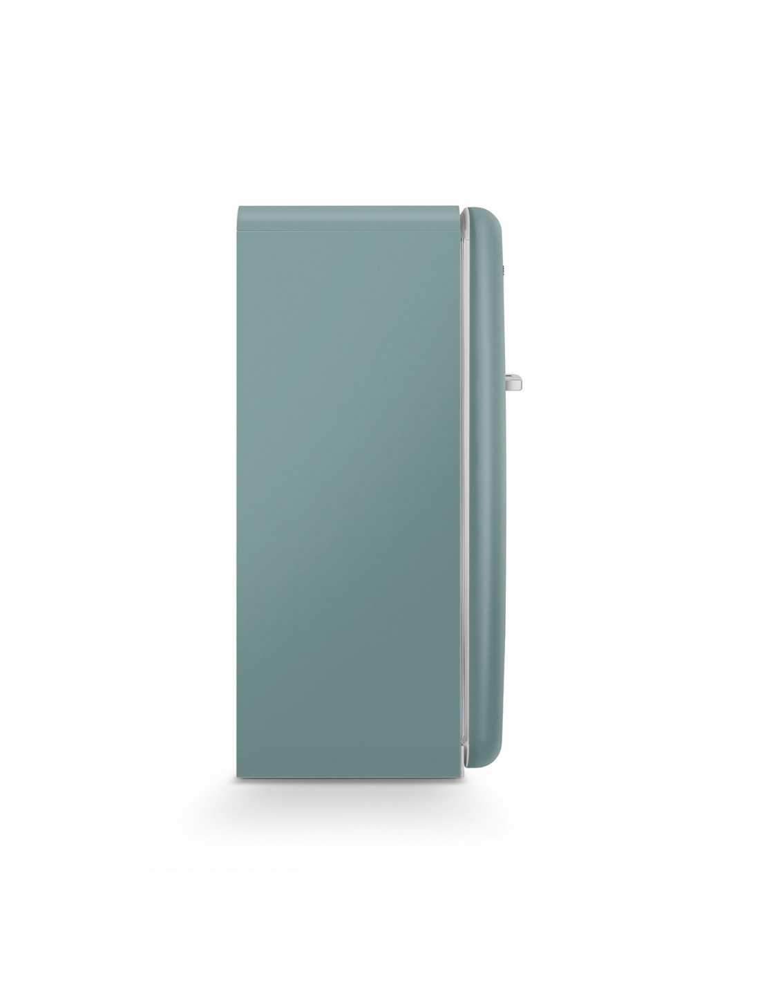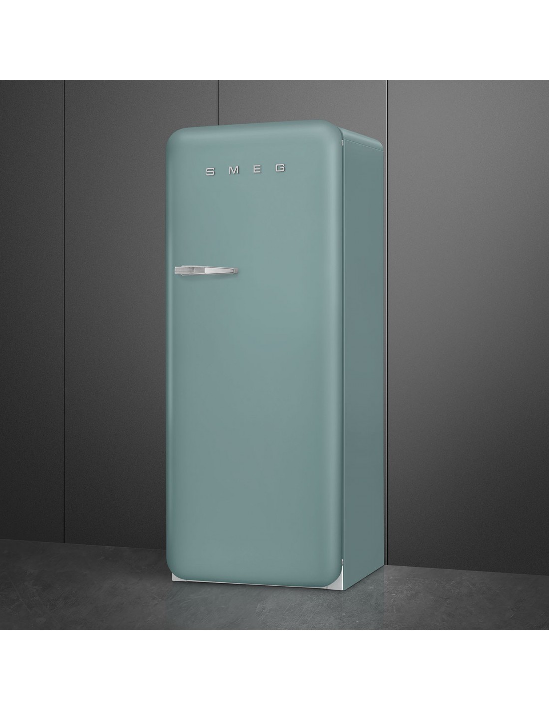 Smeg FAB28RDEG6. Capacità netta frigorifero: 244 L, Classe climatica: SN-T, Emissione acustica: 35 dB. Numero di ripiani frigorifero: 2, Numero di cassetti per verdura: 1. Tipo di lampada: LED. Cerniera porta: Destra. Consumo energetico annuo: 104 kWh, Classe efficienza energetica: D. Peso: 73,5 kg. Colore del prodotto: Verde