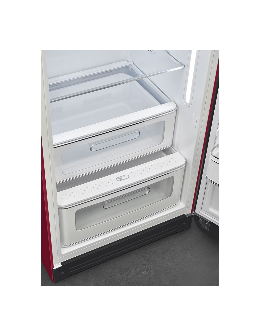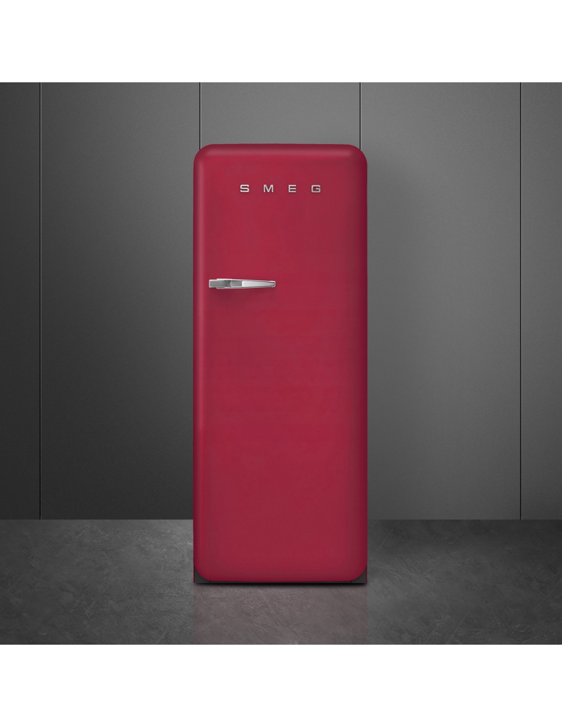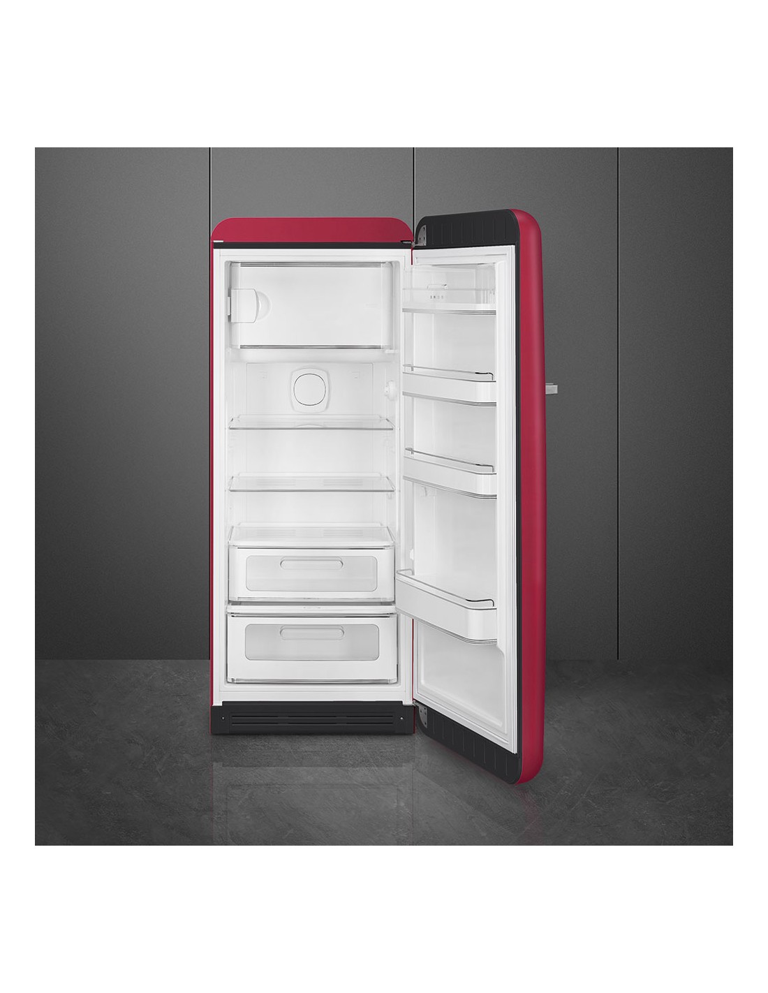 Smeg FAB28RDRB6. Capacità netta frigorifero: 244 L, Classe climatica: SN-T, Emissione acustica: 35 dB. Numero di ripiani frigorifero: 2, Numero di cassetti per verdura: 1. Tipo di lampada: LED. Cerniera porta: Destra. Consumo energetico annuo: 104 kWh, Classe efficienza energetica: D. Peso: 73,5 kg. Colore del prodotto: Rosso