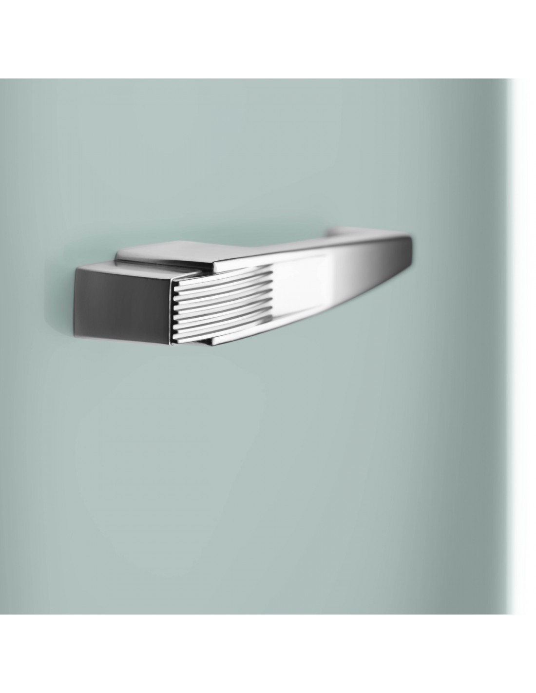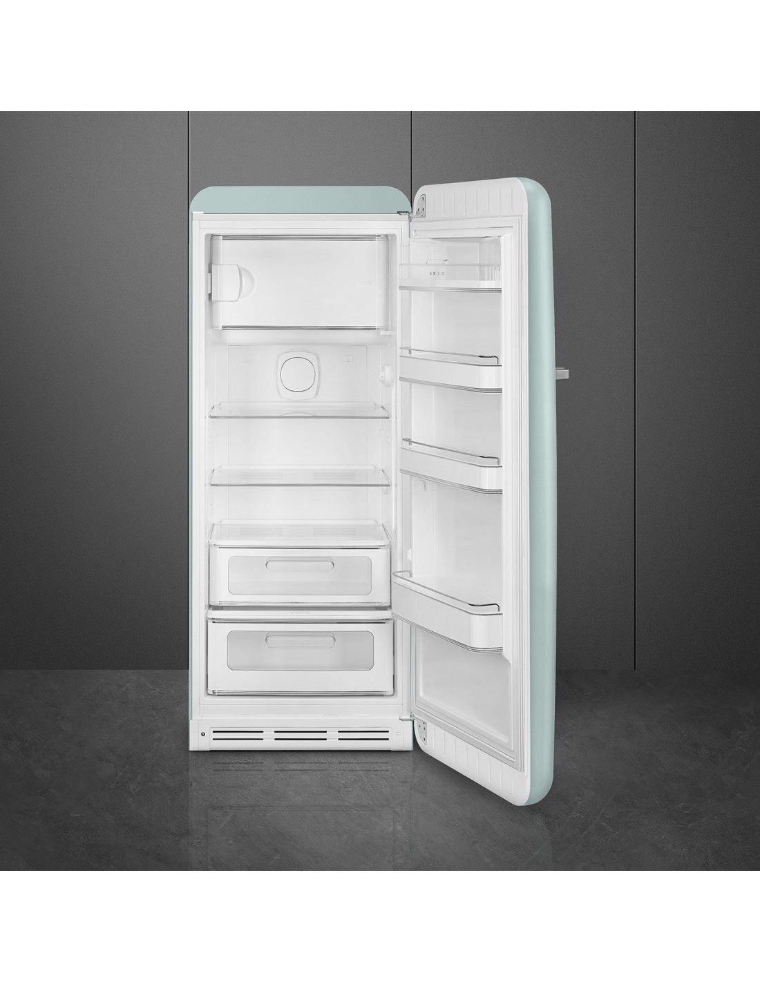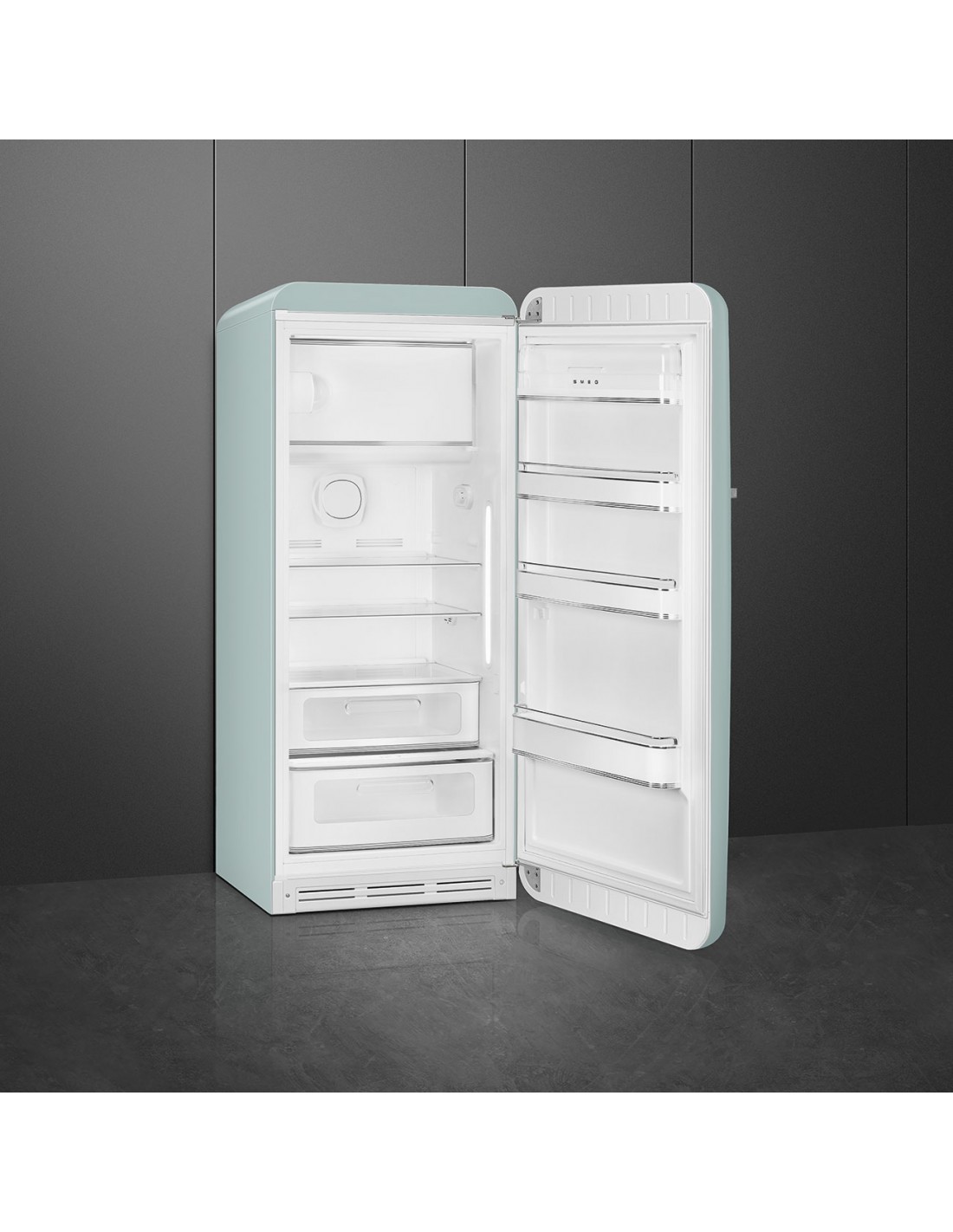 Smeg FAB28RDSA6. Capacità netta frigorifero: 244 L, Classe climatica: SN-T, Emissione acustica: 35 dB. Numero di ripiani frigorifero: 2, Numero di cassetti per verdura: 1. Tipo di lampada: LED. Cerniera porta: Destra. Consumo energetico annuo: 104 kWh, Classe efficienza energetica: D. Peso: 73,5 kg. Colore del prodotto: Verde