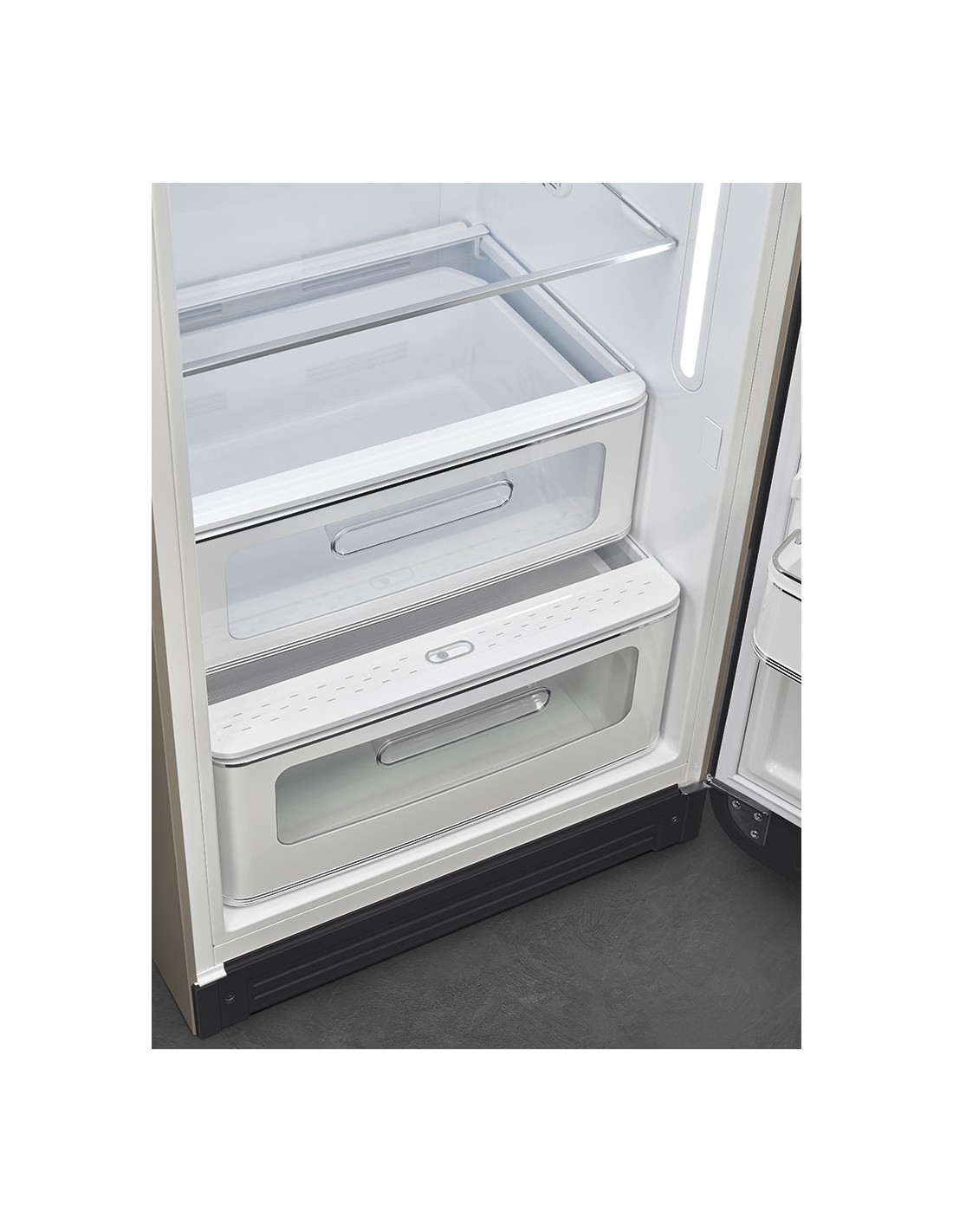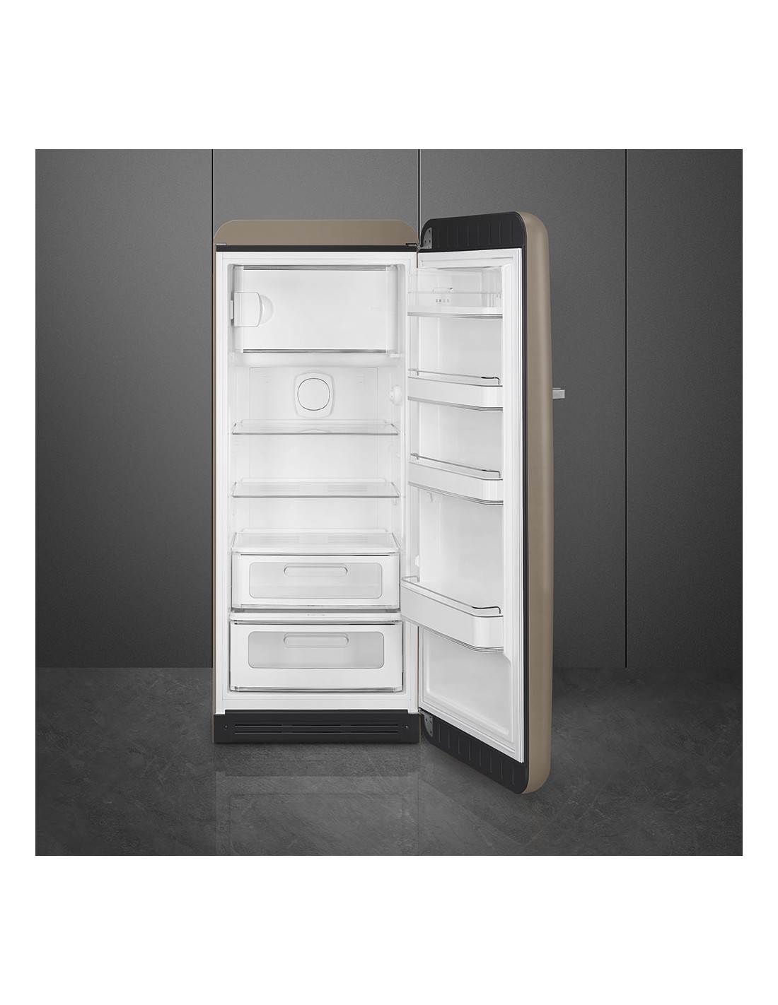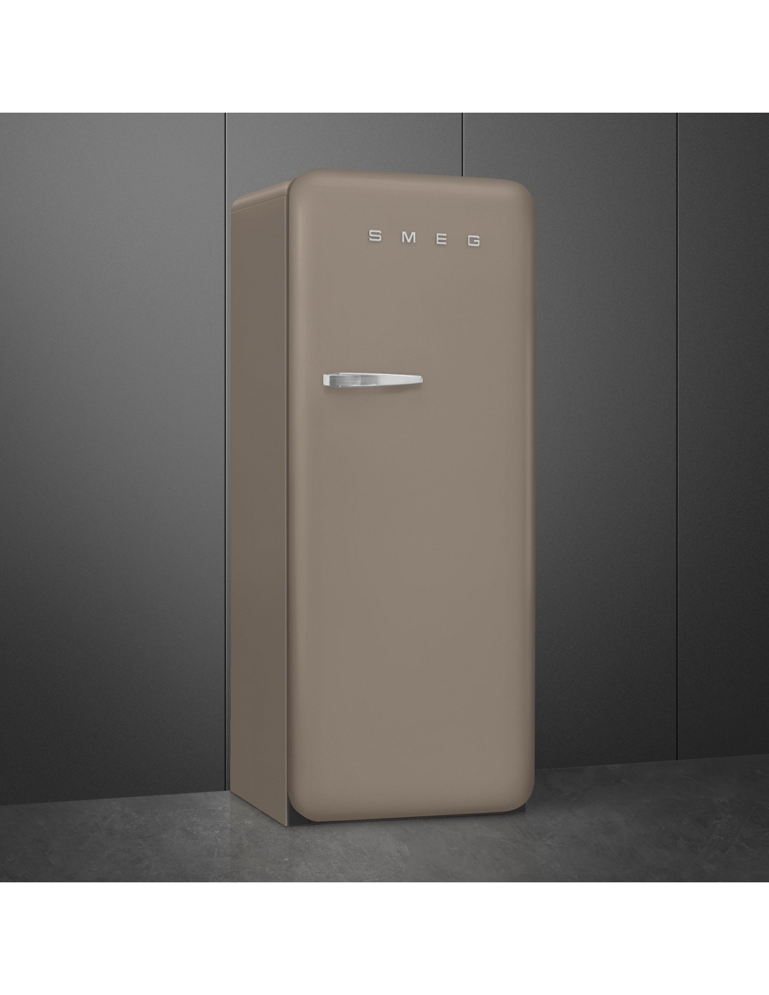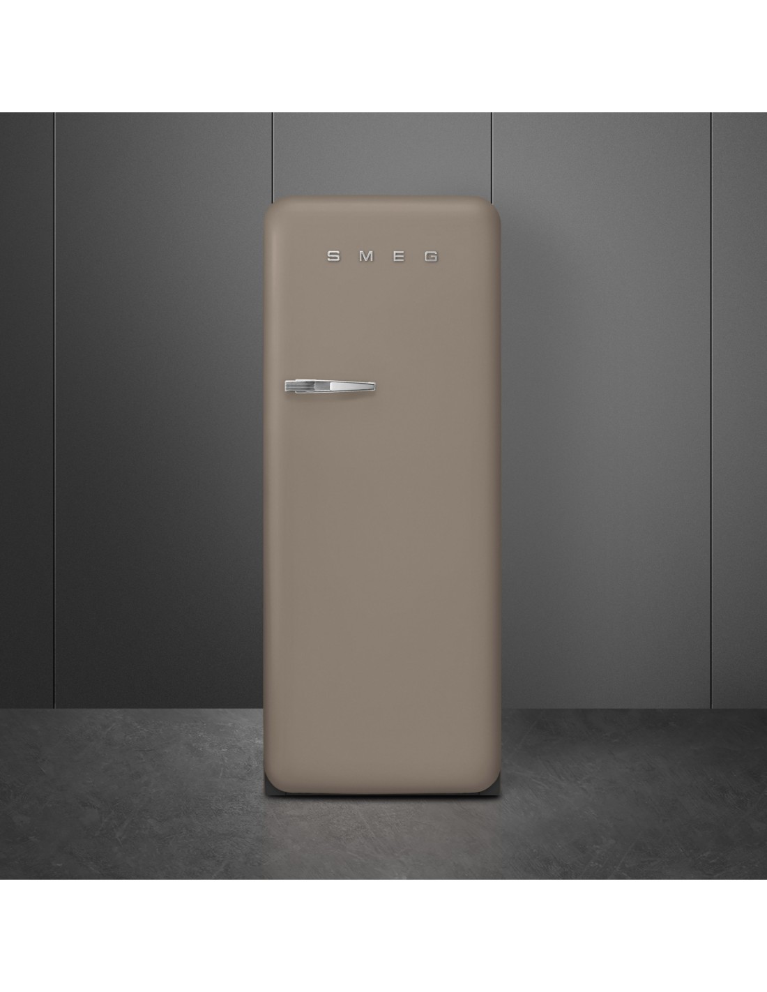Smeg FAB28RDTP6. Classe climatica: SN-T, Emissione acustica: 35 dB. Numero di ripiani frigorifero: 2, Numero di cassetti per verdura: 1. Tipo di lampada: LED. Cerniera porta: Destra. Consumo energetico annuo: 104 kWh, Classe efficienza energetica: D. Peso: 73,5 kg. Colore del prodotto: Grigio