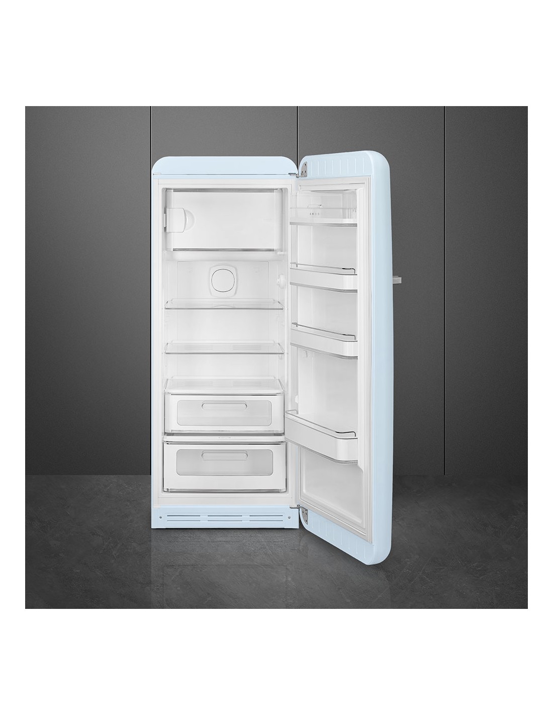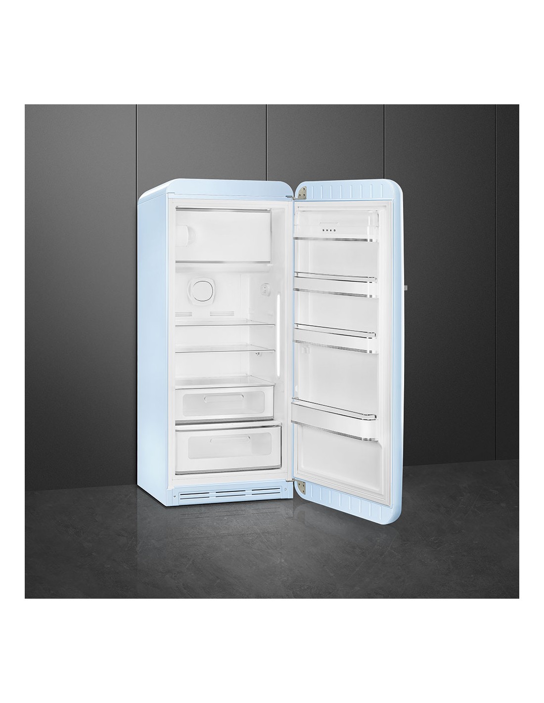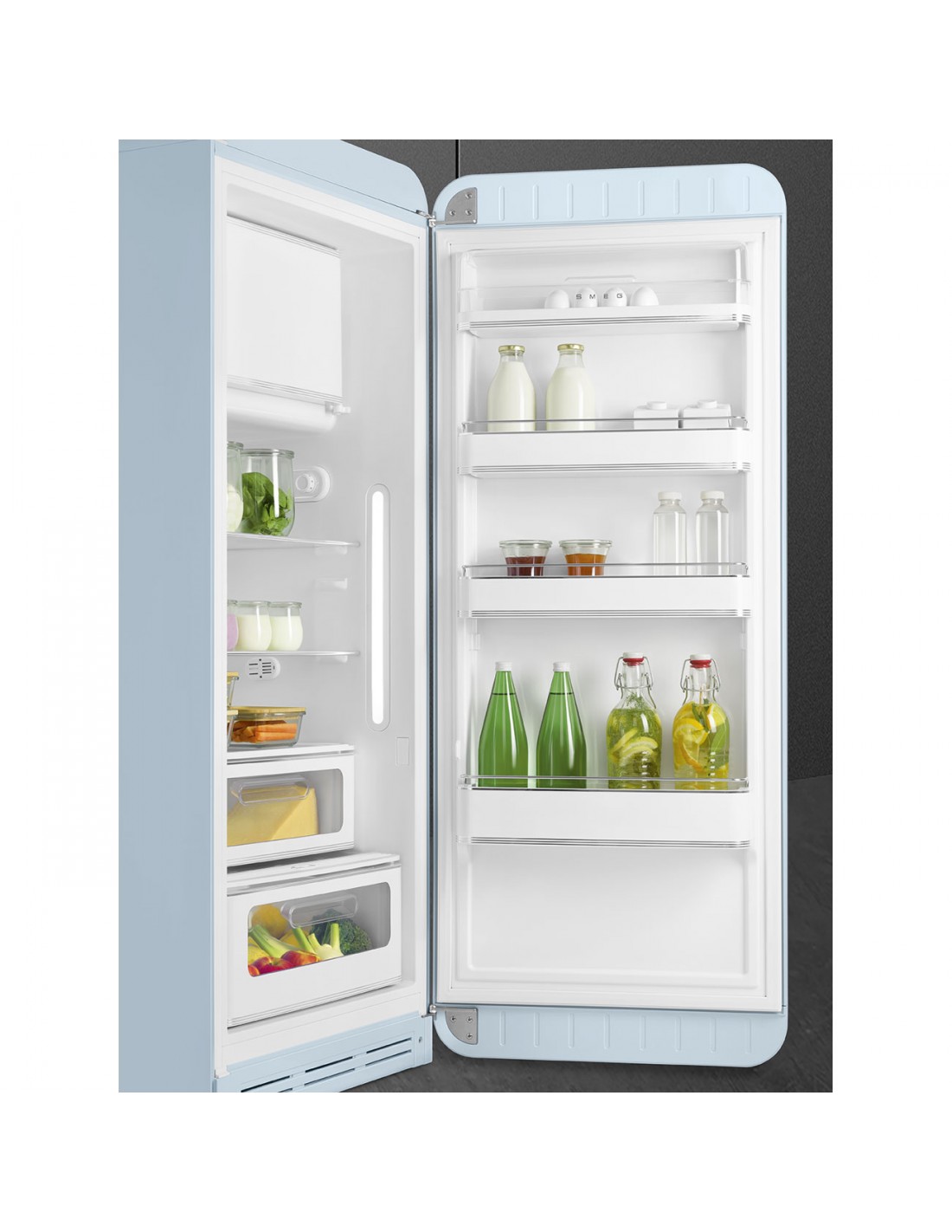 Smeg FAB28RPB6. Classe climatica: SN-T, Emissione acustica: 35 dB. Numero di ripiani frigorifero: 2, Numero di cassetti per verdura: 1. Tipo di lampada: LED. Cerniera porta: Destra. Consumo energetico annuo: 104 kWh, Classe efficienza energetica: D. Peso: 73,5 kg. Colore del prodotto: Blu