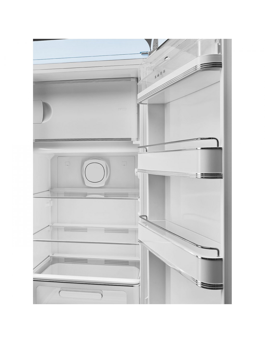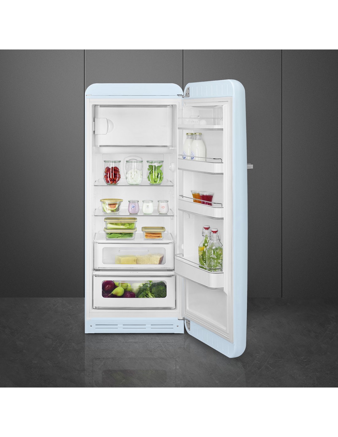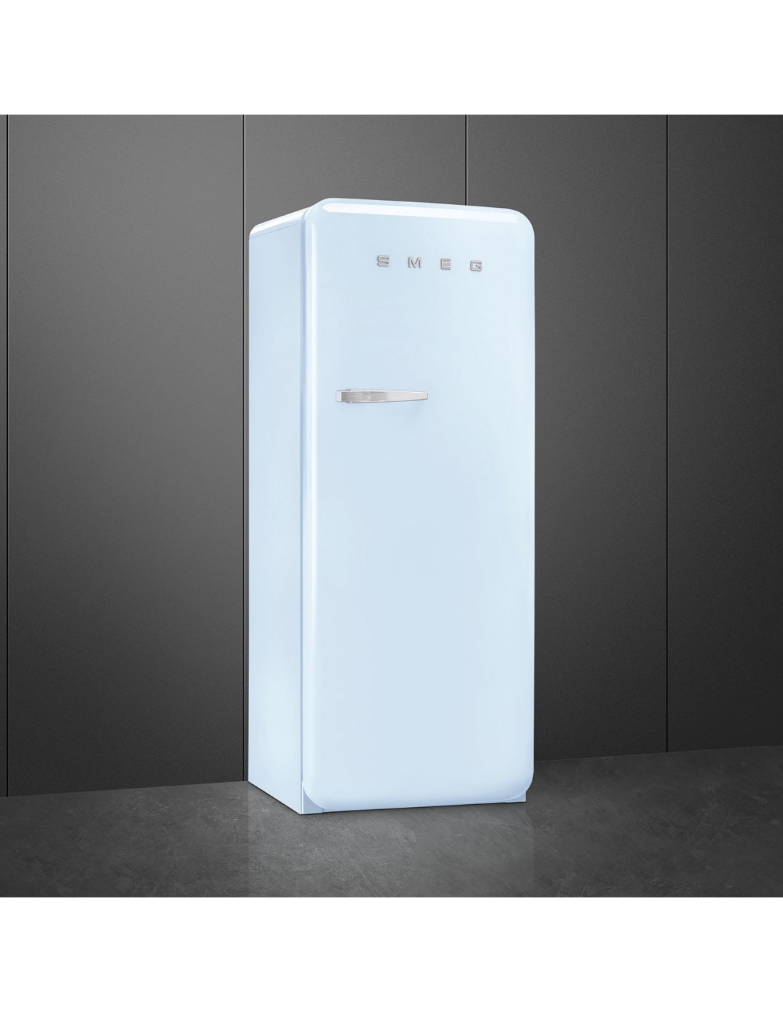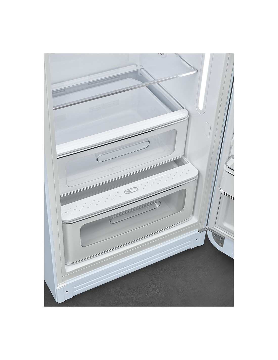 Smeg FAB28RPB6. Classe climatica: SN-T, Emissione acustica: 35 dB. Numero di ripiani frigorifero: 2, Numero di cassetti per verdura: 1. Tipo di lampada: LED. Cerniera porta: Destra. Consumo energetico annuo: 104 kWh, Classe efficienza energetica: D. Peso: 73,5 kg. Colore del prodotto: Blu