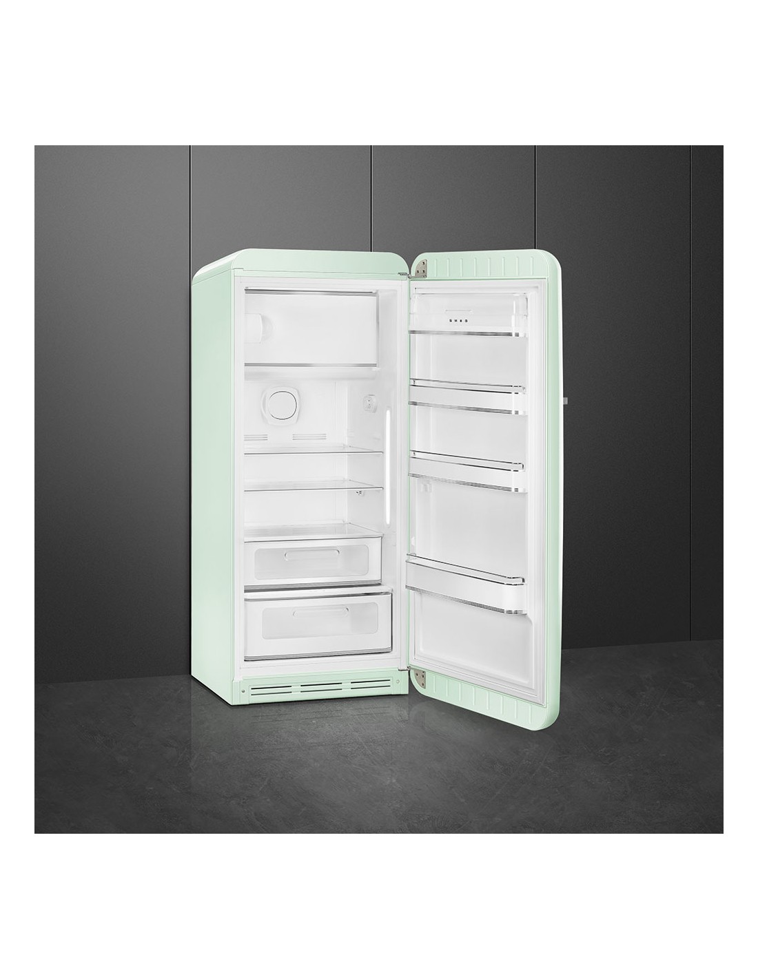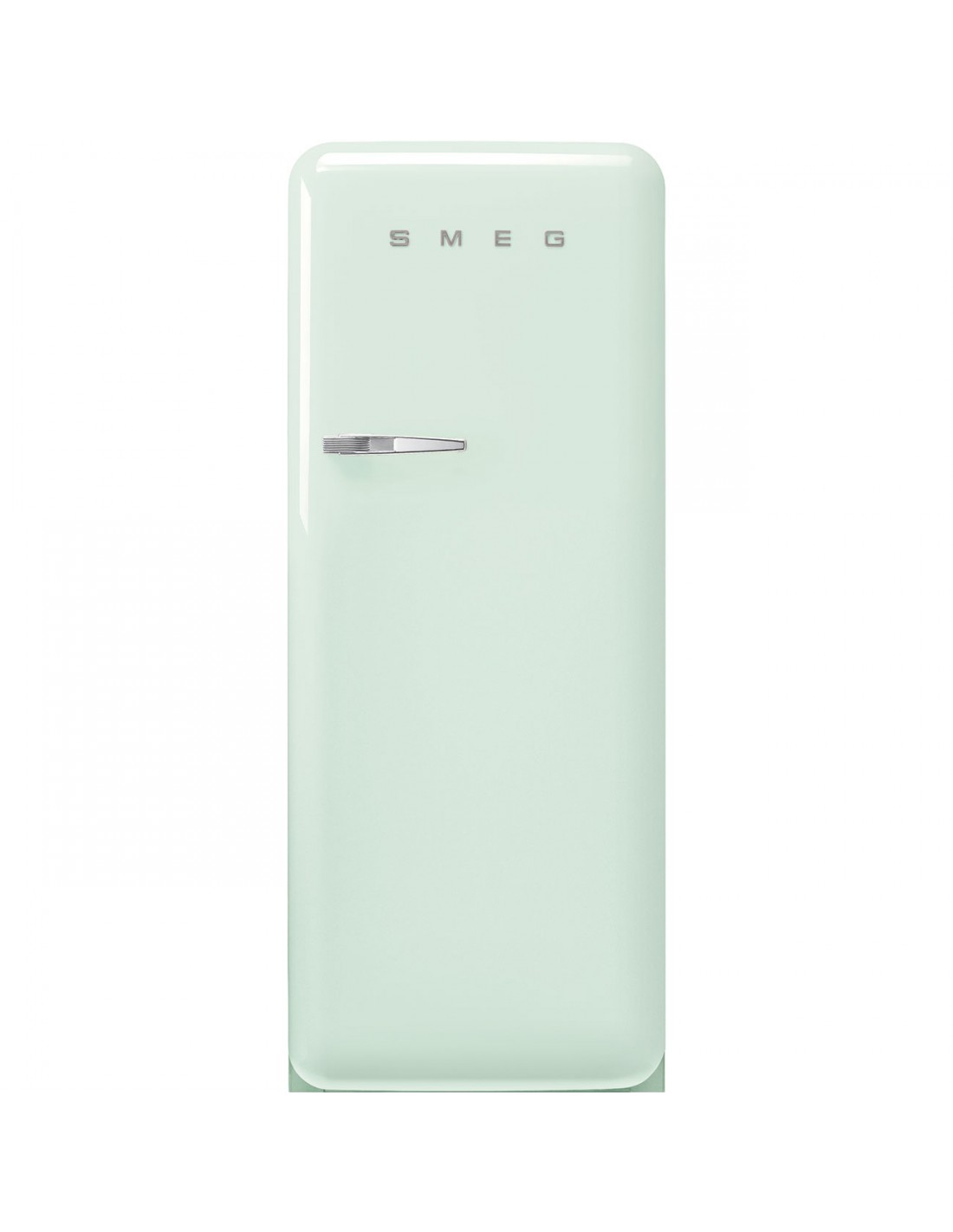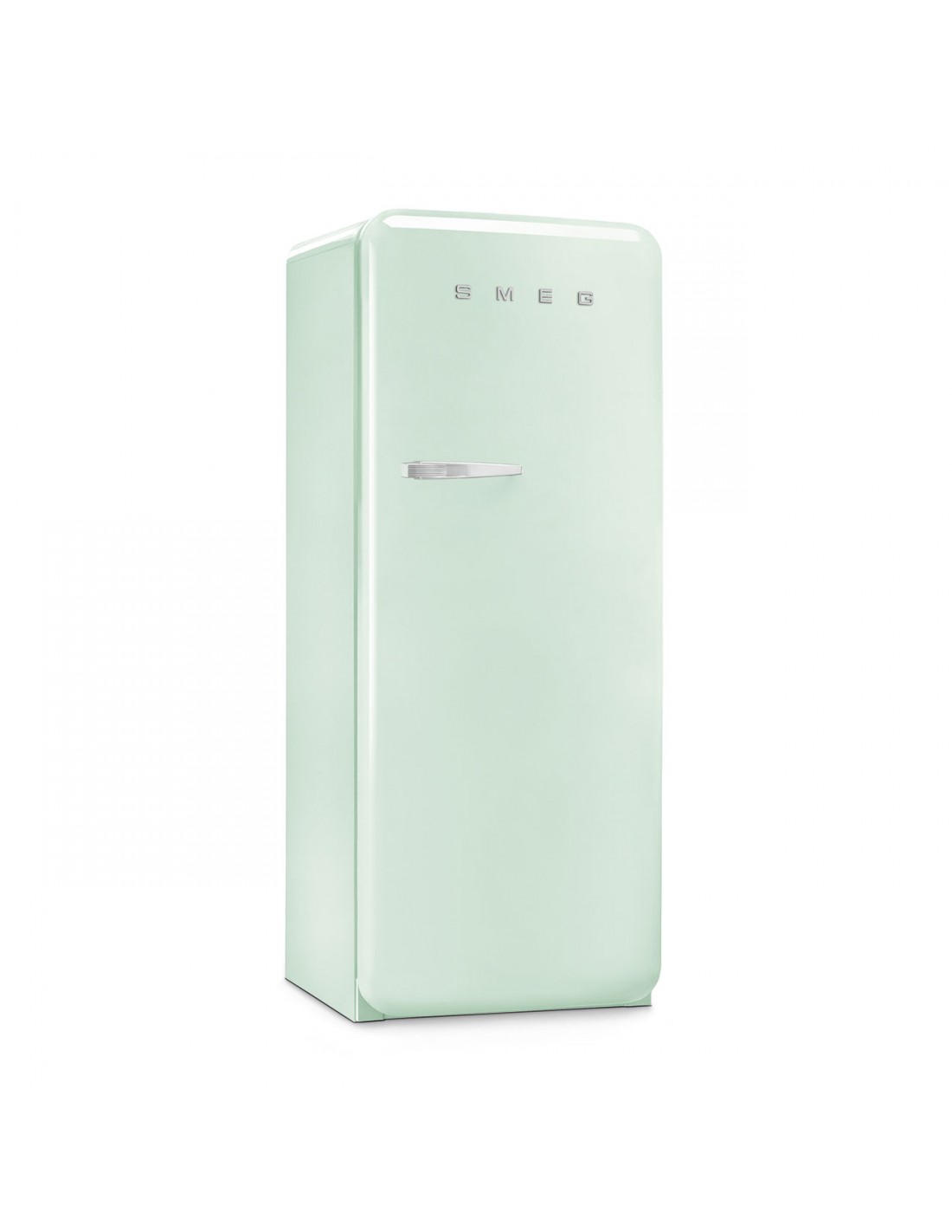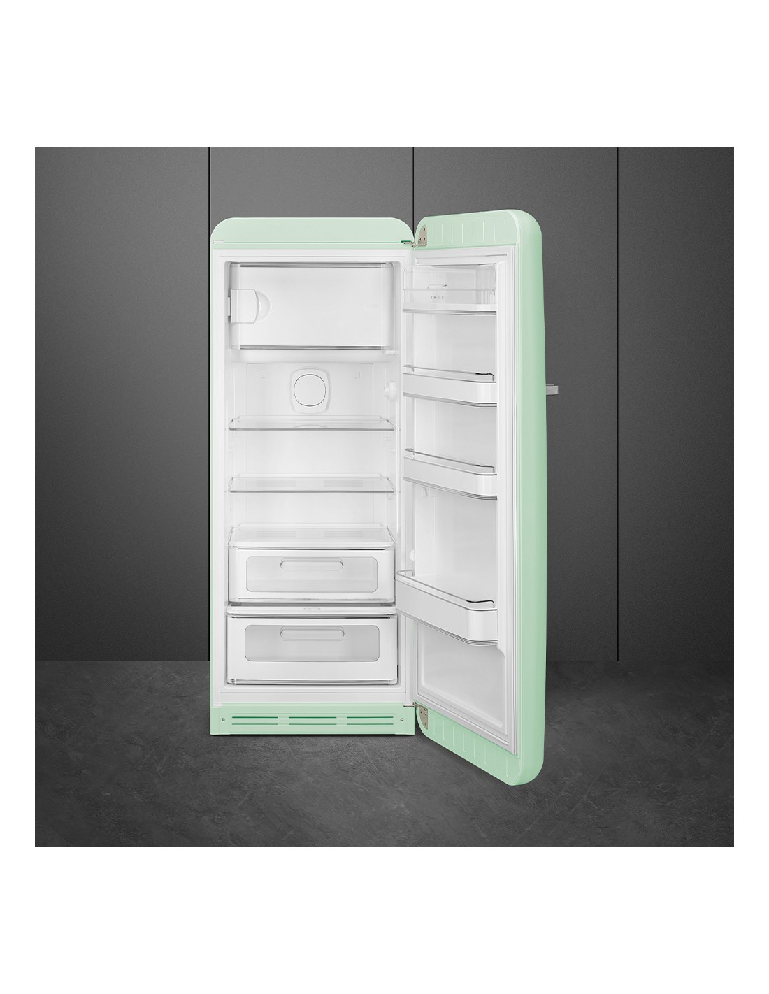 Smeg FAB28RPG6. Capacità netta frigorifero: 244 L, Classe climatica: SN-T, Emissione acustica: 35 dB. Numero di ripiani frigorifero: 2, Numero di cassetti per verdura: 1. Tipo di lampada: LED. Cerniera porta: Destra. Consumo energetico annuo: 104 kWh, Classe efficienza energetica: D. Peso: 73,5 kg. Colore del prodotto: Verde