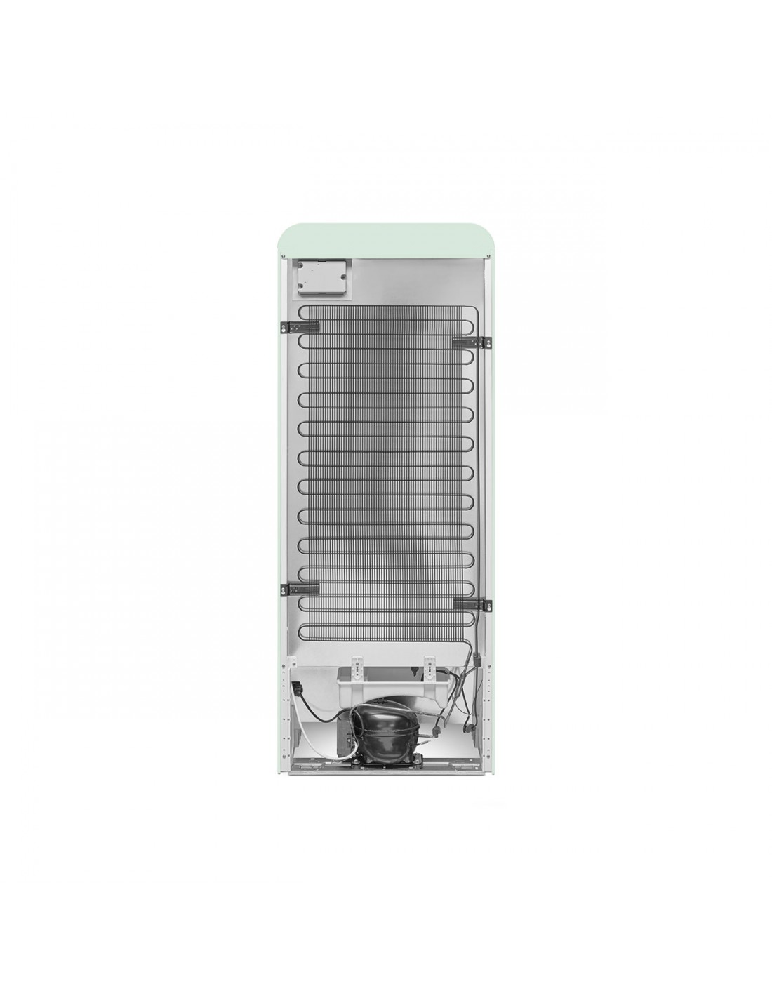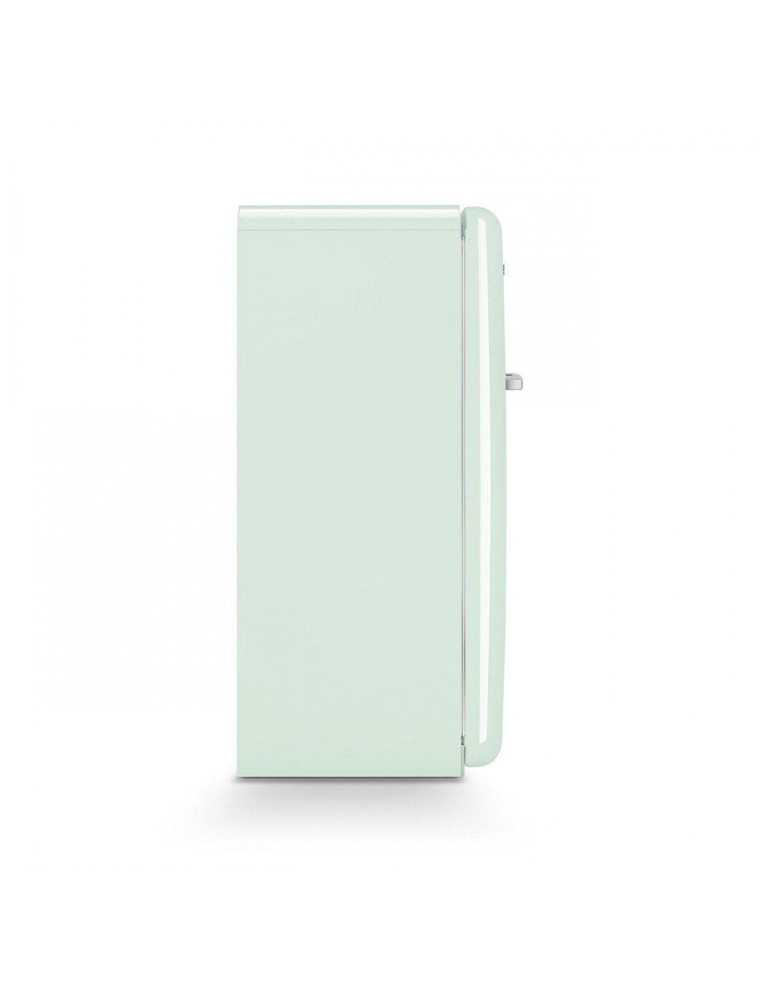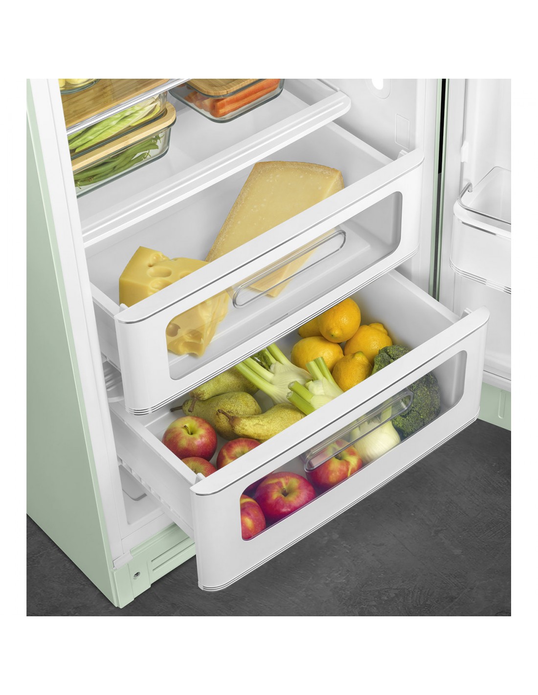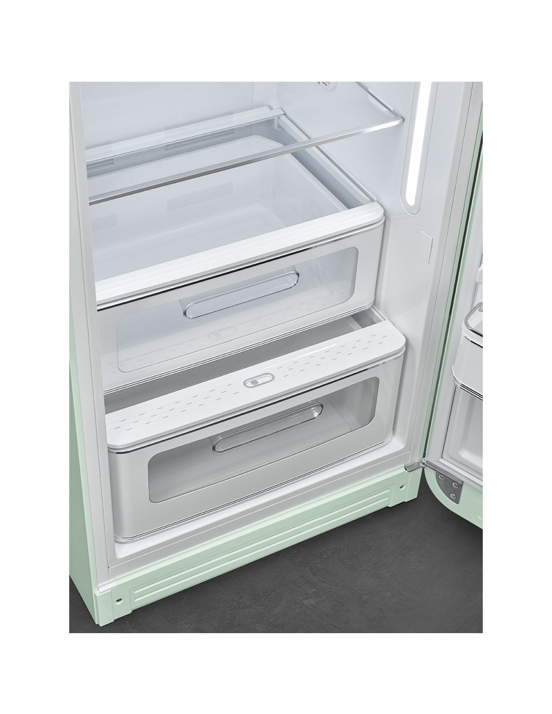 Smeg FAB28RPG6. Capacità netta frigorifero: 244 L, Classe climatica: SN-T, Emissione acustica: 35 dB. Numero di ripiani frigorifero: 2, Numero di cassetti per verdura: 1. Tipo di lampada: LED. Cerniera porta: Destra. Consumo energetico annuo: 104 kWh, Classe efficienza energetica: D. Peso: 73,5 kg. Colore del prodotto: Verde