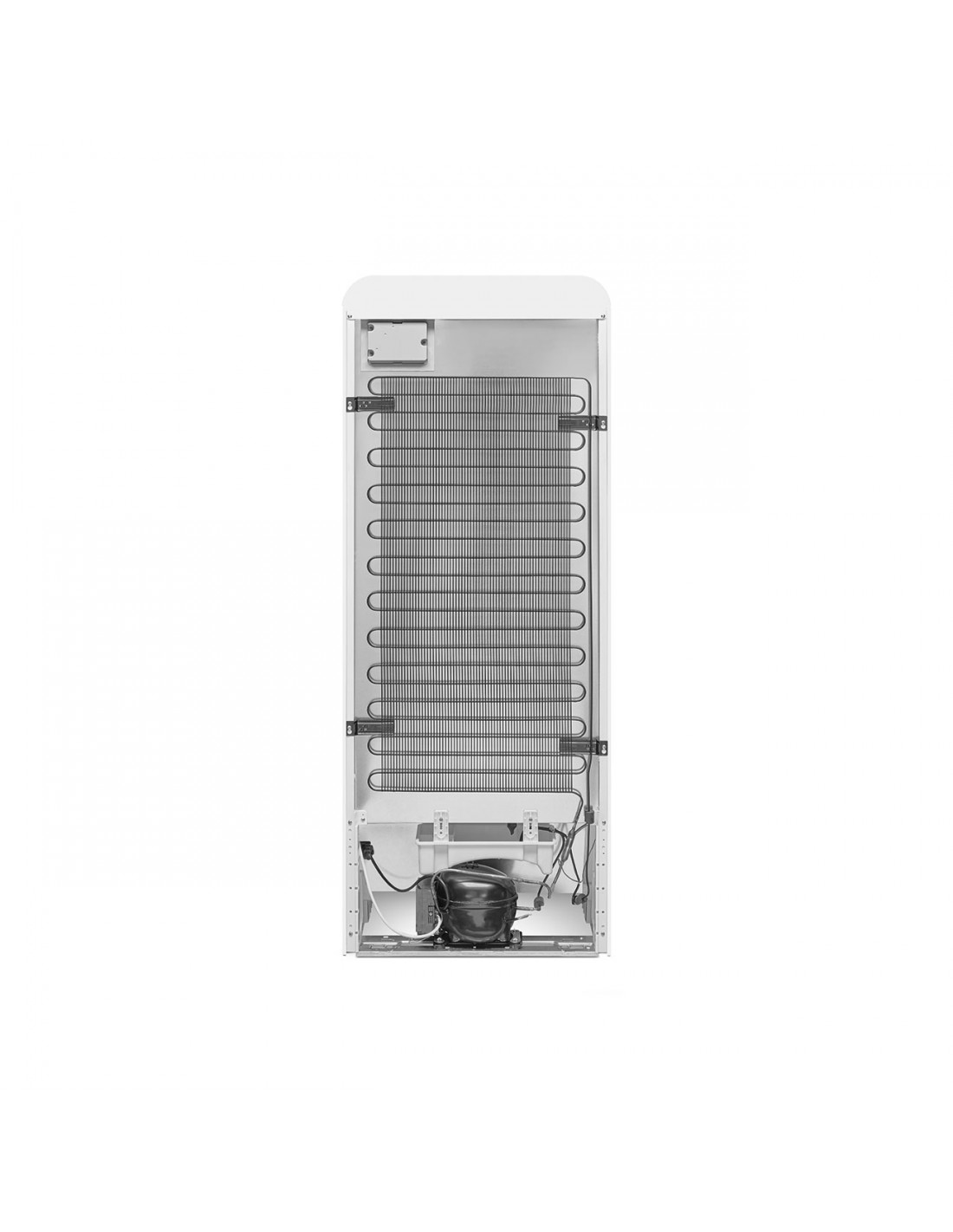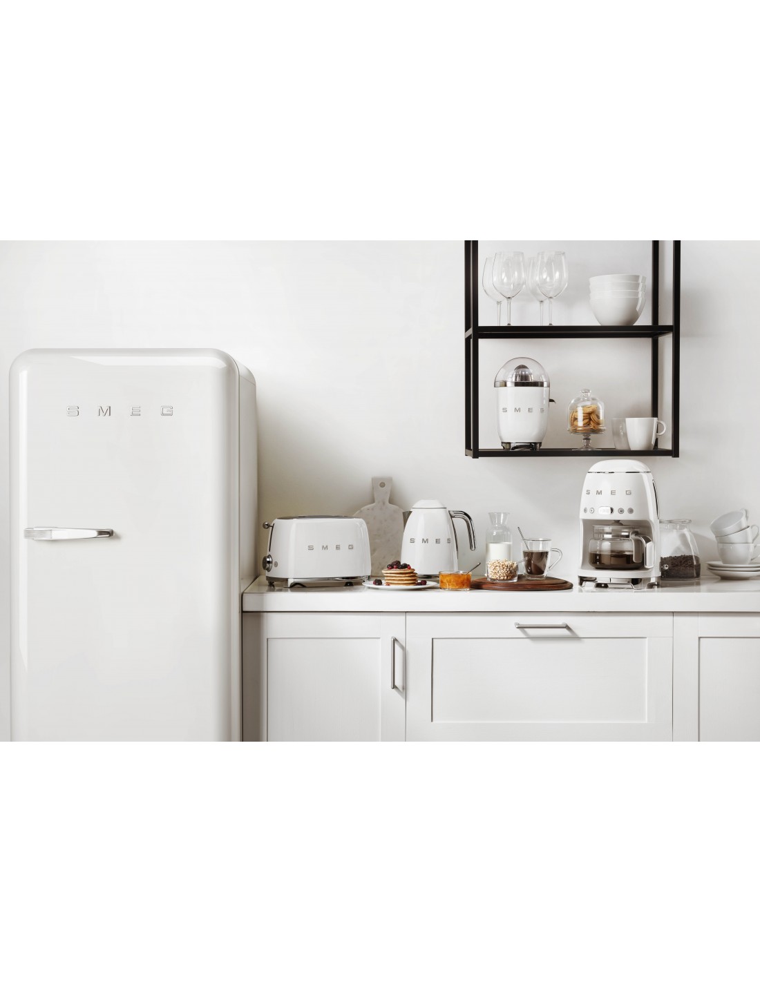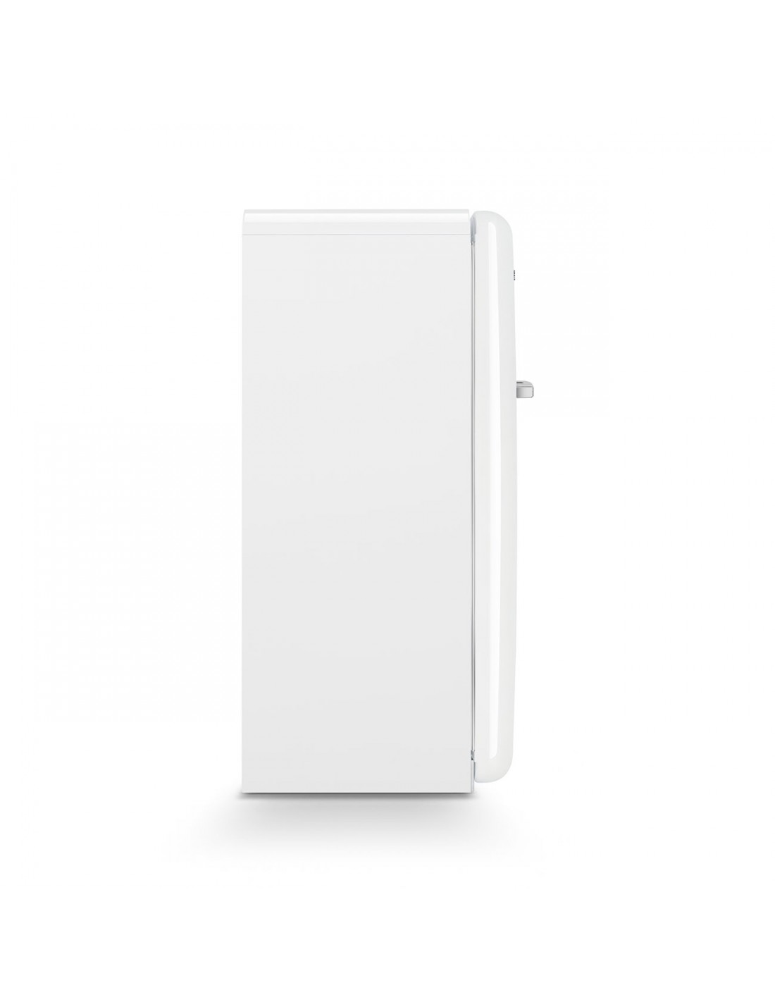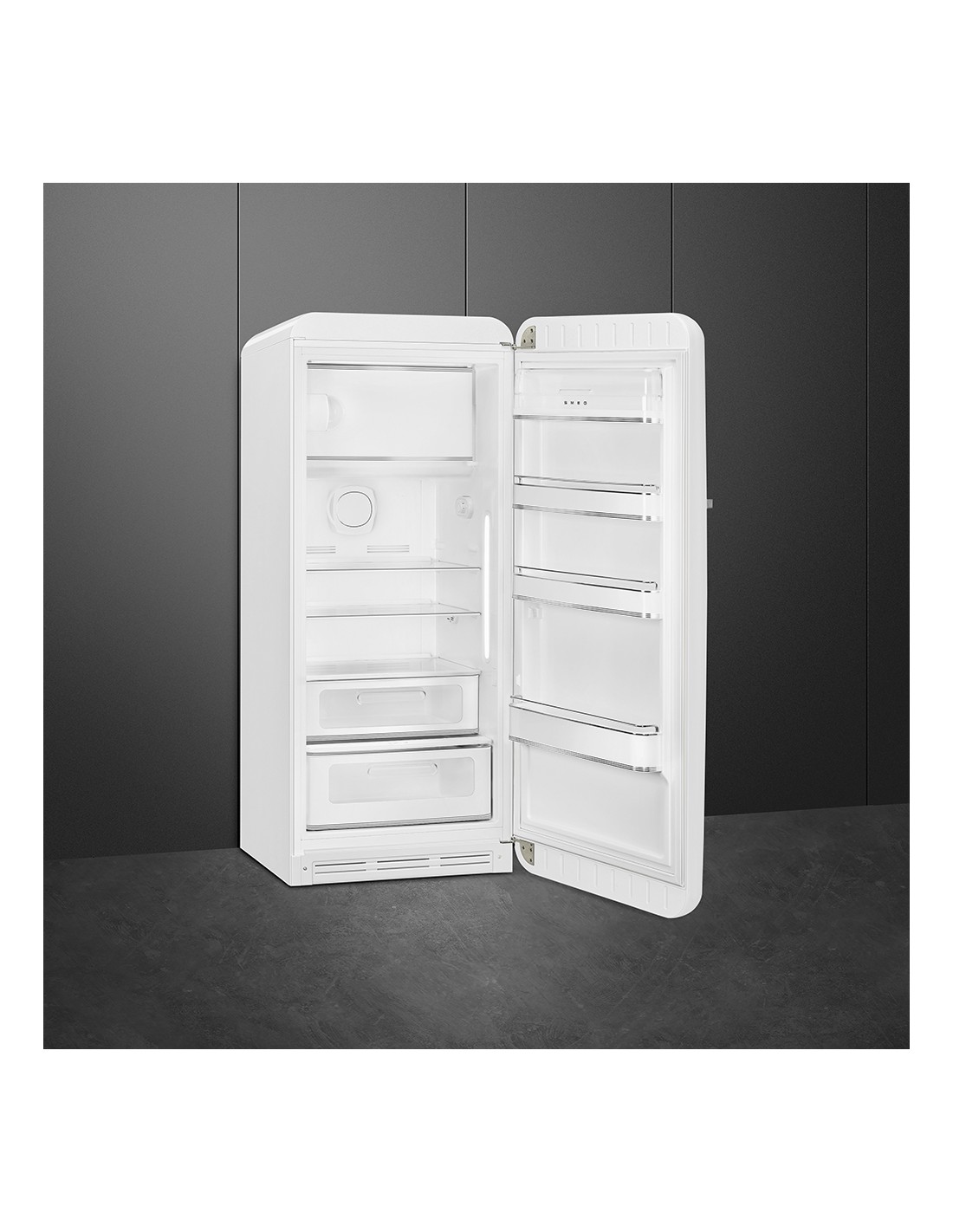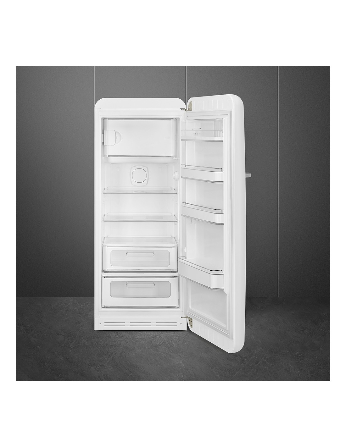 Smeg FAB28RWH6. Capacità netta frigorifero: 244 L, Classe climatica: SN-T, Emissione acustica: 35 dB. Numero di ripiani frigorifero: 2, Numero di cassetti per verdura: 1. Tipo di lampada: LED. Cerniera porta: Destra. Consumo energetico annuo: 104 kWh, Classe efficienza energetica: D. Peso: 70 kg. Colore del prodotto: Bianco