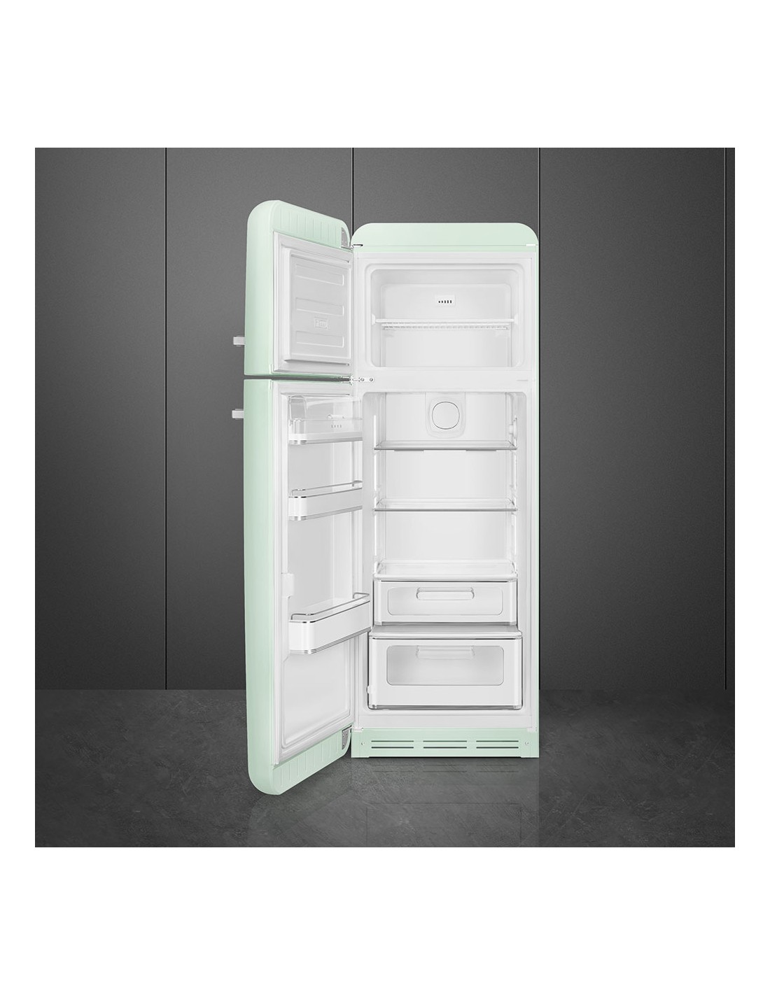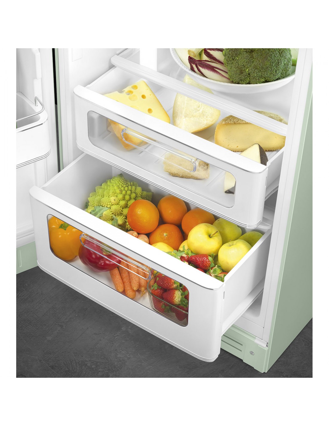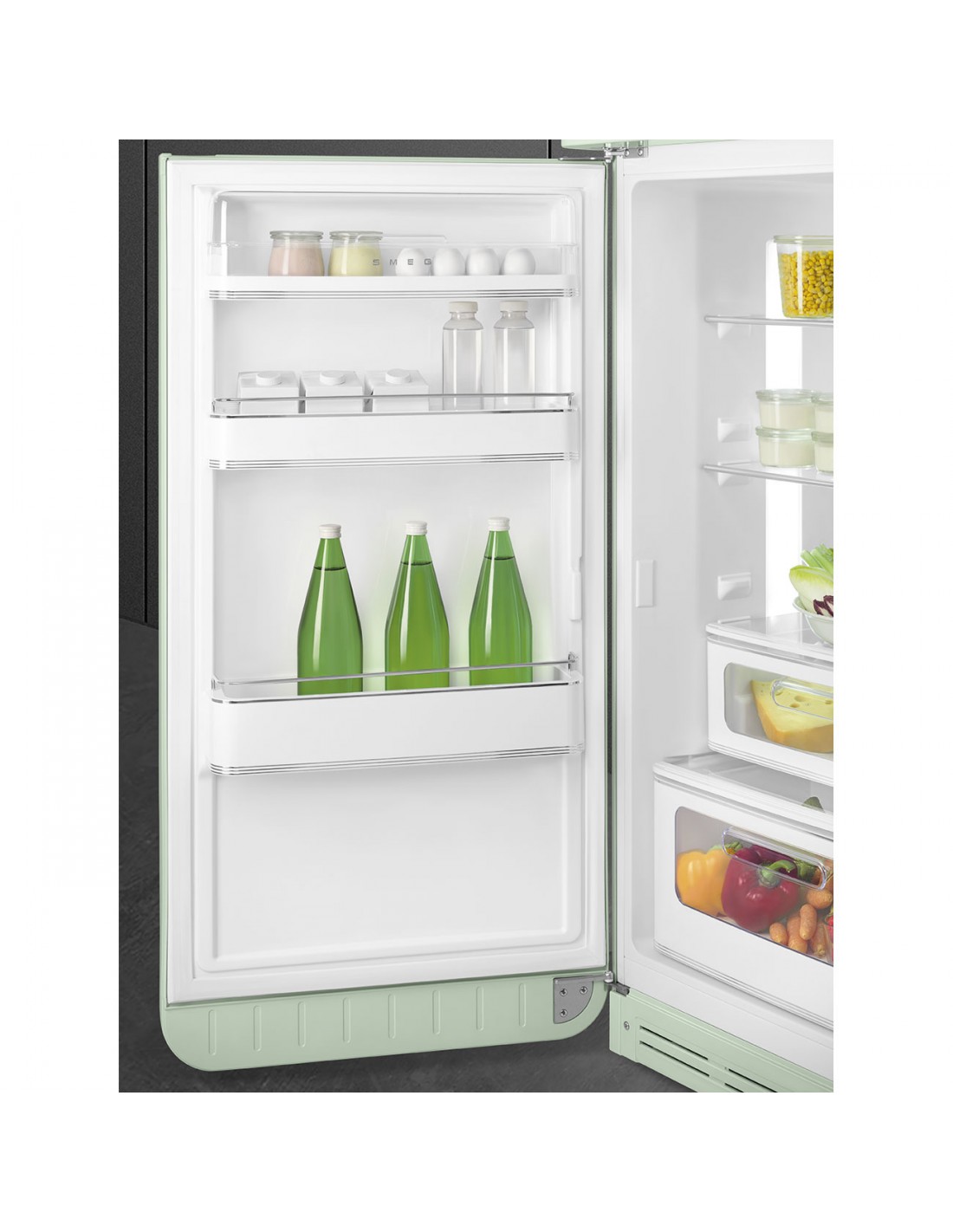 Smeg FAB30LPG6. Capacità netta totale: 294 L. Cerniera porta: Sinistra. Classe climatica: SN-T, Emissione acustica: 34 dB. Capacità netta frigorifero: 222 L, No Frost (frigorifero), Sistema Multi-Airflow (frigorifero), Luce interna, Numero di ripiani frigorifero: 2. Capacità netta congelatore: 72 L, Capacità di congelamento: 4 kg/24h. Compartimento zona fresca. Classe efficienza energetica: C, Consumo energetico annuo: 135 kWh. Colore del prodotto: Verde