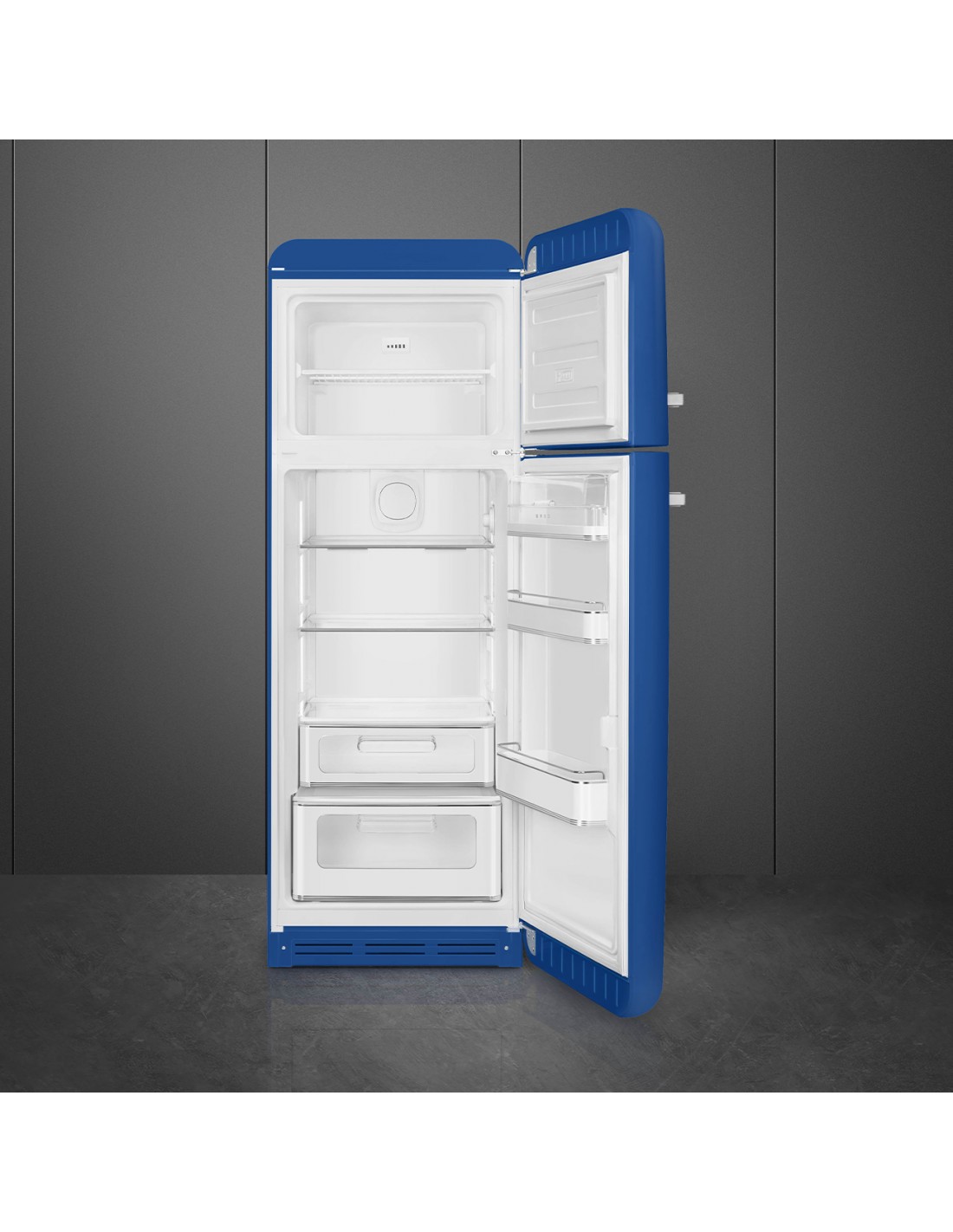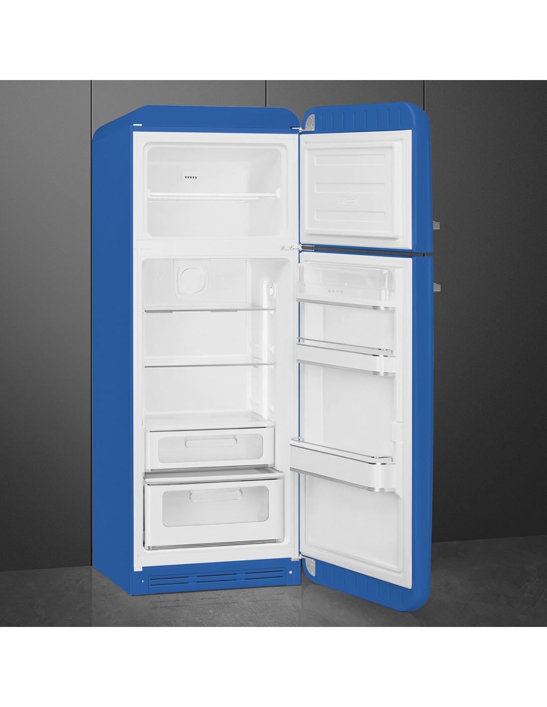 Smeg FAB30RBE6. Capacità netta totale: 294 L. Cerniera porta: Destra. Classe climatica: SN-T, Emissione acustica: 34 dB. Capacità netta frigorifero: 222 L, No Frost (frigorifero), Sistema Multi-Airflow (frigorifero), Luce interna, Numero di ripiani frigorifero: 2. Capacità netta congelatore: 72 L, Capacità di congelamento: 4 kg/24h. Compartimento zona fresca. Classe efficienza energetica: C, Consumo energetico annuo: 135 kWh. Colore del prodotto: Blu
