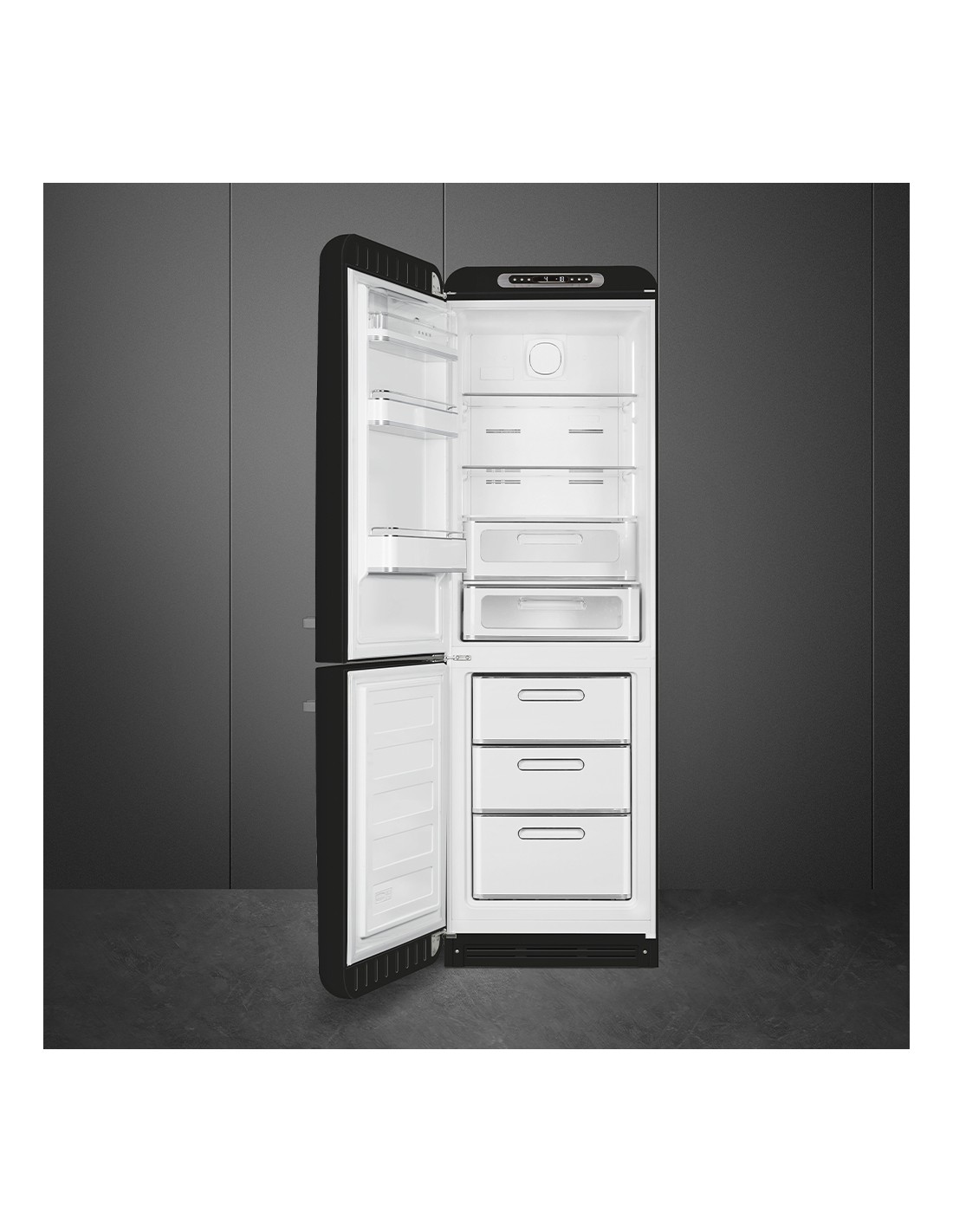 Smeg FAB32LBL6. Capacità netta totale: 234 L. Cerniera porta: Sinistra, Tipo di display: LED. Classe climatica: SN-T, Emissione acustica: 35 dB. Capacità netta frigorifero: 234 L, No Frost (frigorifero), Sistema Multi-Airflow (frigorifero), Luce interna. Capacità netta congelatore: 97 L, Capacità di congelamento: 6 kg/24h, No Frost (congelatore). Compartimento zona fresca. Classe efficienza energetica: D, Consumo energetico annuo: 158 kWh
