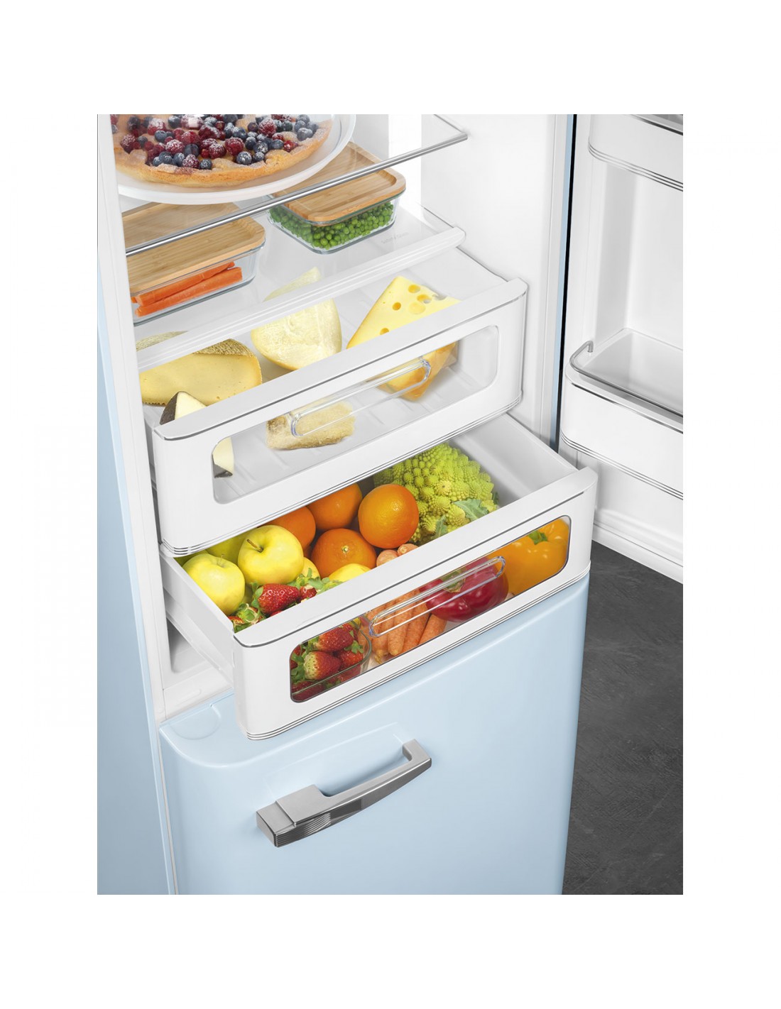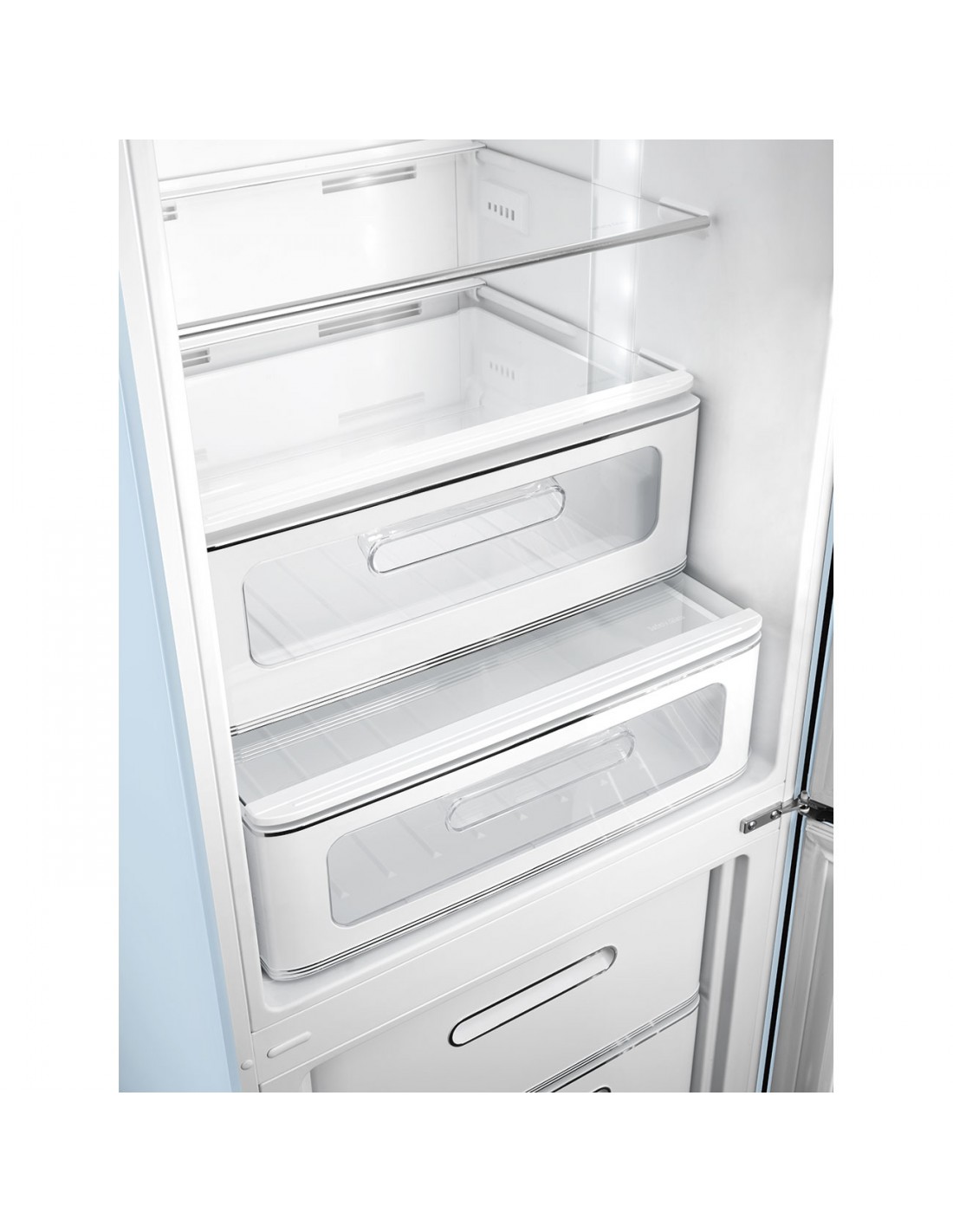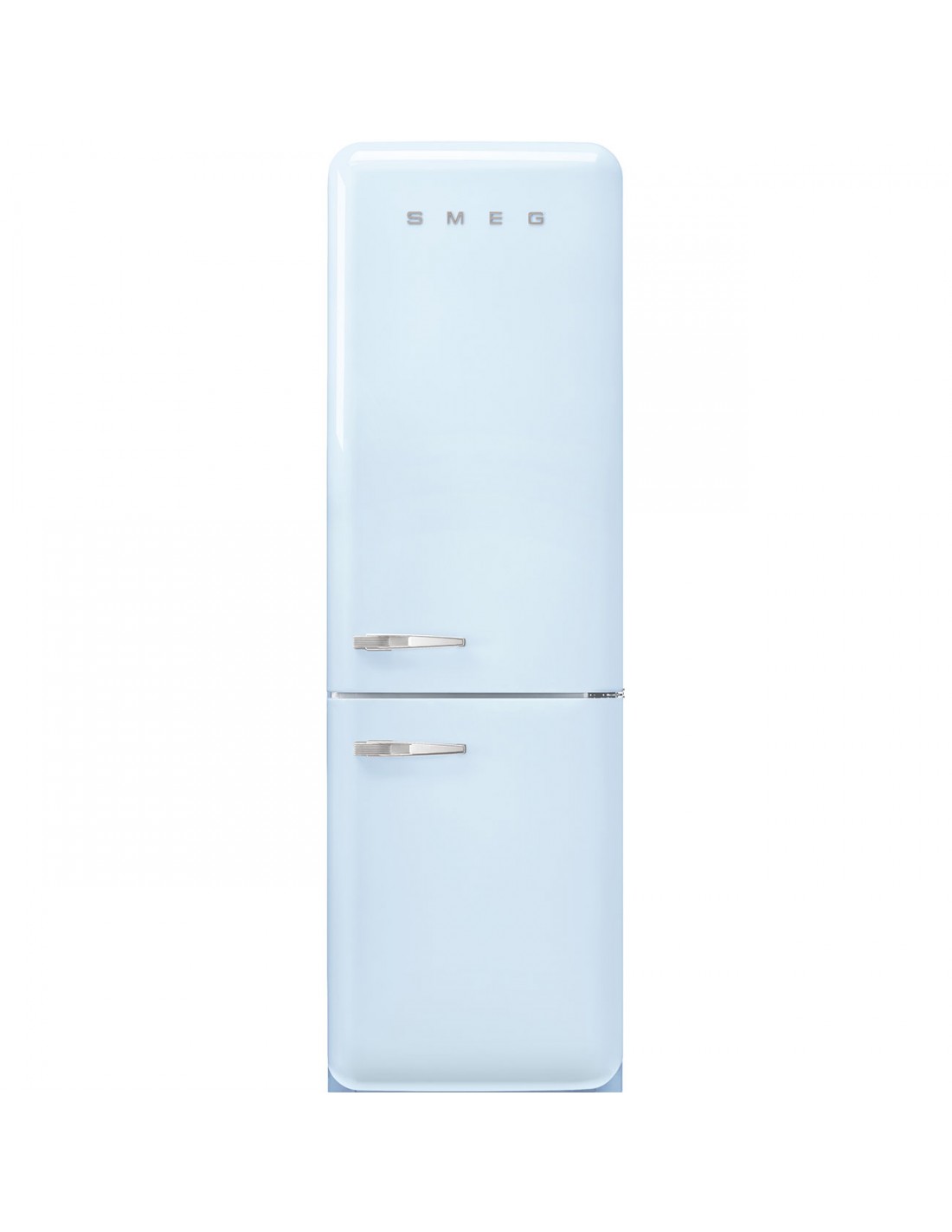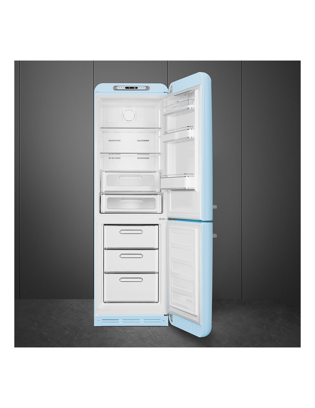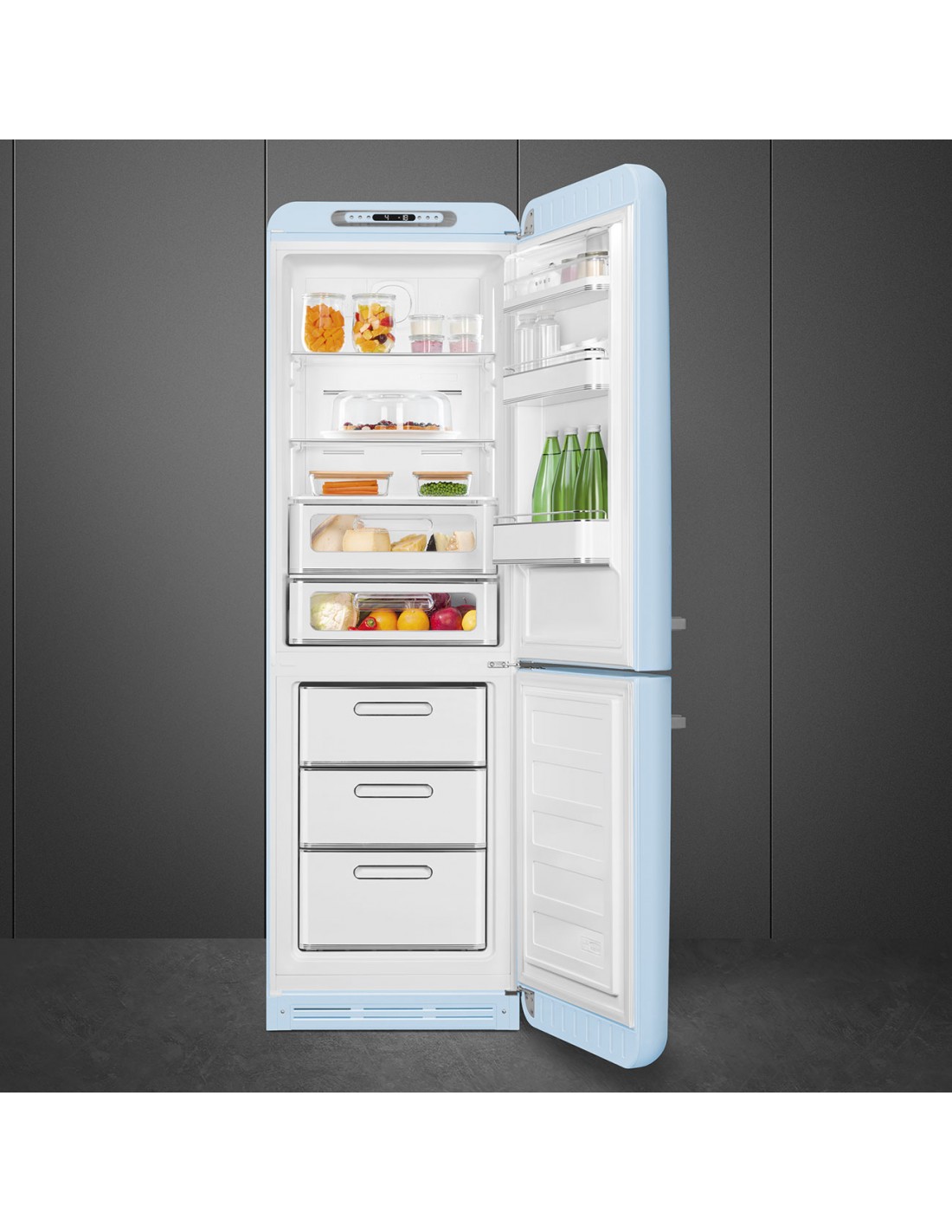 Smeg FAB32RPB6. Capacità netta totale: 234 L. Cerniera porta: Destra, Tipo di display: LED. Classe climatica: SN-T, Emissione acustica: 35 dB. Capacità netta frigorifero: 234 L, No Frost (frigorifero), Sistema Multi-Airflow (frigorifero), Luce interna. Capacità netta congelatore: 97 L, Capacità di congelamento: 6 kg/24h, No Frost (congelatore). Compartimento zona fresca. Classe efficienza energetica: D, Consumo energetico annuo: 158 kWh