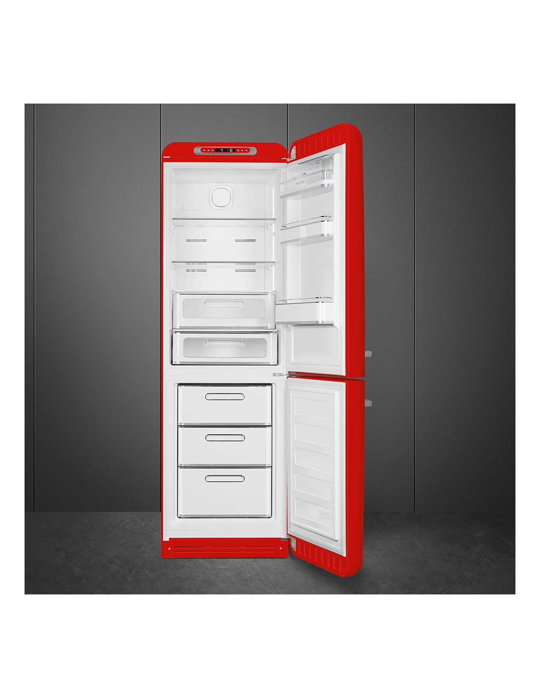 Smeg FAB32RRD6. Capacità netta totale: 234 L. Cerniera porta: Destra, Tipo di display: LED. Classe climatica: SN-T, Emissione acustica: 35 dB. Capacità netta frigorifero: 234 L, No Frost (frigorifero), Sistema Multi-Airflow (frigorifero), Luce interna. Capacità netta congelatore: 97 L, Capacità di congelamento: 6 kg/24h, No Frost (congelatore). Compartimento zona fresca. Classe efficienza energetica: C, Consumo energetico annuo: 158 kWh