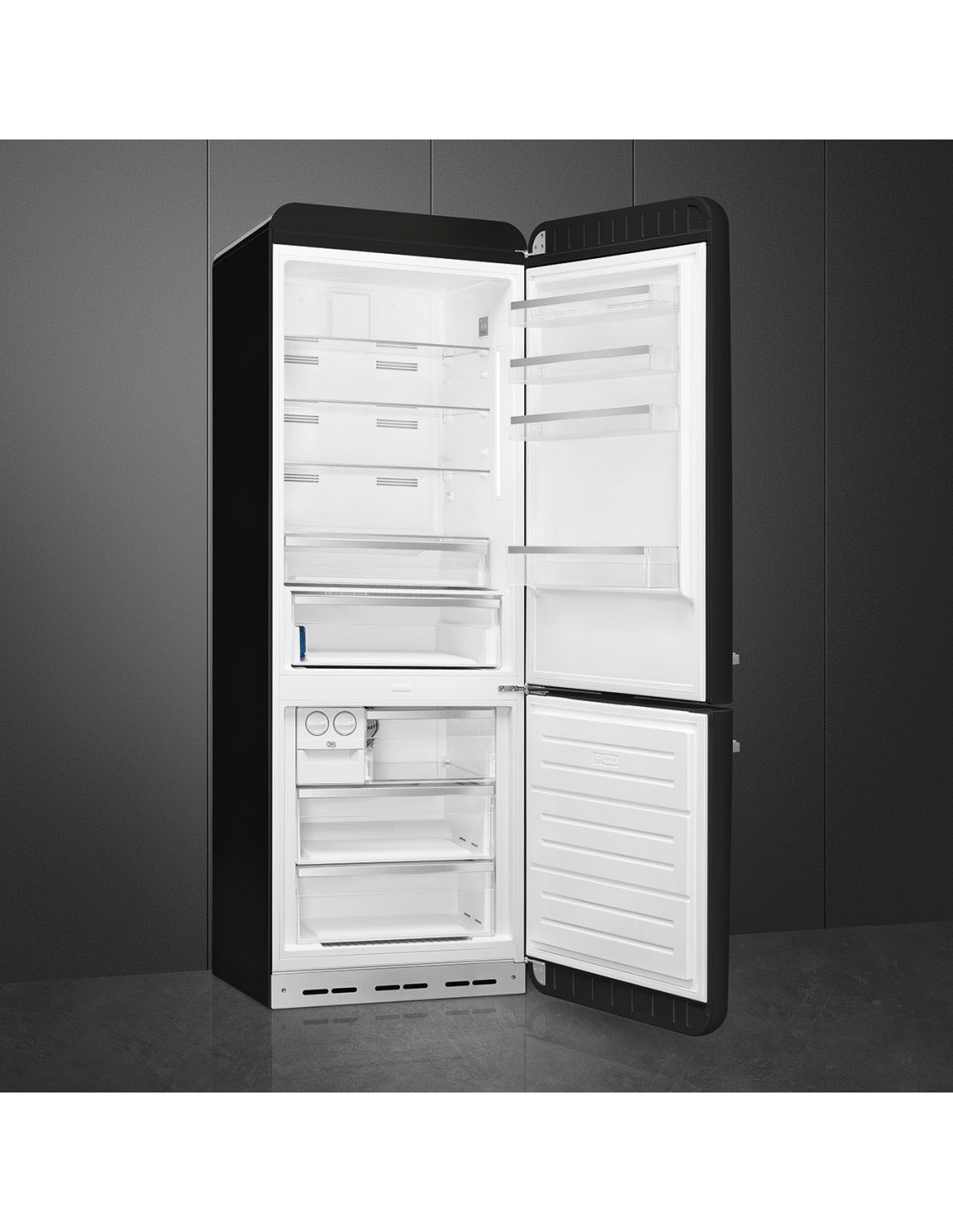Smeg FAB38RBL6. Capacità netta totale: 481 L. Cerniera porta: Destra, Tipo di display: LED. Classe climatica: SN-T, Emissione acustica: 37 dB. Capacità netta frigorifero: 344 L, No Frost (frigorifero), Sistema Multi-Airflow (frigorifero), Luce interna. Capacità netta congelatore: 137,4 L, Capacità di congelamento: 8 kg/24h, No Frost (congelatore). Compartimento zona fresca. Classe efficienza energetica: D, Consumo energetico annuo: 321 kWh