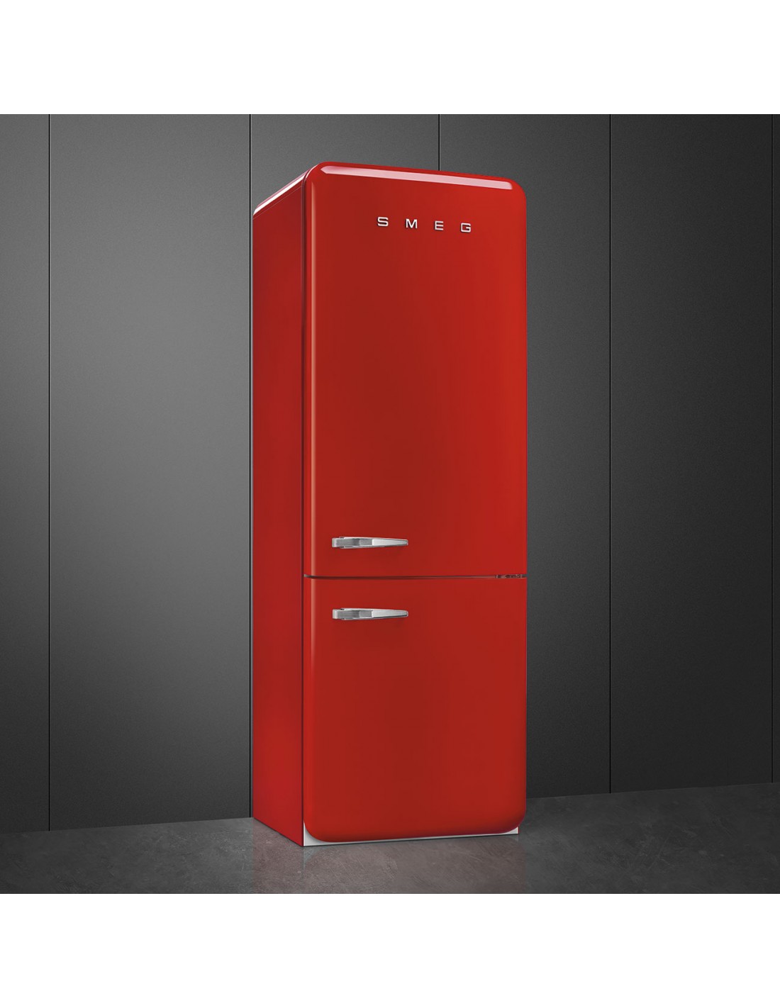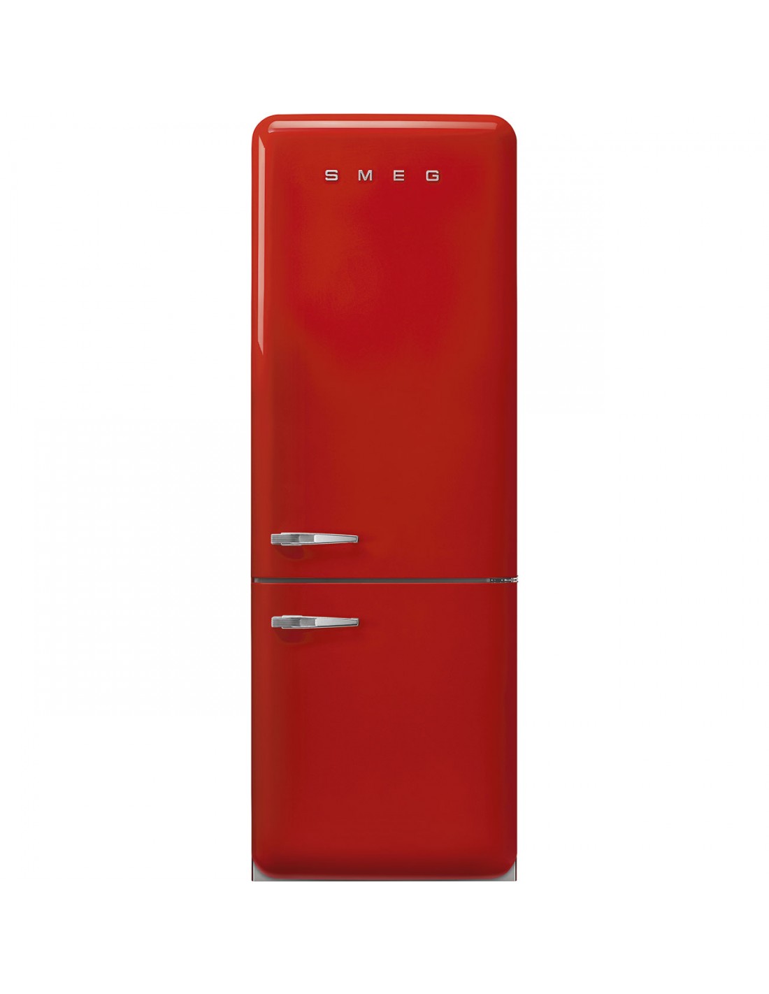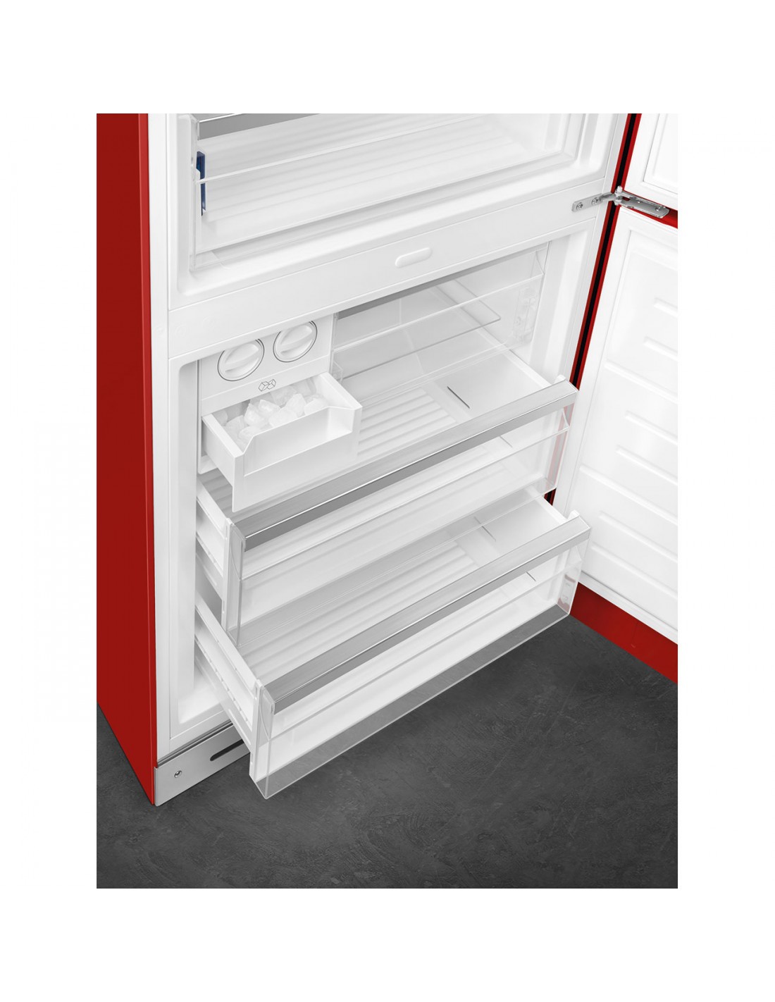 Smeg FAB38RRD6. Capacità netta totale: 481 L. Cerniera porta: Destra, Tipo di display: LED. Classe climatica: SN-T, Emissione acustica: 37 dB. Capacità netta frigorifero: 344 L, No Frost (frigorifero), Sistema Multi-Airflow (frigorifero), Luce interna. Capacità netta congelatore: 137,4 L, Capacità di congelamento: 8 kg/24h, No Frost (congelatore). Compartimento zona fresca. Classe efficienza energetica: D, Consumo energetico annuo: 321 kWh