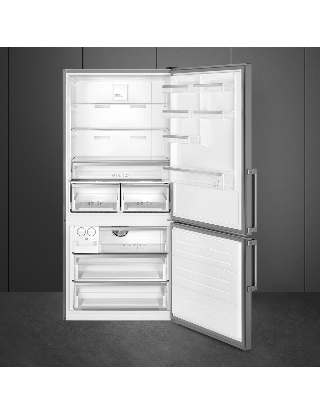 Smeg FC84EN4HX1. Capacità netta totale: 588 L. Cerniera porta: Destra, Tipo di display: LCD. Classe climatica: SN-T, Emissione acustica: 39 dB. Capacità netta frigorifero: 407 L, No Frost (frigorifero), Sistema Multi-Airflow (frigorifero), Luce interna. Capacità netta congelatore: 181 L, Capacità di congelamento: 12 kg/24h, No Frost (congelatore). Classe efficienza energetica: E, Consumo energetico annuo: 326 kWh. Colore del prodotto: Acciaio inox