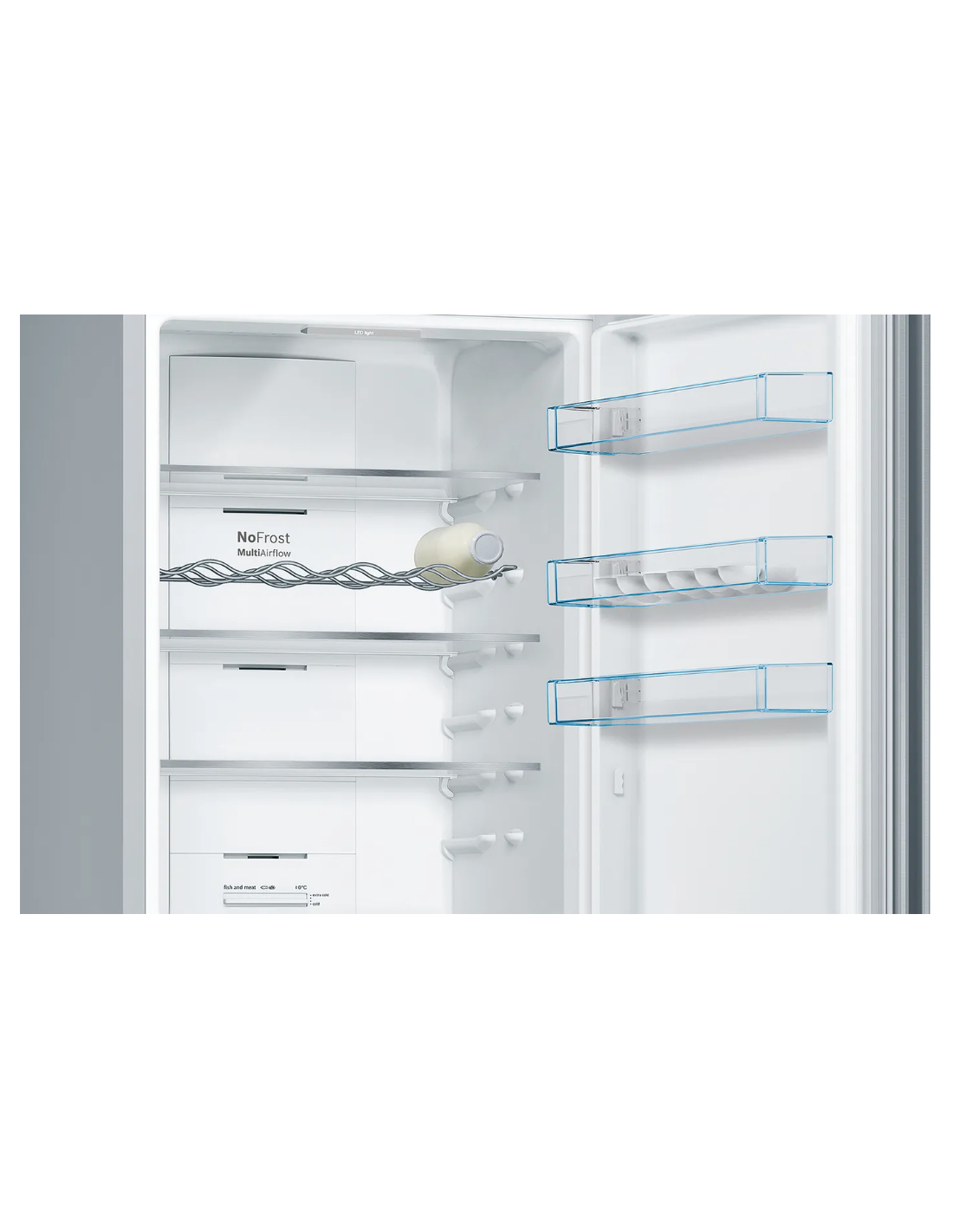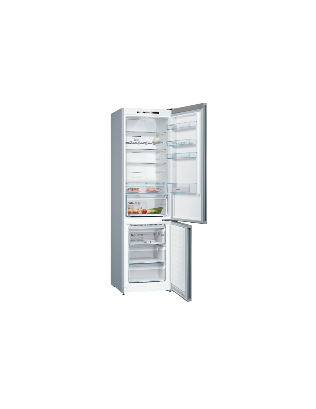 Bosch Serie 4 KGN39VIEB. Capacità netta totale: 368 L. Cerniera porta: Destra, Tipo di display: LED. Classe climatica: SN-T, Emissione acustica: 39 dB. Capacità netta frigorifero: 279 L, No Frost (frigorifero), Luce interna, Numero di ripiani frigorifero: 5. Capacità netta congelatore: 89 L, No Frost (congelatore). Compartimento zona fresca. Classe efficienza energetica: E, Consumo energetico annuo: 238 kWh. Colore del prodotto: Acciaio inox